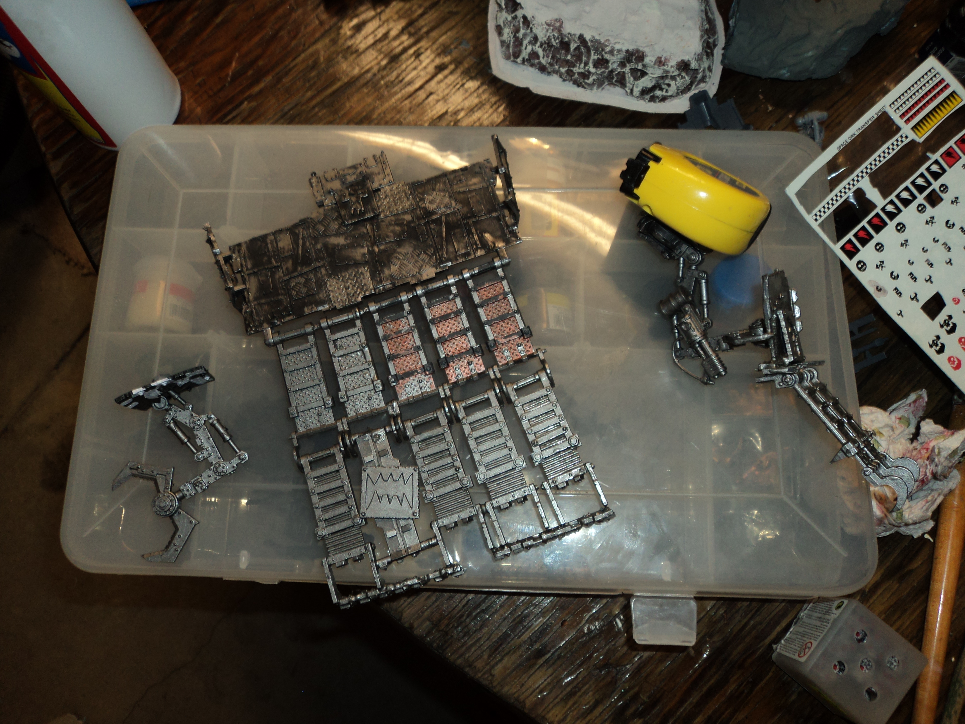 Okay, I got my next platforming door built, and a slew of other bits I wanna throw some colors on. Heres a shot of whats in the painting que including: the dreaded waagh banner, a mess of tires, grabba klaw, and the level 3 Nob boarding hatch!