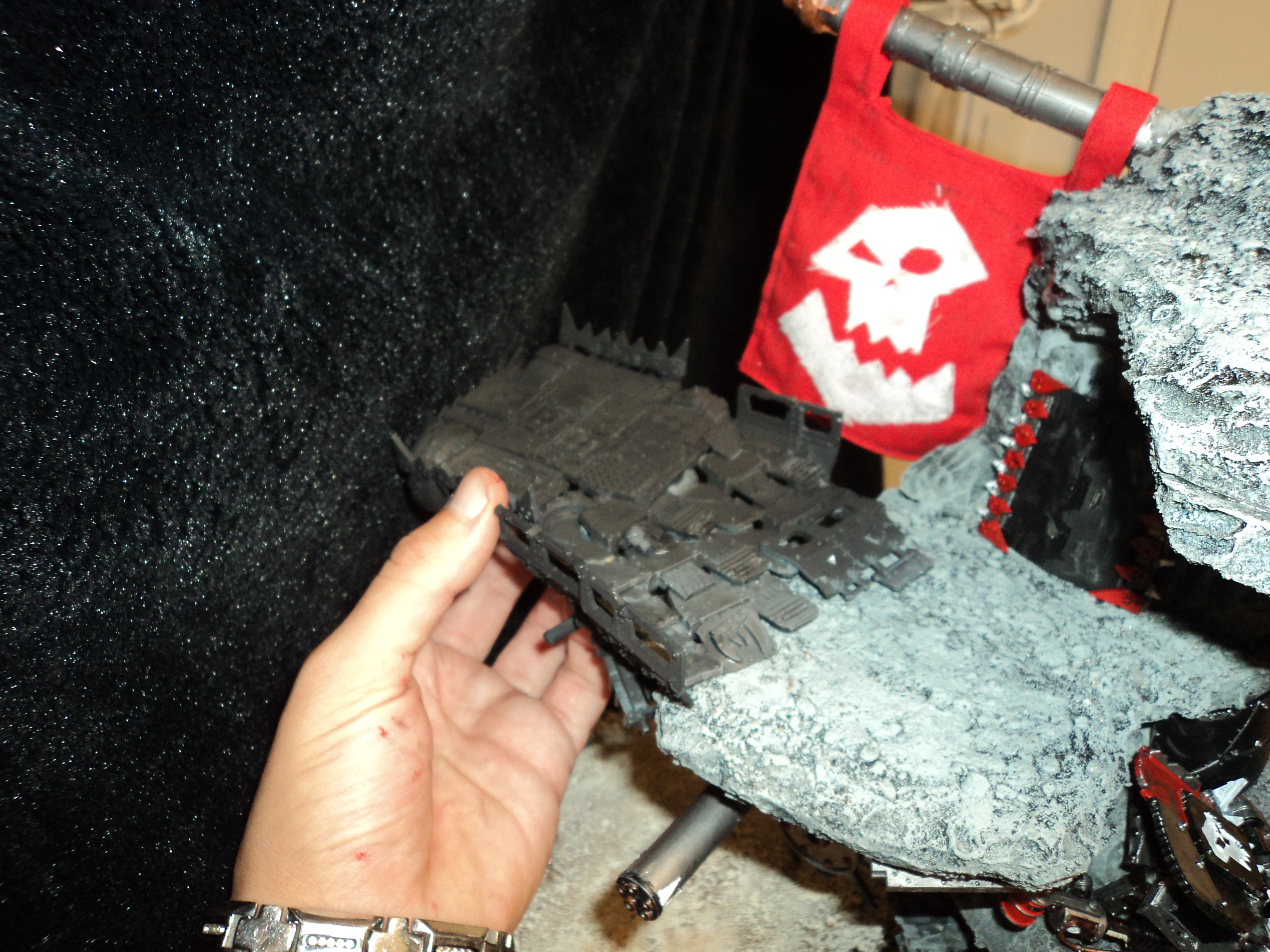 I'm working on a few bits right now. Well, alot of bits actually. The side with the flag is about to get a lil attention. Don't worry! I definitely have a gameplan for getting this thing equally equipped. Logically, even by orks, the flag side would be the front while drifting through space, while the side with the garage and scaffold would be the rear, yet a more logical deployment front post-landing (well, defensively while travelling through the cosmos too)