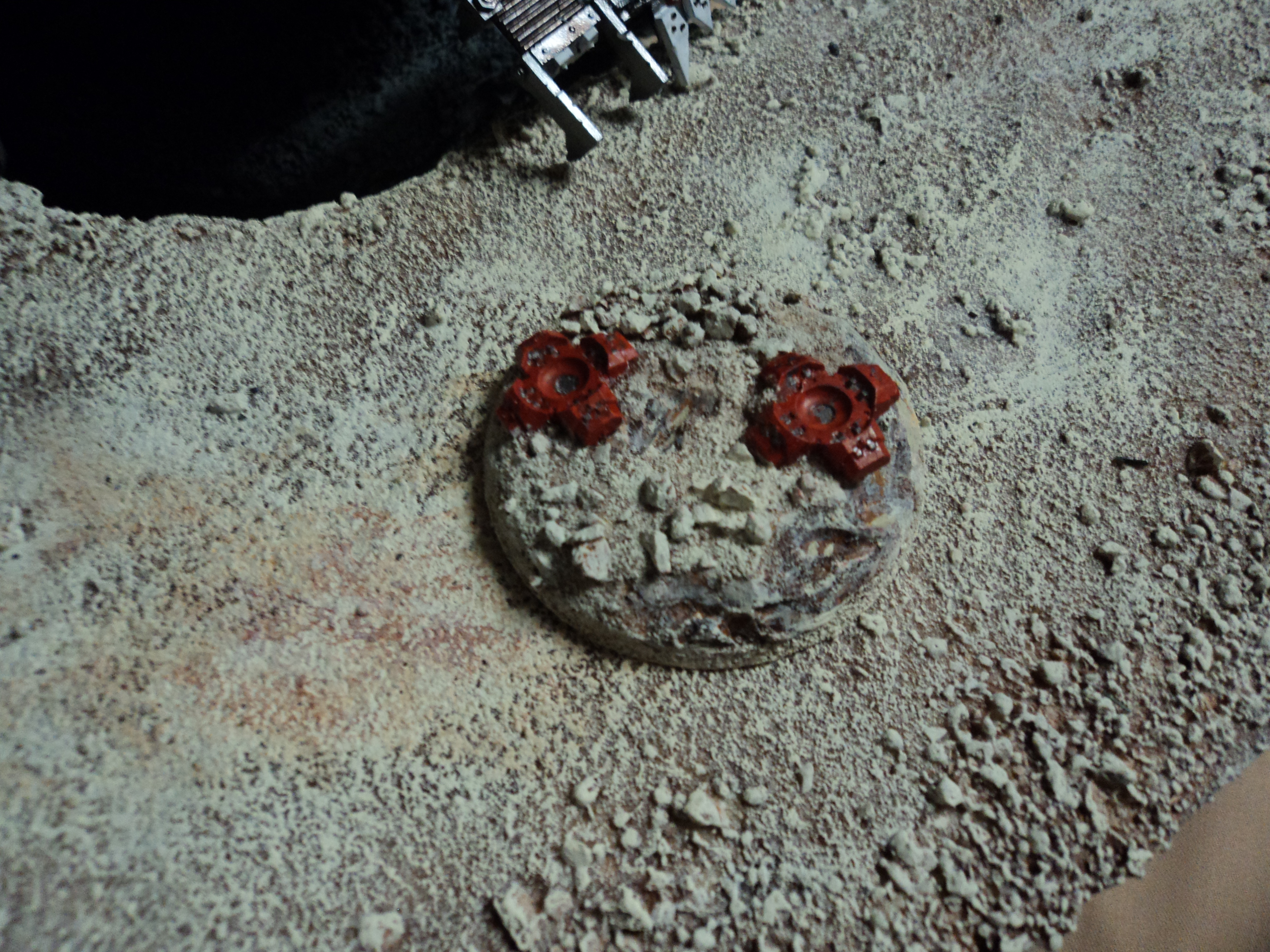 Ruined Manufactorum: On a base, the natural slopes and rock formation in the rear provide almost 270 degrees of cover. Notice the burrowed hole ontop of the rear plateau. Expect to see something alien or tradegic appearing there!