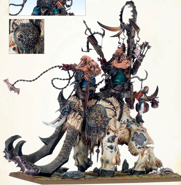 Great Mammox with three ogre crew and plastic tyrant option (Same base as Arachnarock. Imagine a cross between a musk ox and a Mammoth)