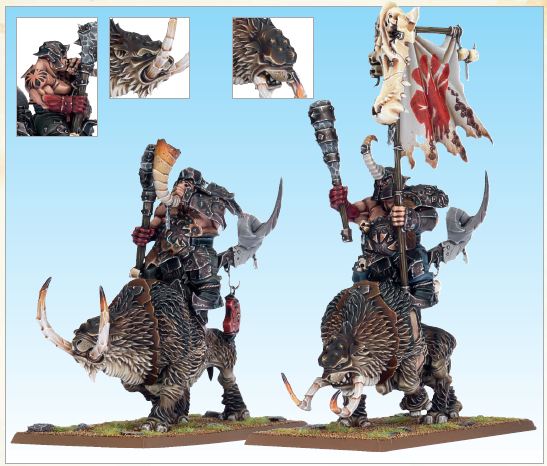 Hunter? Beast? - This looks like a variation of the Stonehorn, but unfortunately swaps out all of the best bits and replaces them with less inspiring design. It's not bad per se but it is much less naturalistic-looking. Why does it have two sets of tusks? Why does the larger set appear to be made out of hair at the top? Did they just bolt armour to the monsters enormous earlocks in an attempt to make some kind of super-Hasidic battering ram? The hunters have a nice set of tools and gadgets and trophies as one would think apropriate and I appreciate the attempt to try and put some reins on this guy to offset bizarre riding hump physics. The man-mammaries on the driver though are really unforgivable, and I have a sneaking suspicion that if I got a closer look at either face I would be disappointed. I applaud GW trying to put some character in the ogre faces, but these guys almost look cartoony. And they can go cartoony if they want, but mixing cartoony fat dudes with OMG OGRES EAT YOUR FACE in the same model just doesn't work. - B-