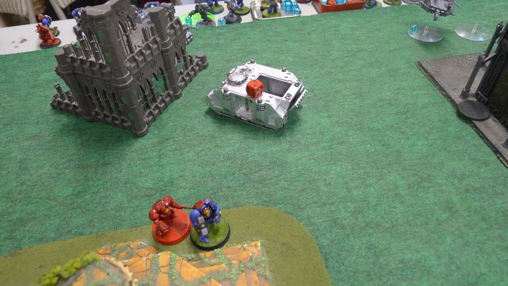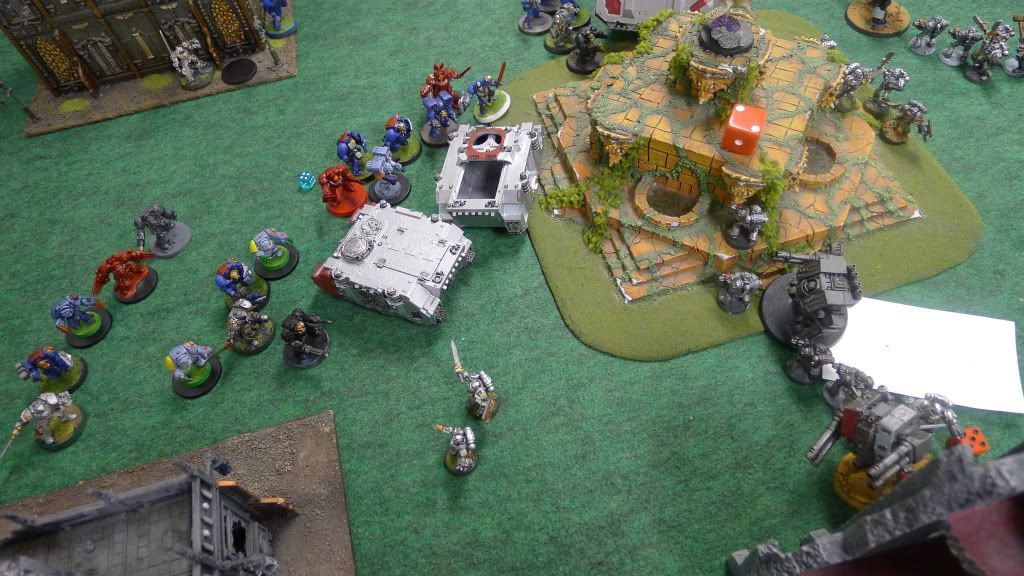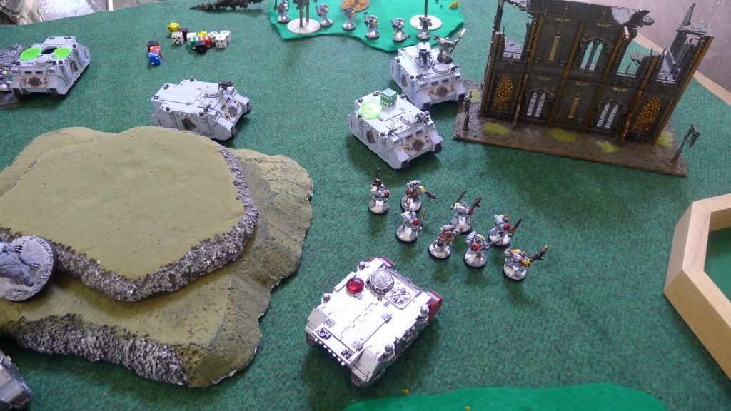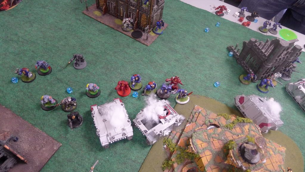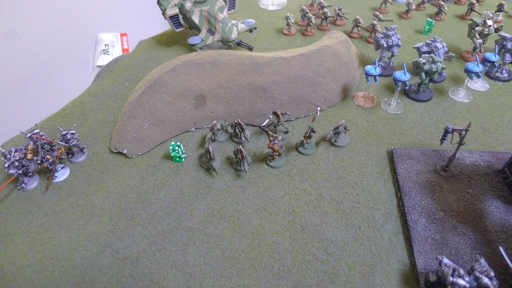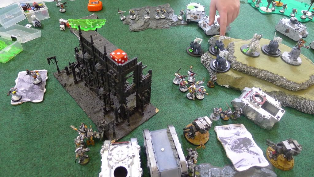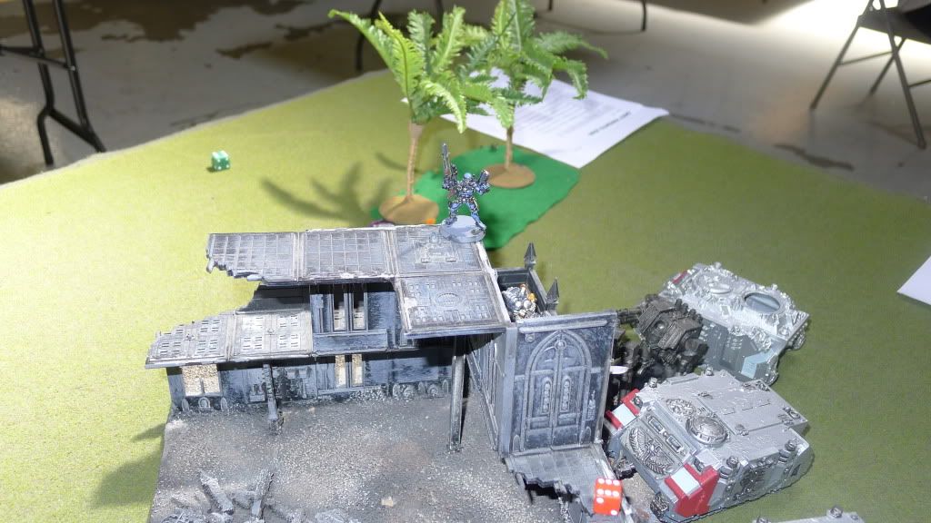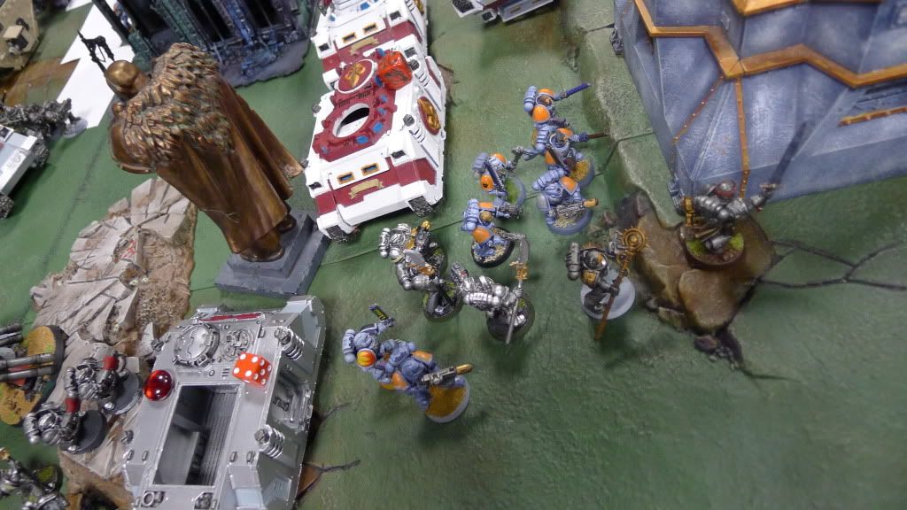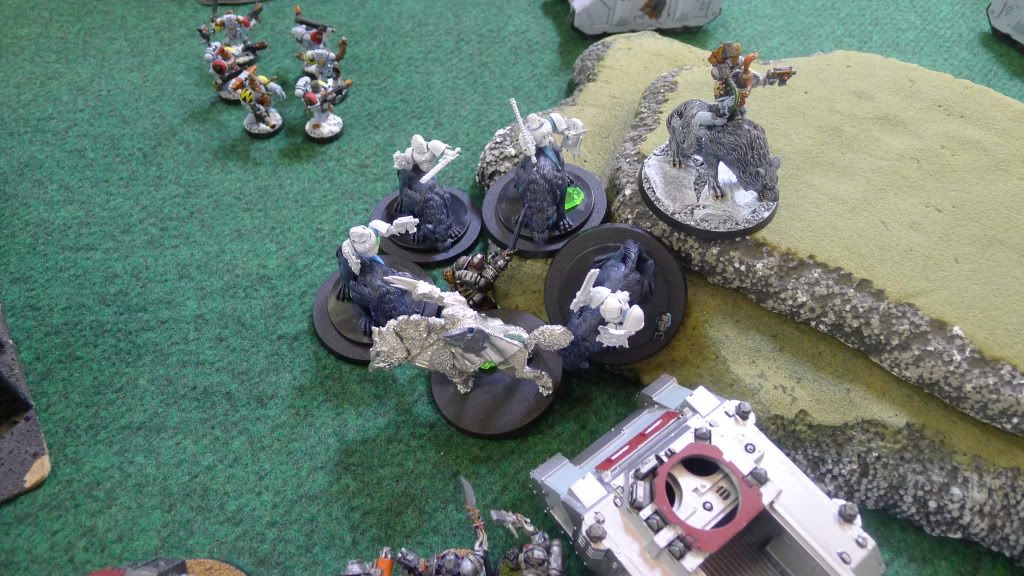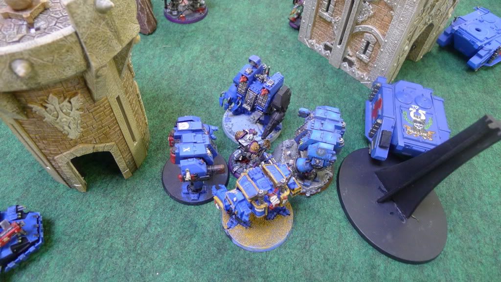 3) I like his gundam /winged DK conversions. But why, oh why, didn't those have the Teleporter packs? That would have been much better. He could have either come one normally, running to nearly keep up with the SRs, or shunted, to be right there, guaranteed, end of his turn 1. That's pressure. You're gonna be thinking a lot harder about dedicating all fire at the SRs with those guys in your face. Or he could have Deep struck as he did, and just bee much more mobile. Probably would have shunted, myself.