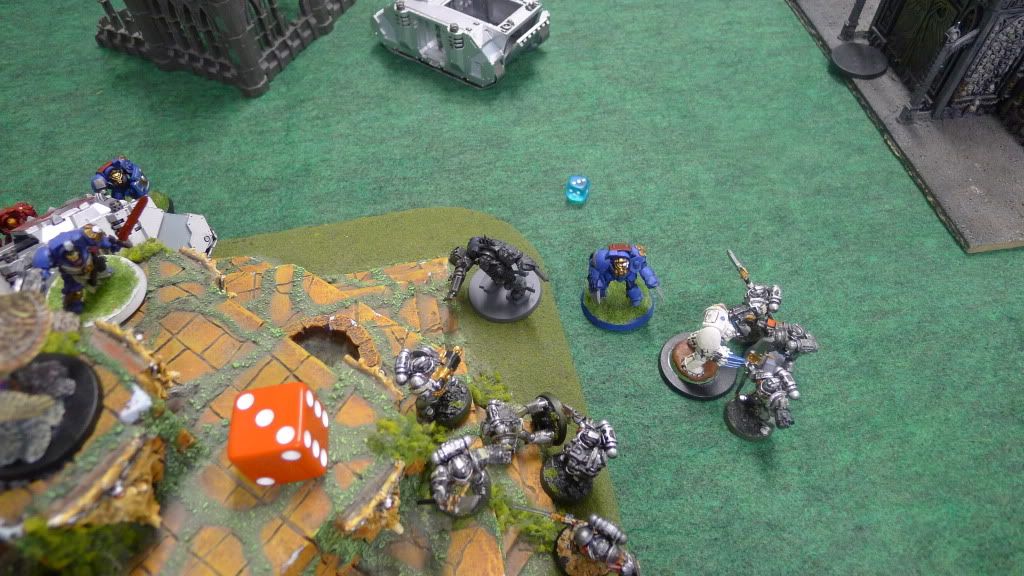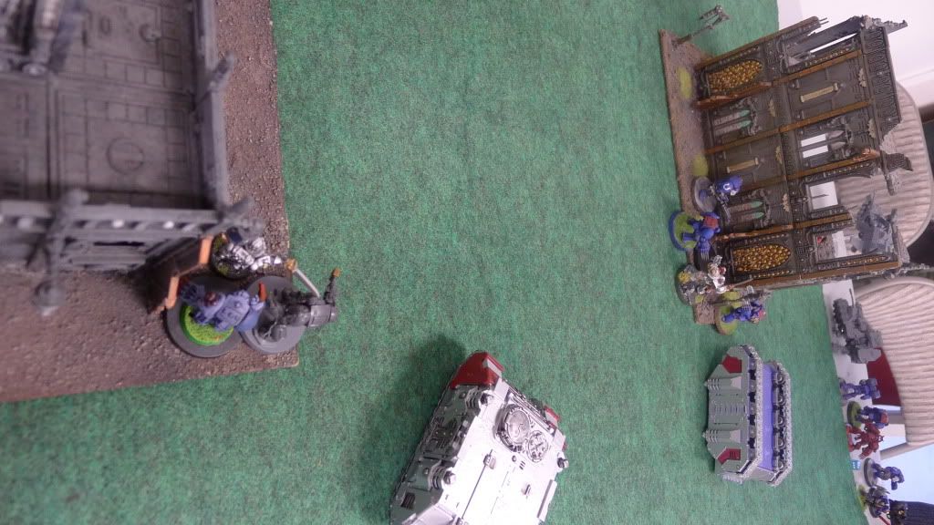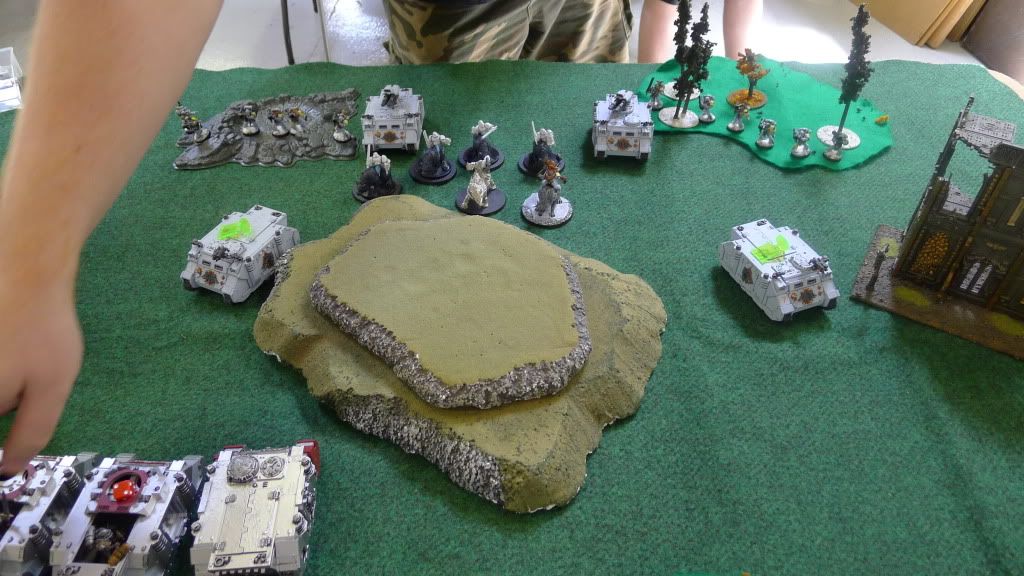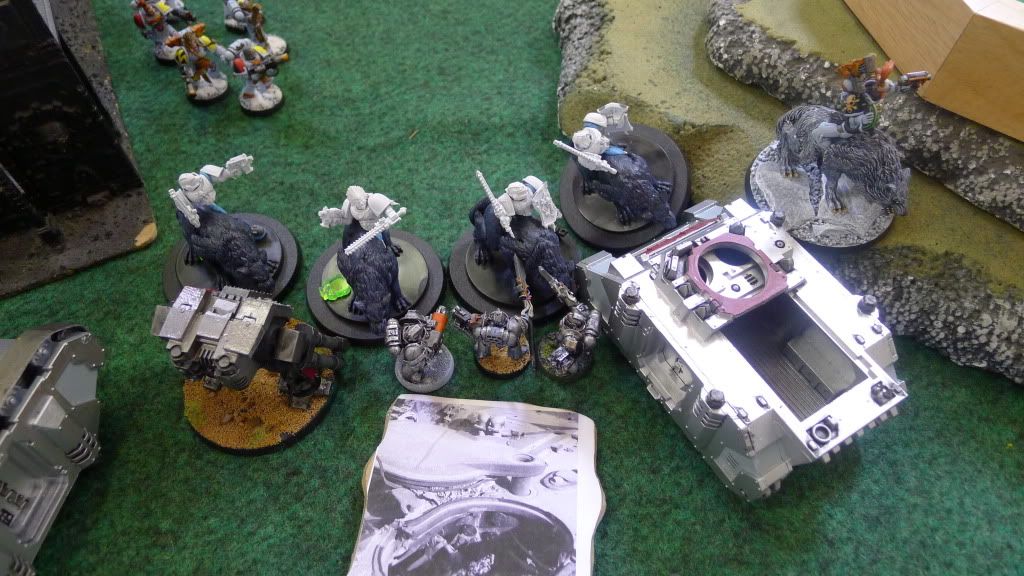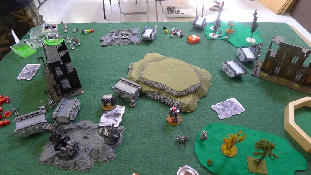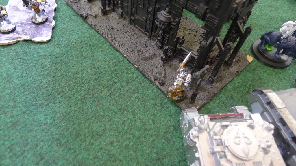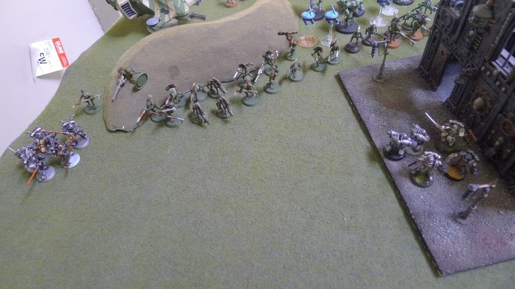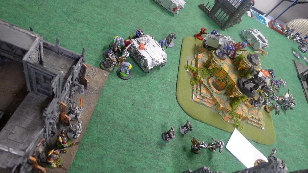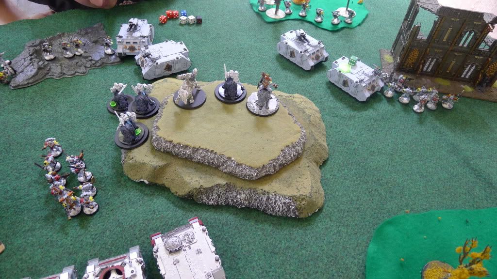 3) I like his gundam /winged DK conversions. But why, oh why, didn't those have the Teleporter packs? That would have been much better. He could have either come one normally, running to nearly keep up with the SRs, or shunted, to be right there, guaranteed, end of his turn 1. That's pressure. You're gonna be thinking a lot harder about dedicating all fire at the SRs with those guys in your face. Or he could have Deep struck as he did, and just bee much more mobile. Probably would have shunted, myself.