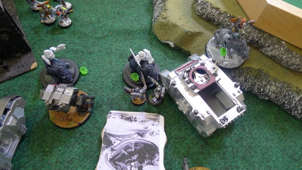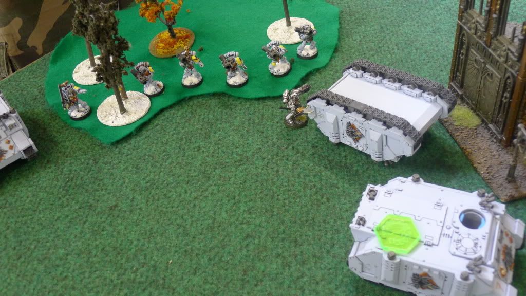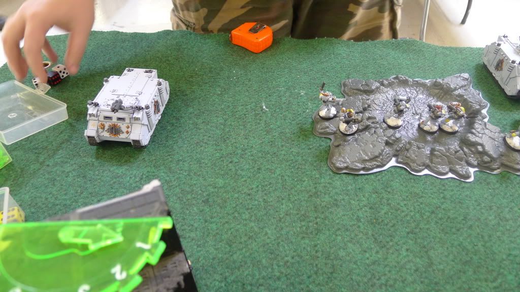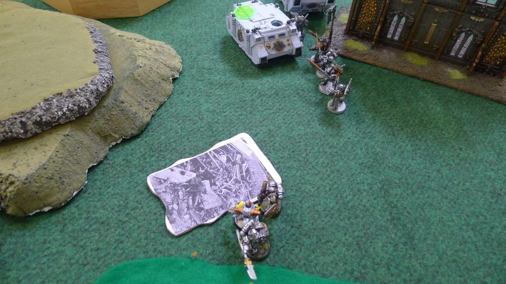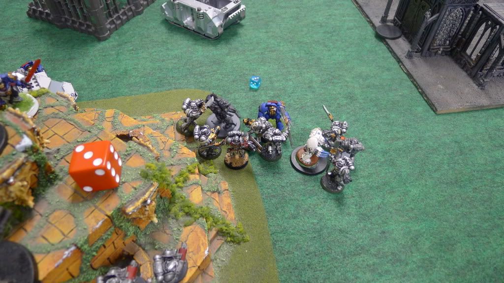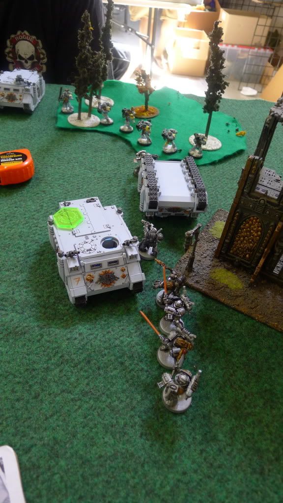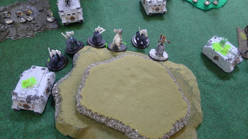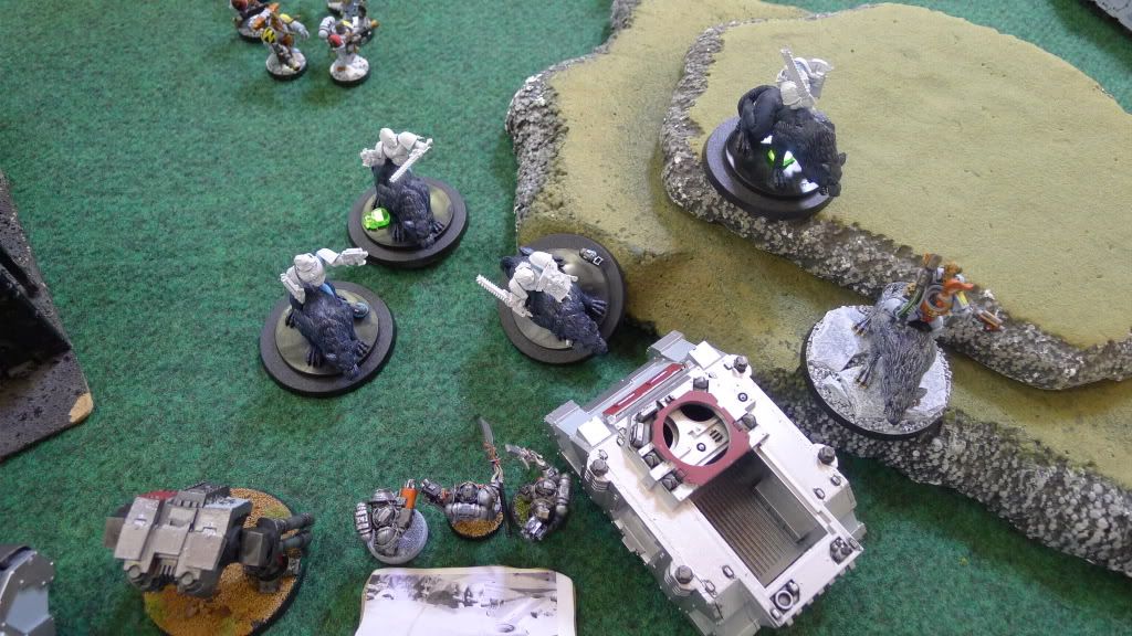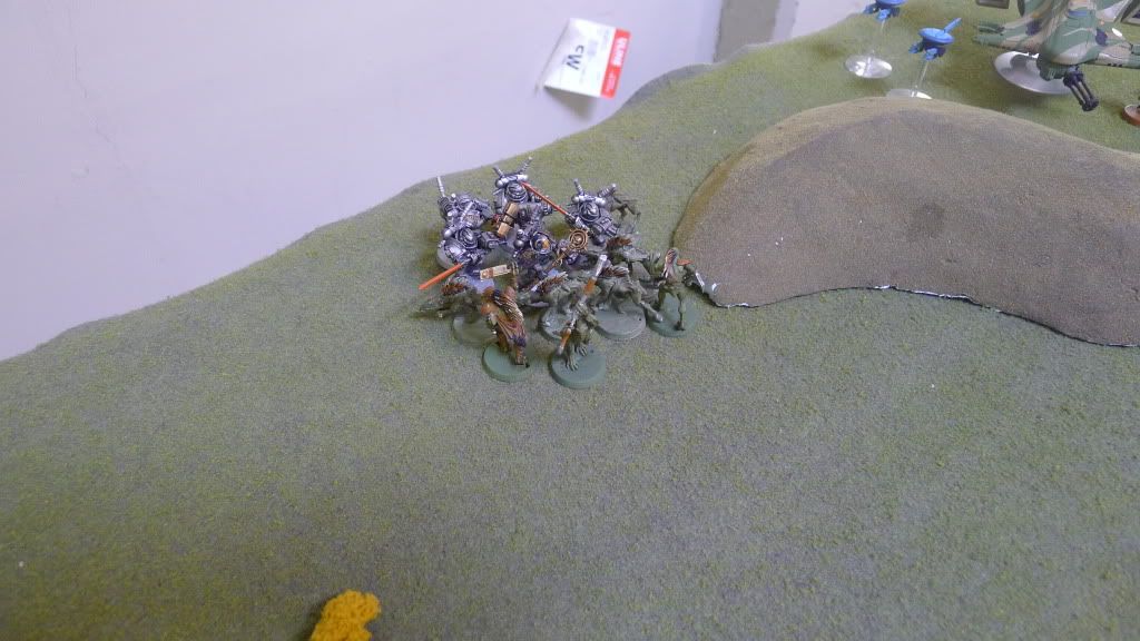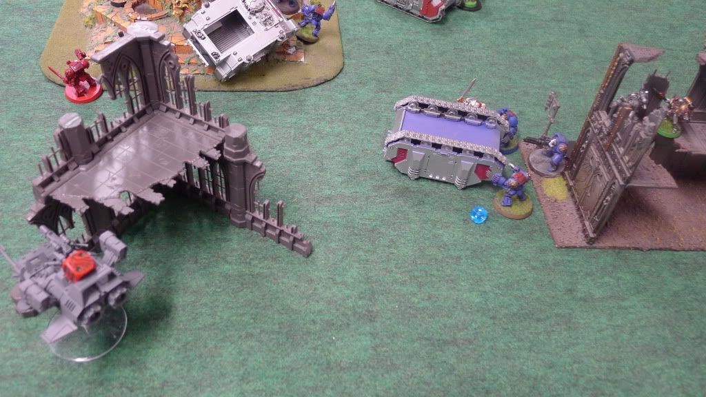 3) I like his gundam /winged DK conversions. But why, oh why, didn't those have the Teleporter packs? That would have been much better. He could have either come one normally, running to nearly keep up with the SRs, or shunted, to be right there, guaranteed, end of his turn 1. That's pressure. You're gonna be thinking a lot harder about dedicating all fire at the SRs with those guys in your face. Or he could have Deep struck as he did, and just bee much more mobile. Probably would have shunted, myself.