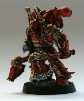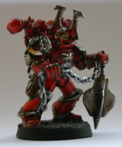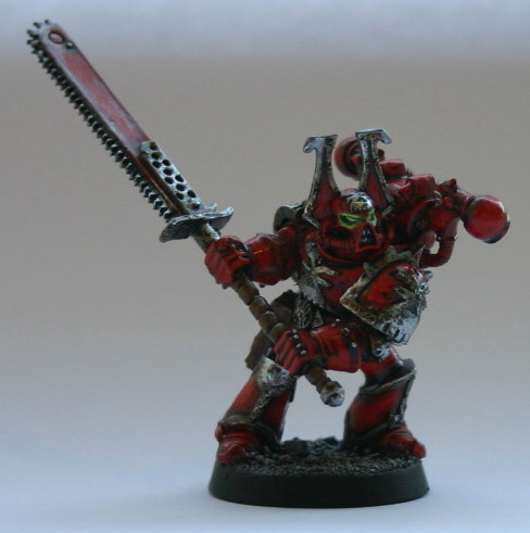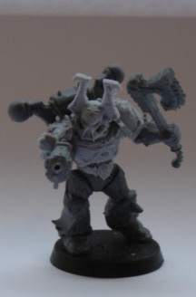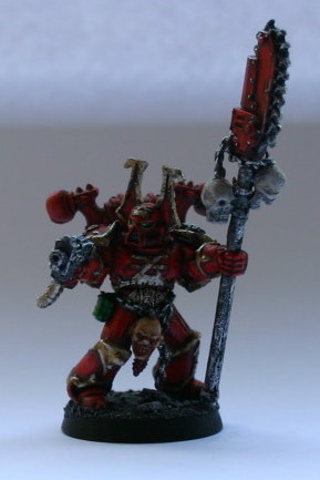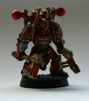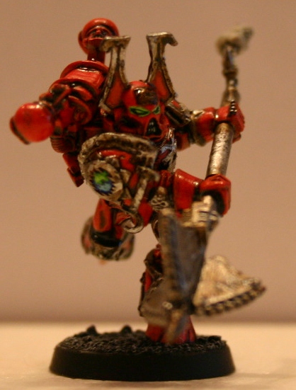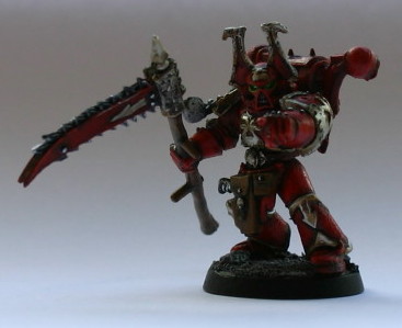Cheers Stevey, and yes, it's just two chain axes cobbled together into one. And now for my latest offering. I must admit I'm quite pleased how this one turned out. Used possessed legs with a bit of green stuff to fill in some of the details so the model didn't look too out of place compared to the others. I must admit, whilst I like the CSM models, GW could do with producing some more arms and legs in more dynamic poses. I don't like the ones that come with the standard Bezerkers where they are running - they just don't look right. Anyway, here we are: