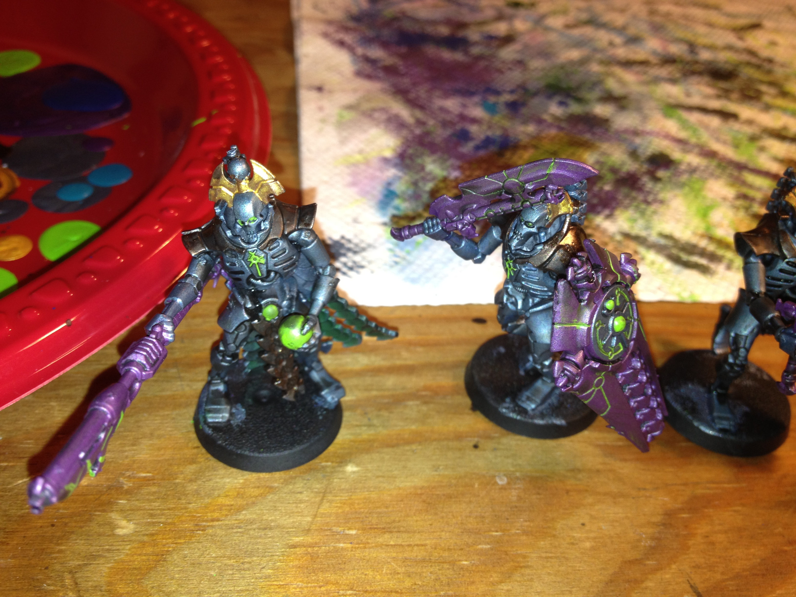 Base Coat Necron Weapons - 3 Parts Lich Purple/2 Parts Boltgun Metal. I mix this by pouring boltgun into a new bottle of lich purple. Again it's messy but it works well and you have a lot of this to use.
