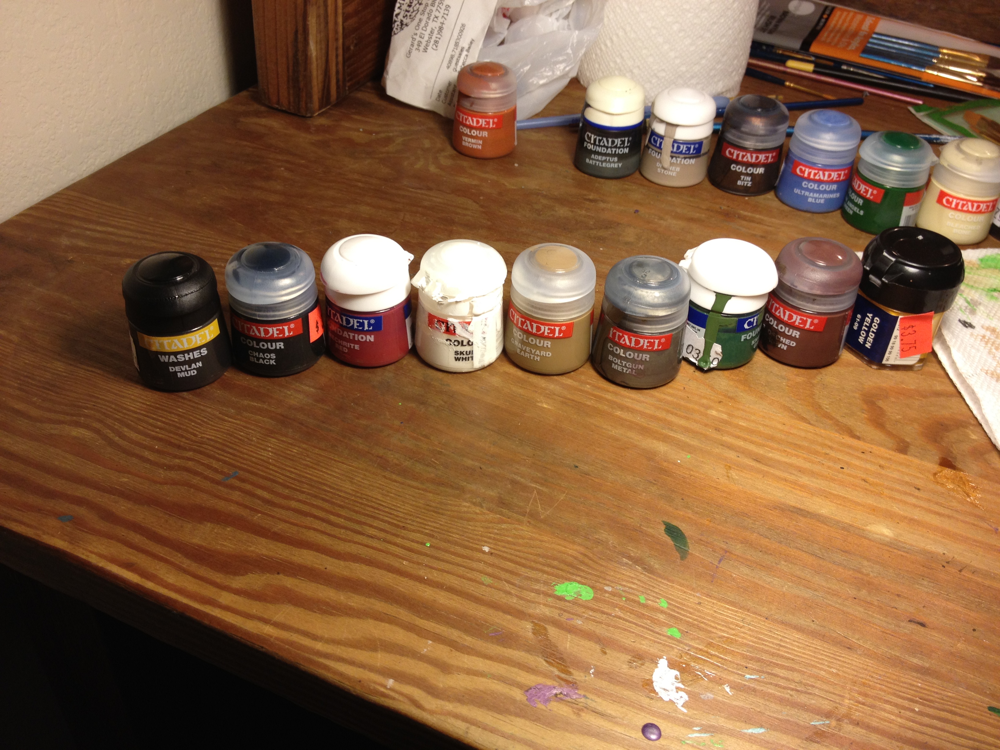 Gold - first layer is a 1 part burnished gold, 1 part scortched earth. 2nd coat is burnished gold. Easy way to do gold