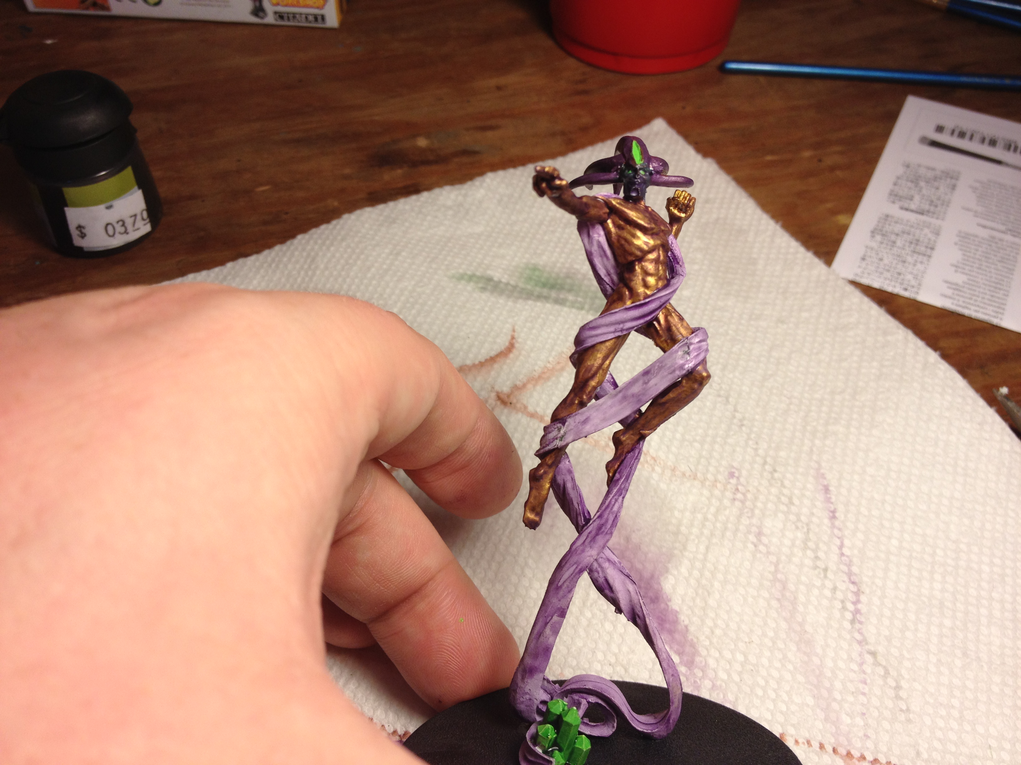 Weapons should also use a heavy layer of the wash. Make sure you don't get too much on details, use a clean brush to brush away stuff on top of details so that the Scorpion Green and Hawk Blue don't get dulled out.
