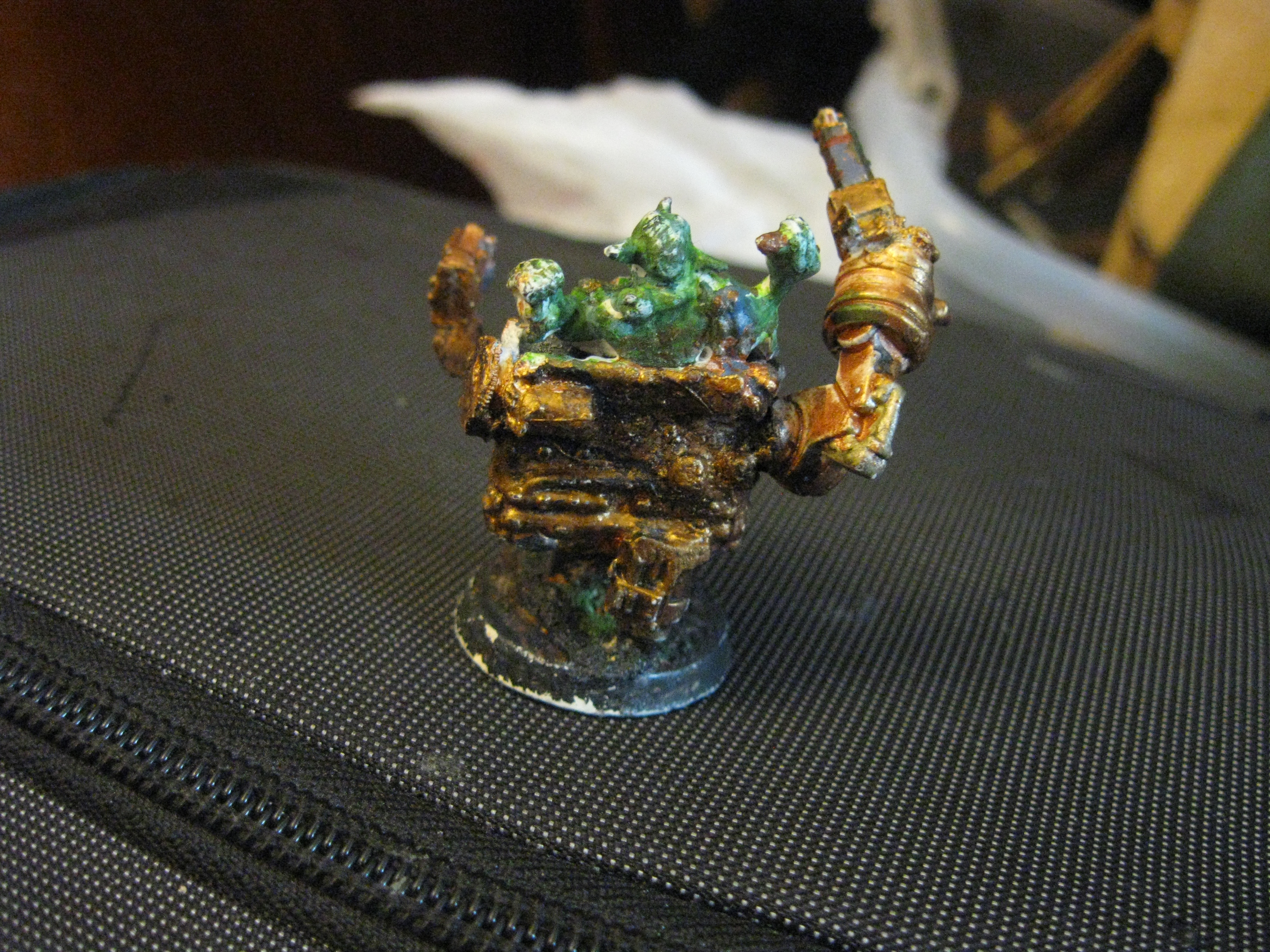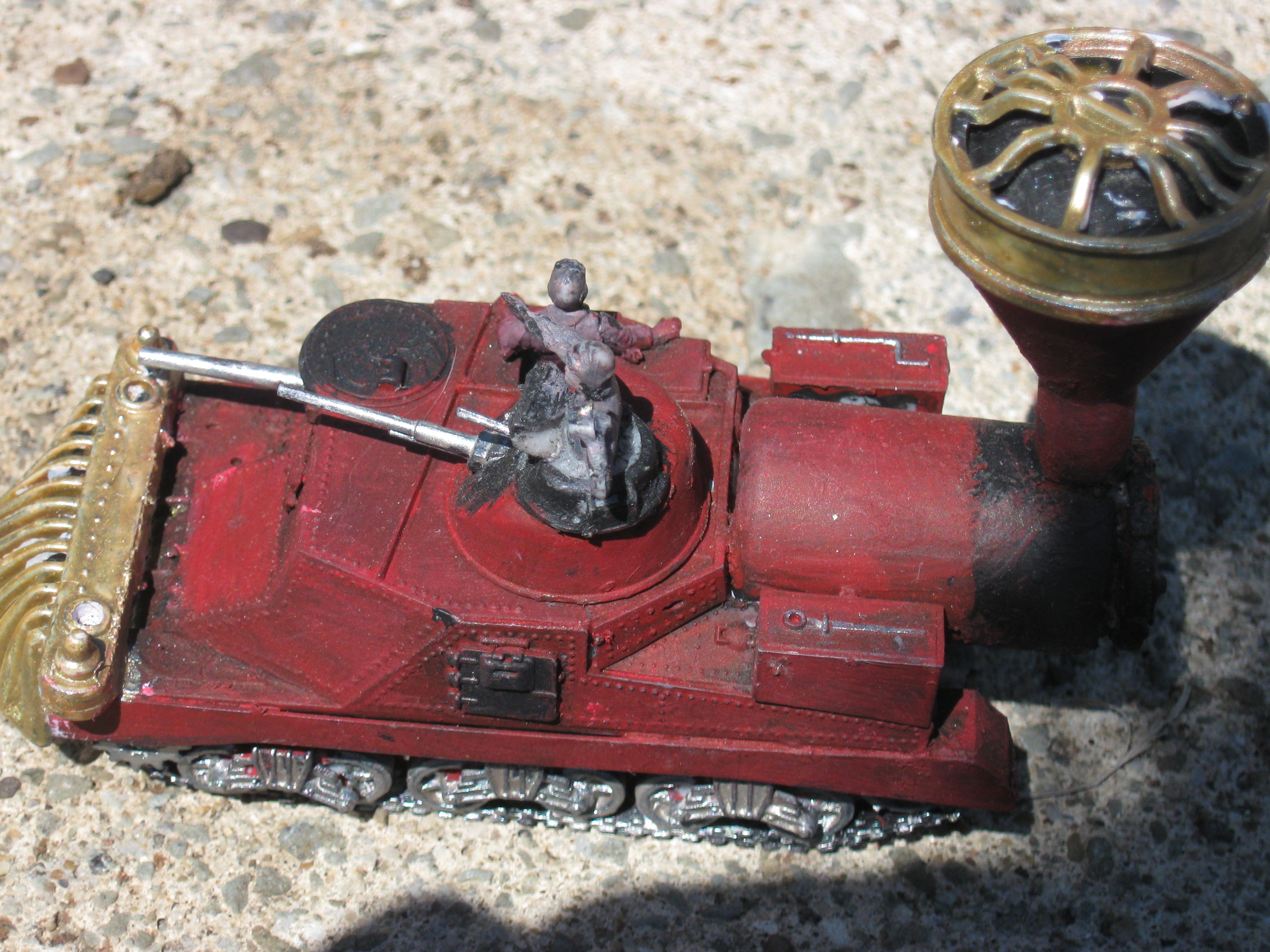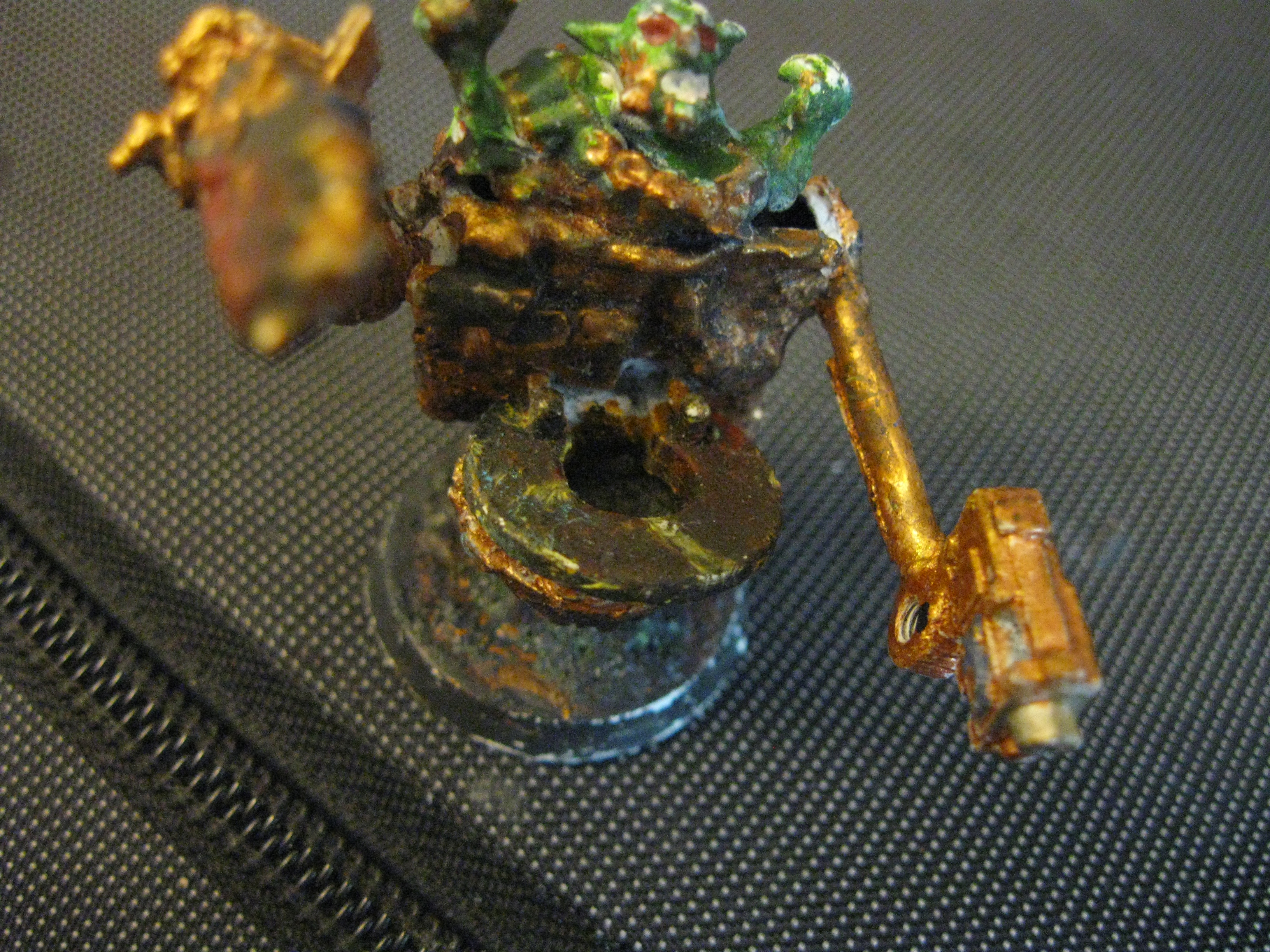 Thanks for the support, vik! Not sure if i would want to remove the rivets: I am pretty much done, now (after i took the picture), and i don't have much else to use (though if i find some small beads or something, I will replace the current rivets with those.) Maybe I won't paint it until i can find some decent rivets Anyway, as for the parts I used; I'm not sure if I know all of the parts that I used. I'll try: you were mostly right about the torch (booklight, to be exact), connected to bit from' an ork wrekkin ball, which in turn is connected to a flint gear (?) from a cigarette lighter (I don't smoke, I just pick up the metal trash of those who do), which is connected to a cylindrical bit of unknown origin (and a piston made from non-gw sprue), which is then, finally, connected to a cut up ork power klaw. The body is made out of a paint pot, with styrene posing for wood (i'll probably paint it metal, because the grain has been covered in superglue). The "face" is a clock face, with chaos spikes for hands, and a gear on top, with two lights for eyes (one is from a missile launcher, the other is from some military model kit.) I riveted the black part of the paint pot in the style that i would like to you se for the whole thing (cutting 3mm beads in half, then gluing them on), but I can't find enough beads (probably lost in the warpstorm in my room ) the hatch is from a rhino, and the guy on top is from the vintage miniatures bin at my flgs (75 cents!!!). he originally had a gun, but i cut it off, and used a toothpick for the pointing finger (I cut it shorter since the pic, so that he didn't look like he had a footlong cuban cigar ) i have no clue what the smokestack is, but i think it might have been from some sort of pen. the gears on the back are just that, from old watches. The other arm is from a mechwarrior mech, as are the legs. the rivet gun, however, is made from some vcr (?) part, probably from a button, and the tip is a piece of aluminum tube. the loincloth looking thing is from the chaos vehicle sprue, and the girder that he is stepping on is a piece of sprue.
