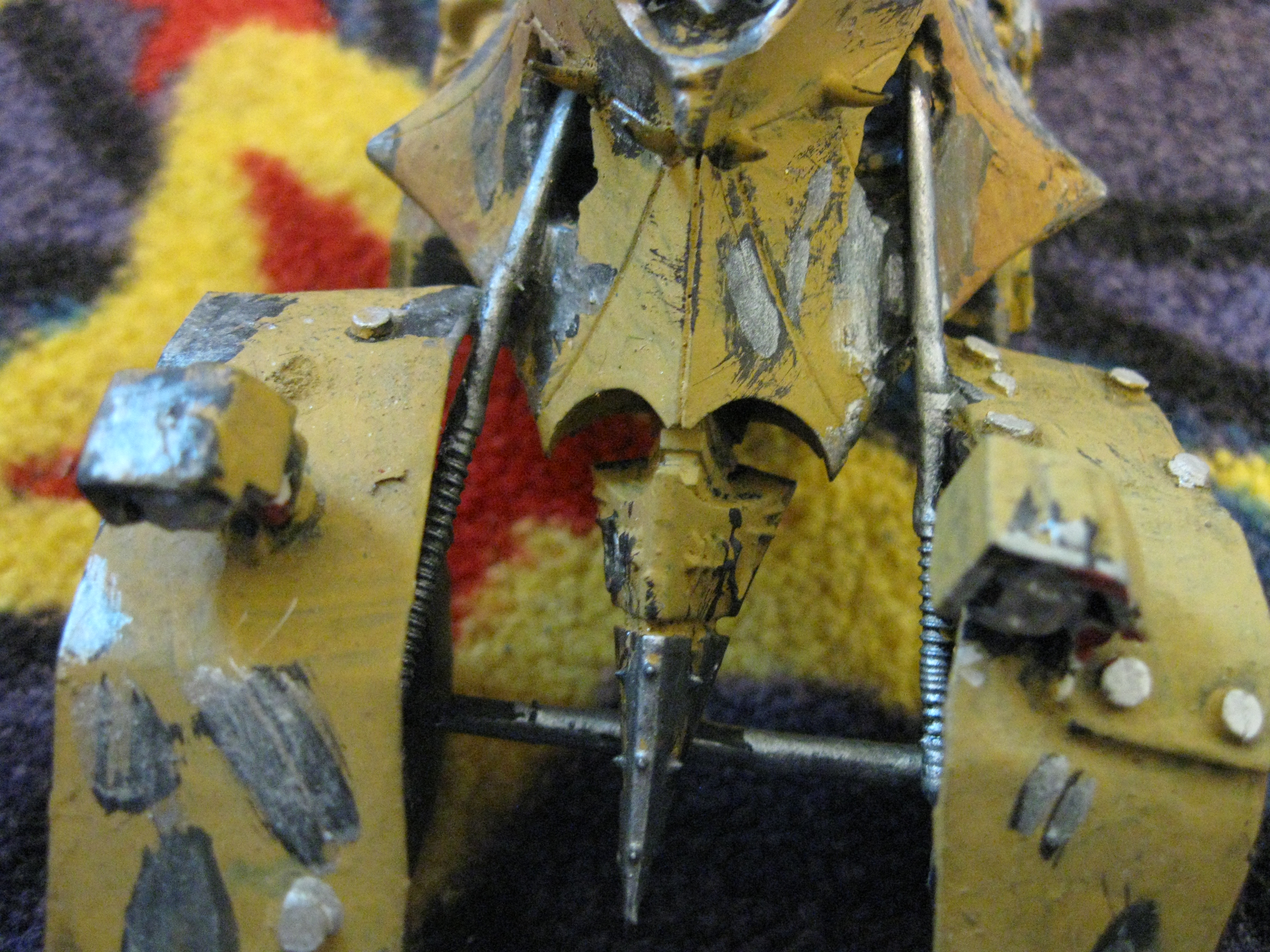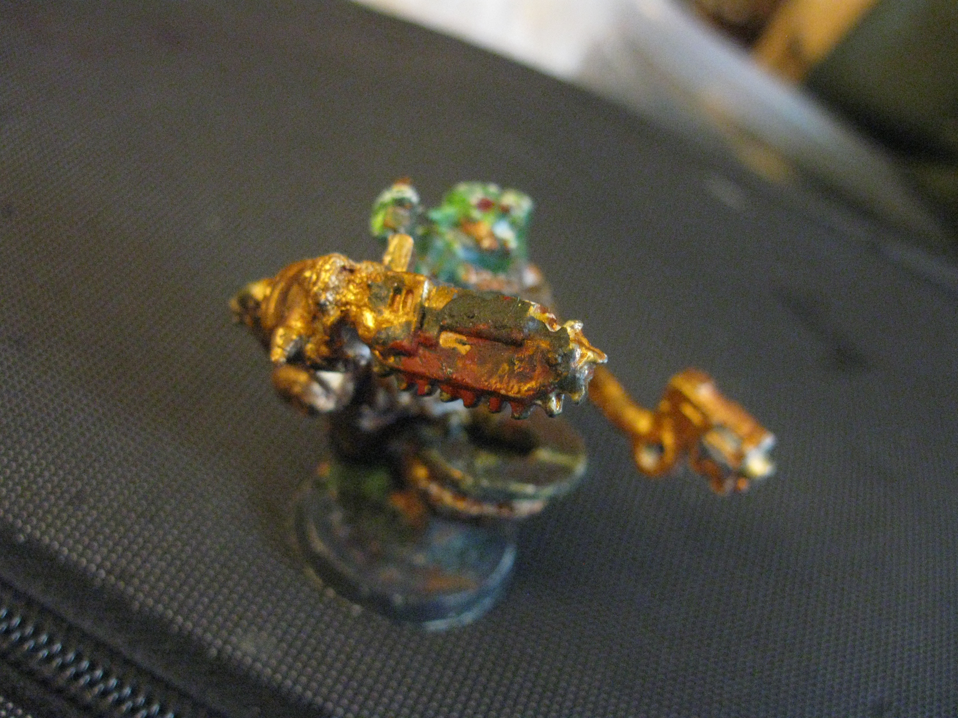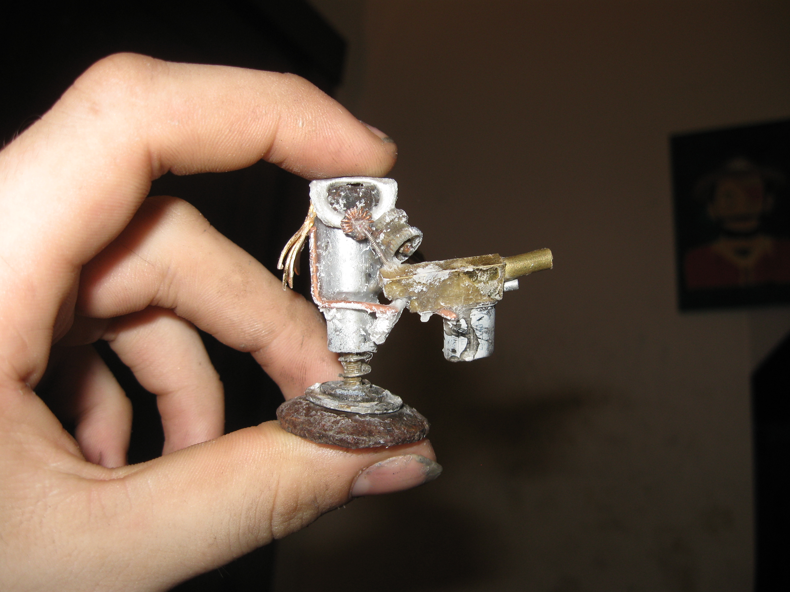 Thanks for the support, vik! Not sure if i would want to remove the rivets: I am pretty much done, now (after i took the picture), and i don't have much else to use (though if i find some small beads or something, I will replace the current rivets with those.) Maybe I won't paint it until i can find some decent rivets Anyway, as for the parts I used; I'm not sure if I know all of the parts that I used. I'll try: you were mostly right about the torch (booklight, to be exact), connected to bit from' an ork wrekkin ball, which in turn is connected to a flint gear (?) from a cigarette lighter (I don't smoke, I just pick up the metal trash of those who do), which is connected to a cylindrical bit of unknown origin (and a piston made from non-gw sprue), which is then, finally, connected to a cut up ork power klaw. The body is made out of a paint pot, with styrene posing for wood (i'll probably paint it metal, because the grain has been covered in superglue). The "face" is a clock face, with chaos spikes for hands, and a gear on top, with two lights for eyes (one is from a missile launcher, the other is from some military model kit.) I riveted the black part of the paint pot in the style that i would like to you se for the whole thing (cutting 3mm beads in half, then gluing them on), but I can't find enough beads (probably lost in the warpstorm in my room ) the hatch is from a rhino, and the guy on top is from the vintage miniatures bin at my flgs (75 cents!!!). he originally had a gun, but i cut it off, and used a toothpick for the pointing finger (I cut it shorter since the pic, so that he didn't look like he had a footlong cuban cigar ) i have no clue what the smokestack is, but i think it might have been from some sort of pen. the gears on the back are just that, from old watches. The other arm is from a mechwarrior mech, as are the legs. the rivet gun, however, is made from some vcr (?) part, probably from a button, and the tip is a piece of aluminum tube. the loincloth looking thing is from the chaos vehicle sprue, and the girder that he is stepping on is a piece of sprue.