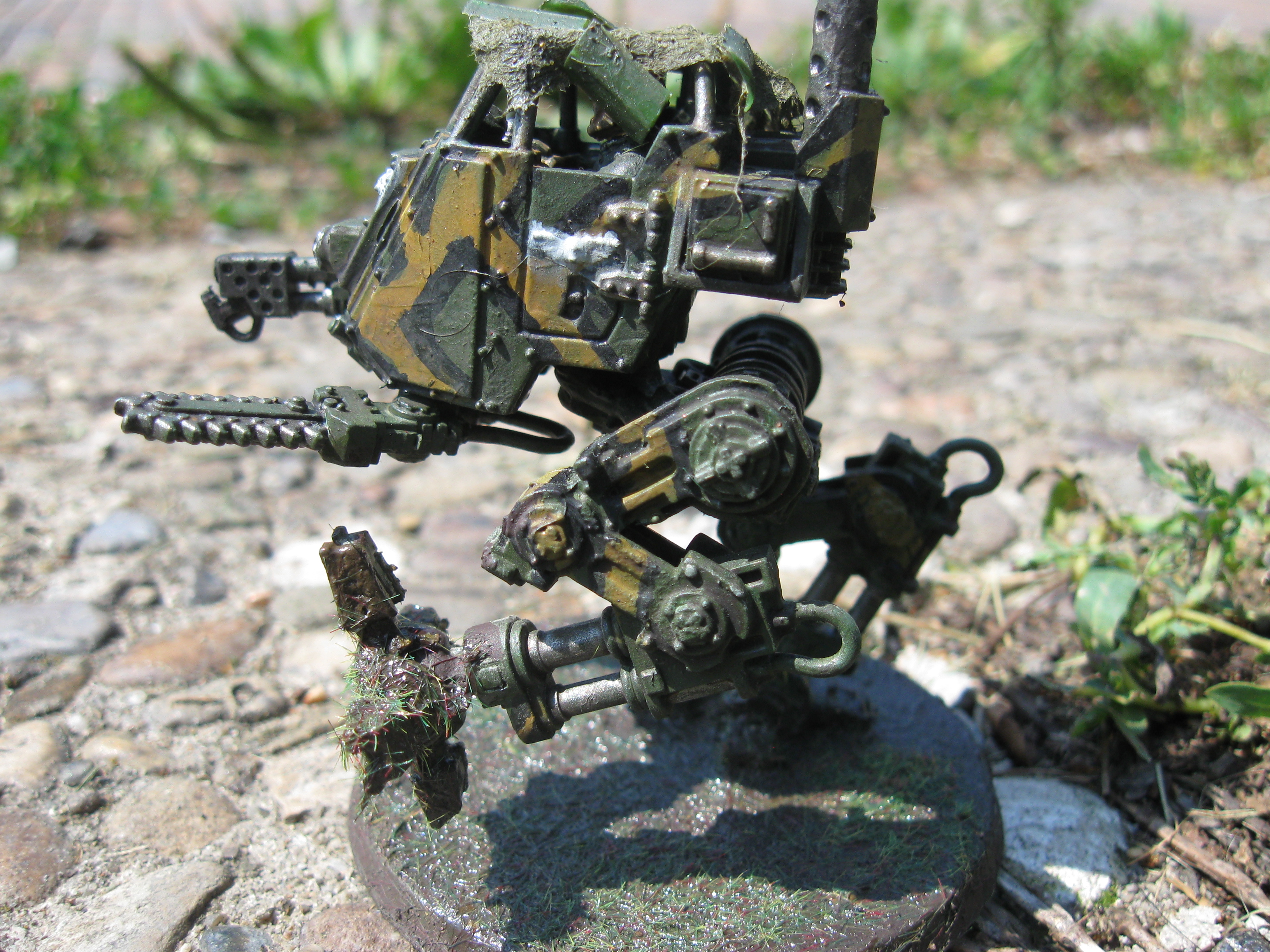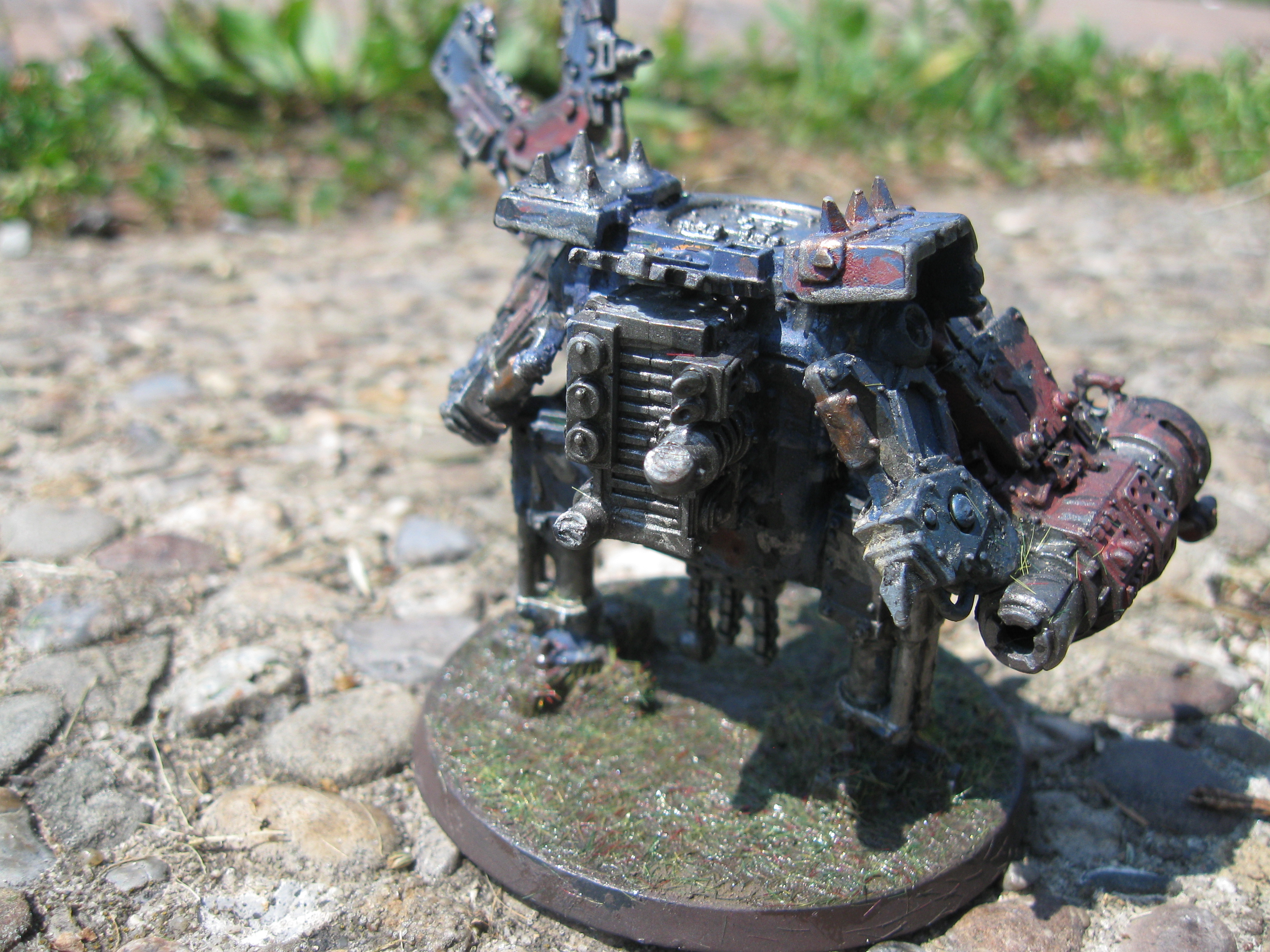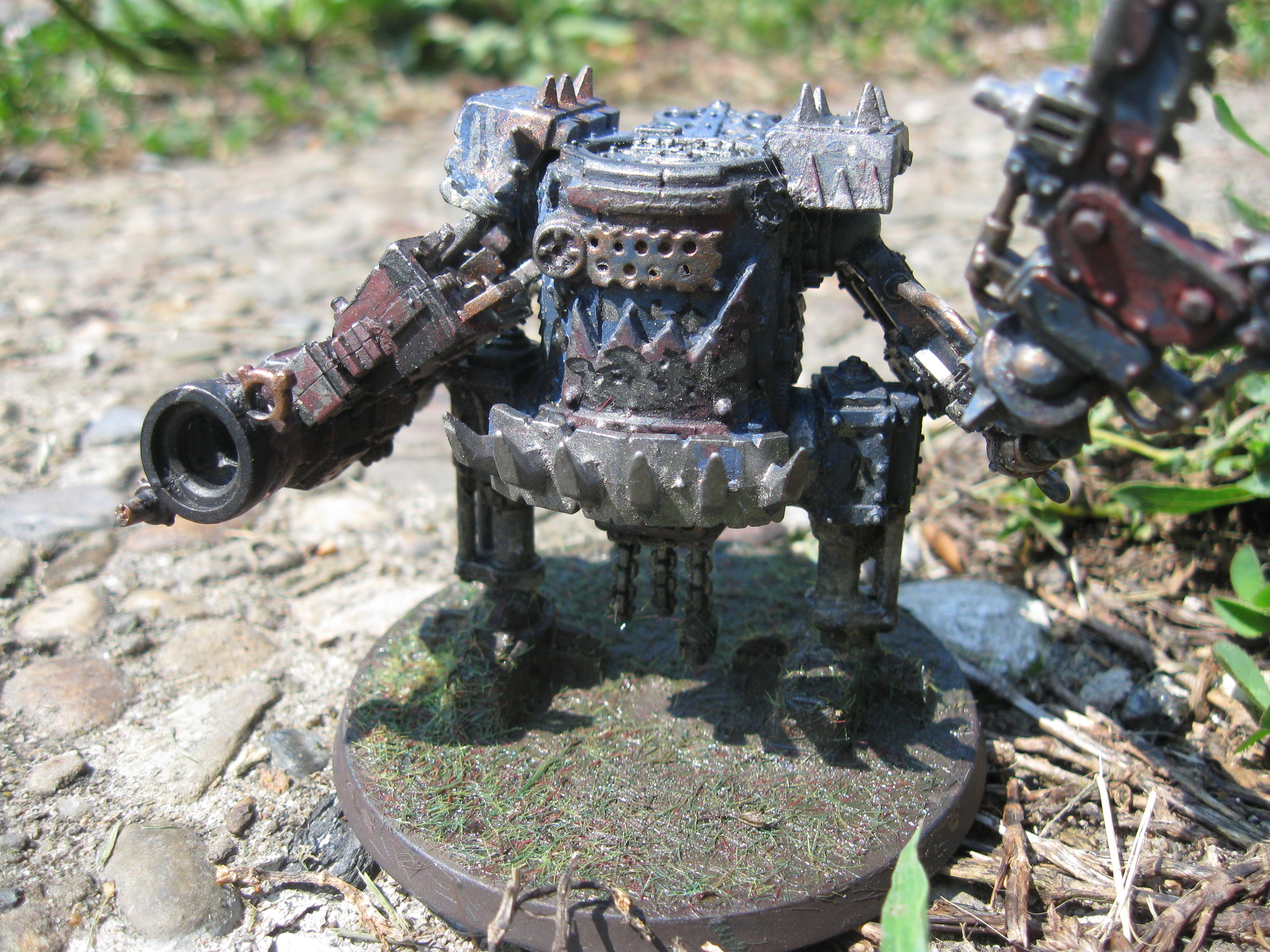 This is a deff dread that my plague marines/iron warriors gave to the orks (in the guise of a painboss known as "Bad "Dok Bill," who always puts his patients to sleep before he starts working). He now has legs, and 4 dccw (the gun has been removed since the picture was taken).