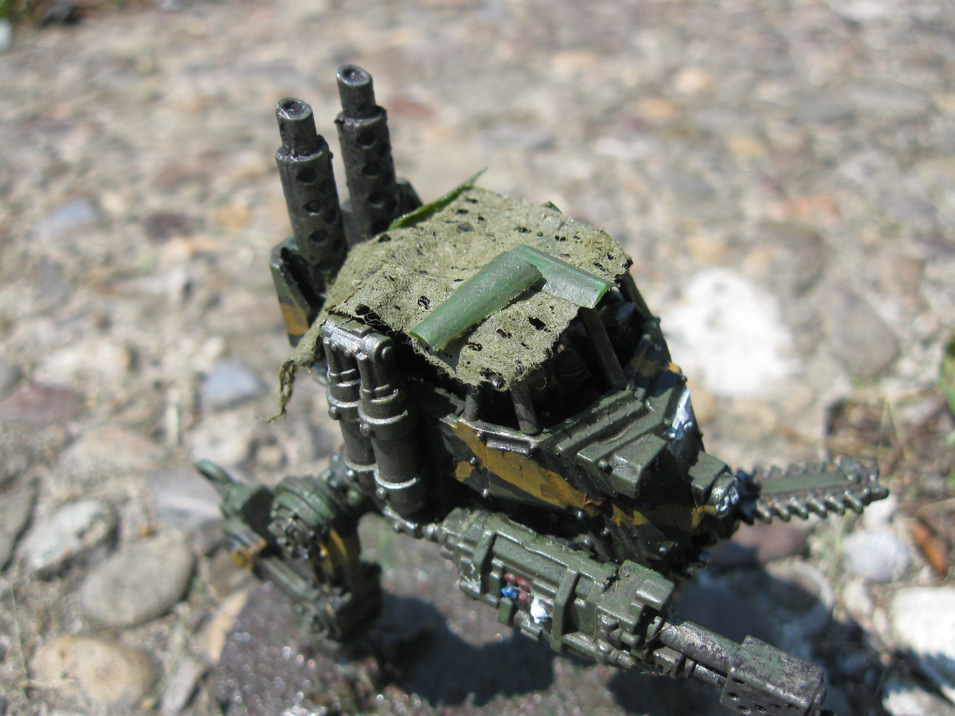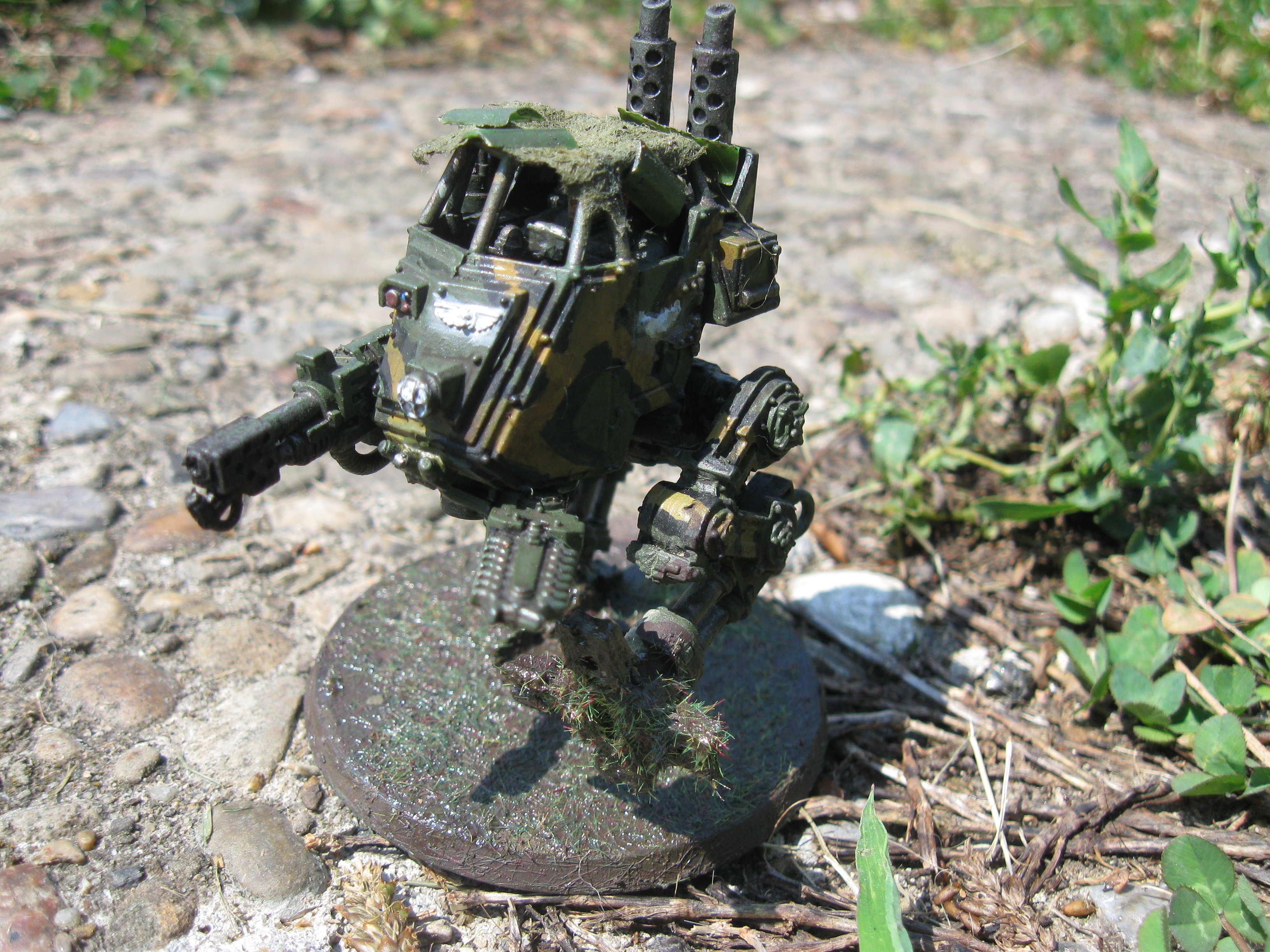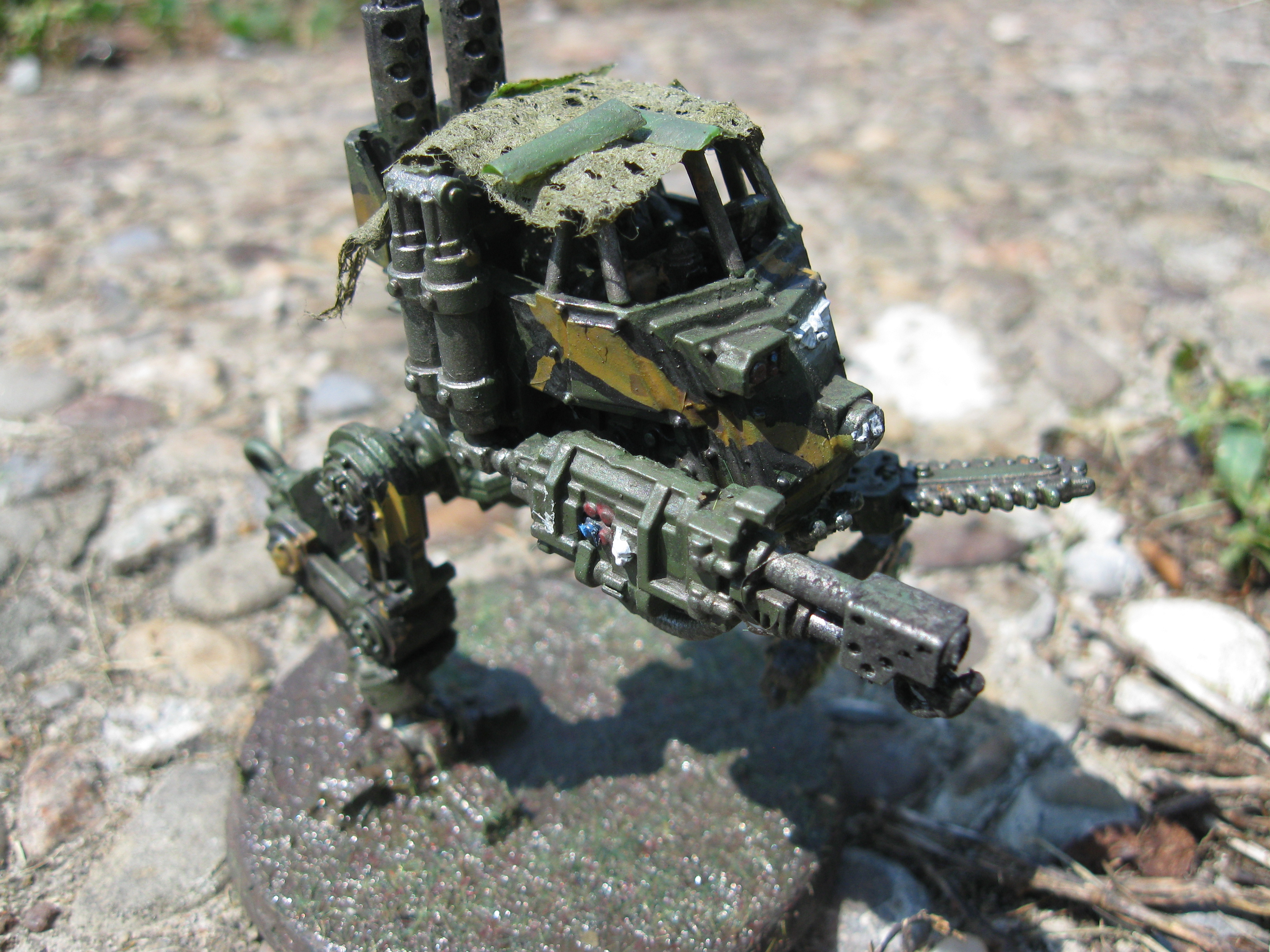 This is a deff dread that my plague marines/iron warriors gave to the orks (in the guise of a painboss known as "Bad "Dok Bill," who always puts his patients to sleep before he starts working). He now has legs, and 4 dccw (the gun has been removed since the picture was taken).