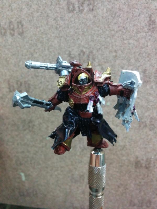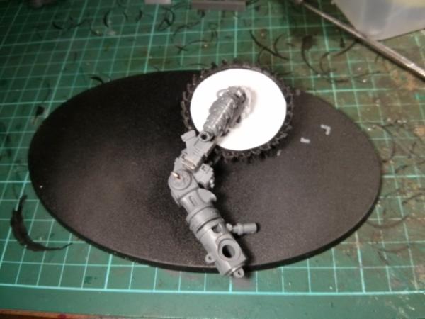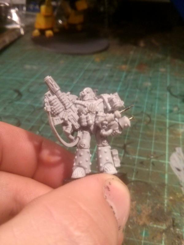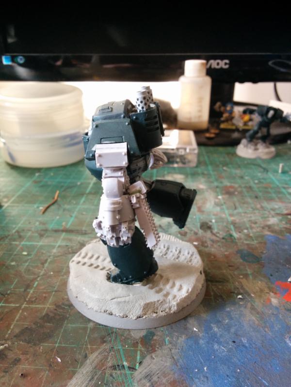 The arm not holding the case isnt glued in at all at the moment so there is scope to move it about, initially i wanted it to be posed with its chainfist blade stuck in the shoulder of the dread on the floor (hence the hole in its shoulder) but i couldnt get an angle good enough without modelling an overly long and fragile looking chainfist. Im not entirely sure where i want to put this second arm now....ideas?