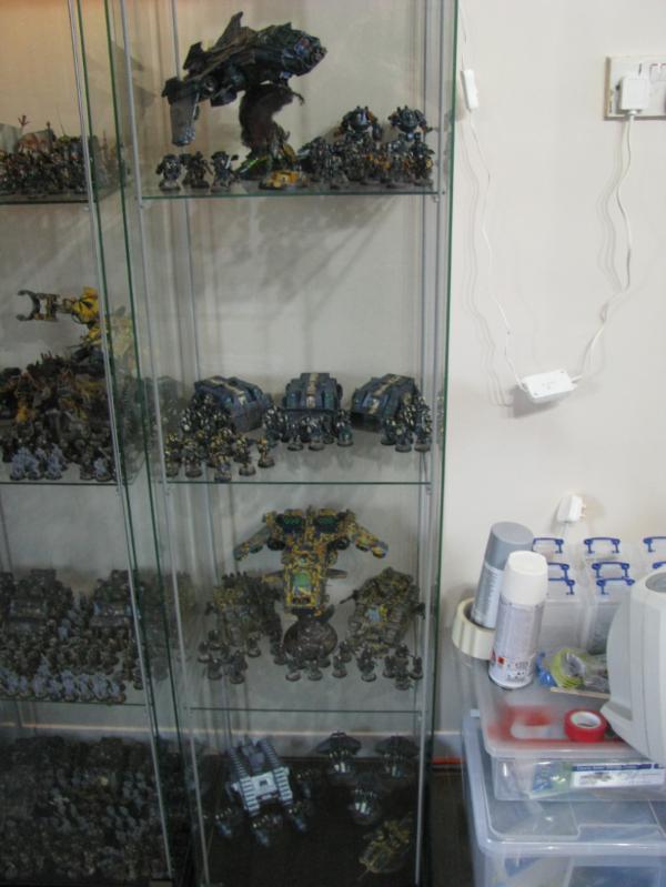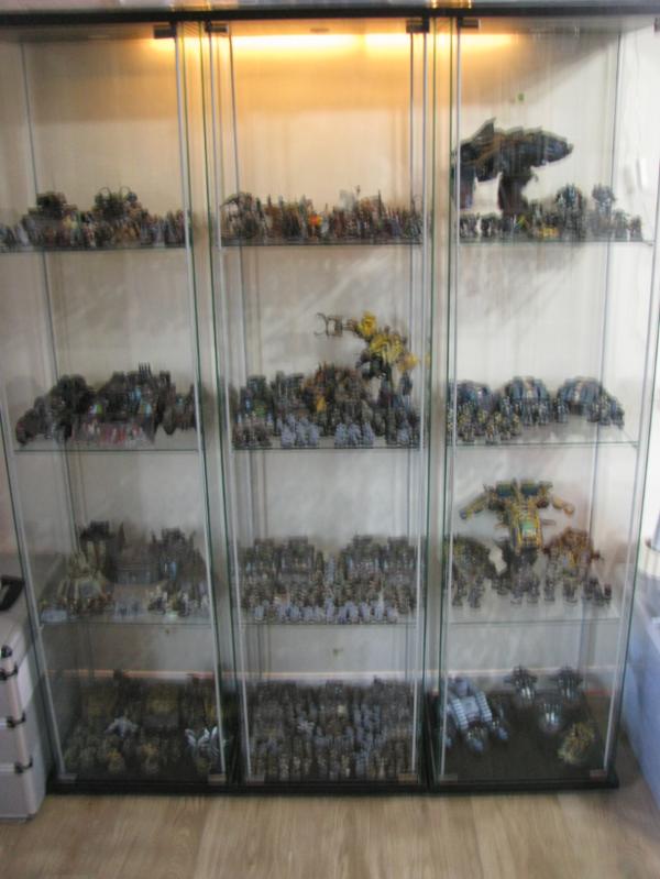 Ive finally achieved a small life goal this past weekend. I have bought and put up a set of display cabinets for my models. I wanted to do this but have not had the space in any house ive lived in until the wife and I bought our own house earlier this year. Now that they are set up and filled with some of my models i have realised i have a lot more models than i thought! The below picture shows the cabinets i got with all my 40/30k armies in, unfortunately my WFB armies are going to have to wait until i get another couple of cabinets before they can be displayed: