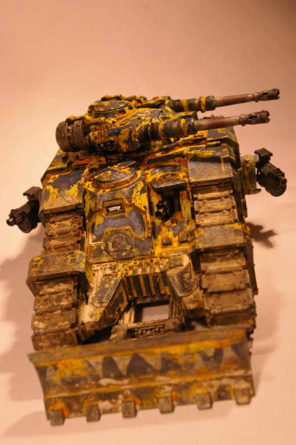 Anyway ive chosen to paint this as a full blooded Imperial fist tank. Its for my unit of templar brethren to ride around in, who dont really have any outward signs of being Alpha legionnaires anyway, so i think it fits. Ill probably add a few touches of AL-ness to the tank, but t start here it is in its primed and then yellow-y goodness: