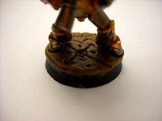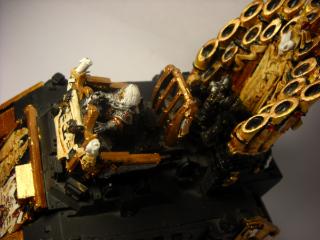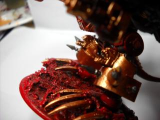 i tried to do a rust effect by mixing brown and orange, watering it down until it was like a wash. then a dry brush of black and boltgun metal. im uber surprised my paints are mostly still usable!
