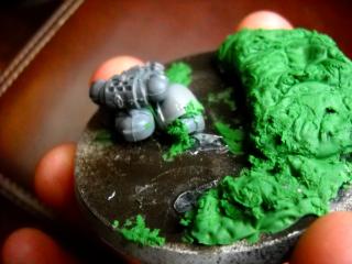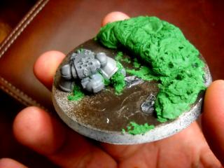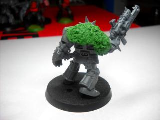attempt at 'sculpting' fur.. figured it might come out looking ratty which isnt bad for chaos but it looks all mossy. maybe its the green? maybe when i paint it it will look better lol. first try. i did more and tried to make up for lack of shoulder pads with it. bad call lol. =D here is hoping it looks better when i get to finishing them.