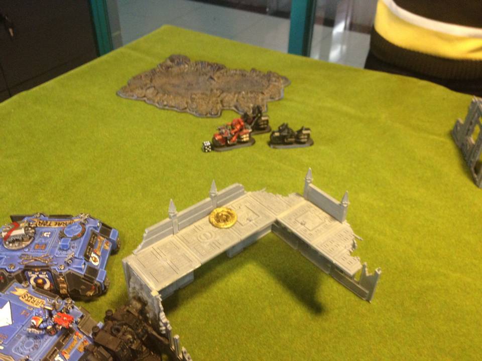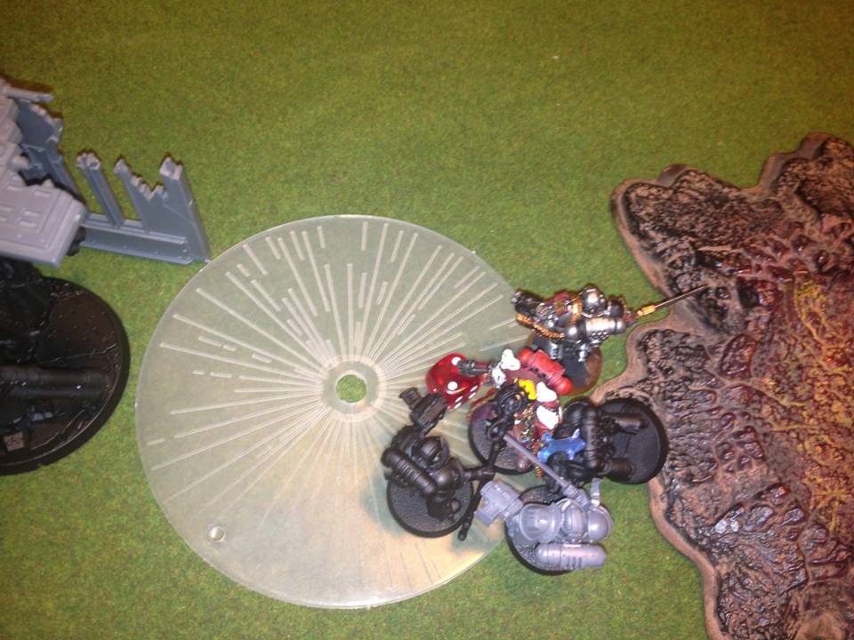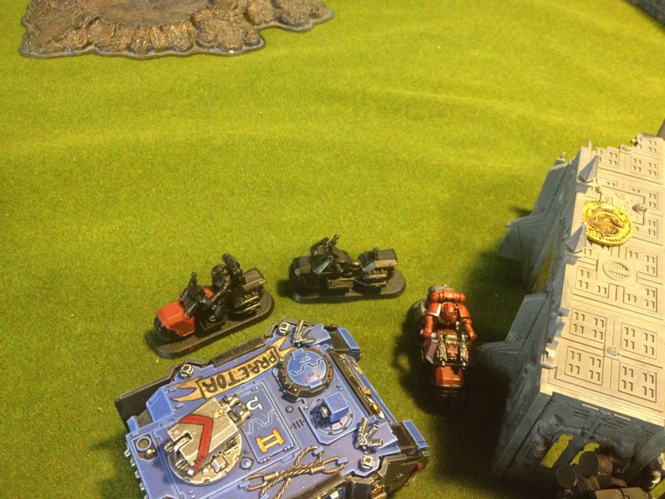 Nob bikers without a PK?!? That's certainly interesting indeed. Sounds like the BA player is playing Dante, Mephiston, sanguinary guards and perhaps stormravens? Well, unorthodox army versus unorthodox army....