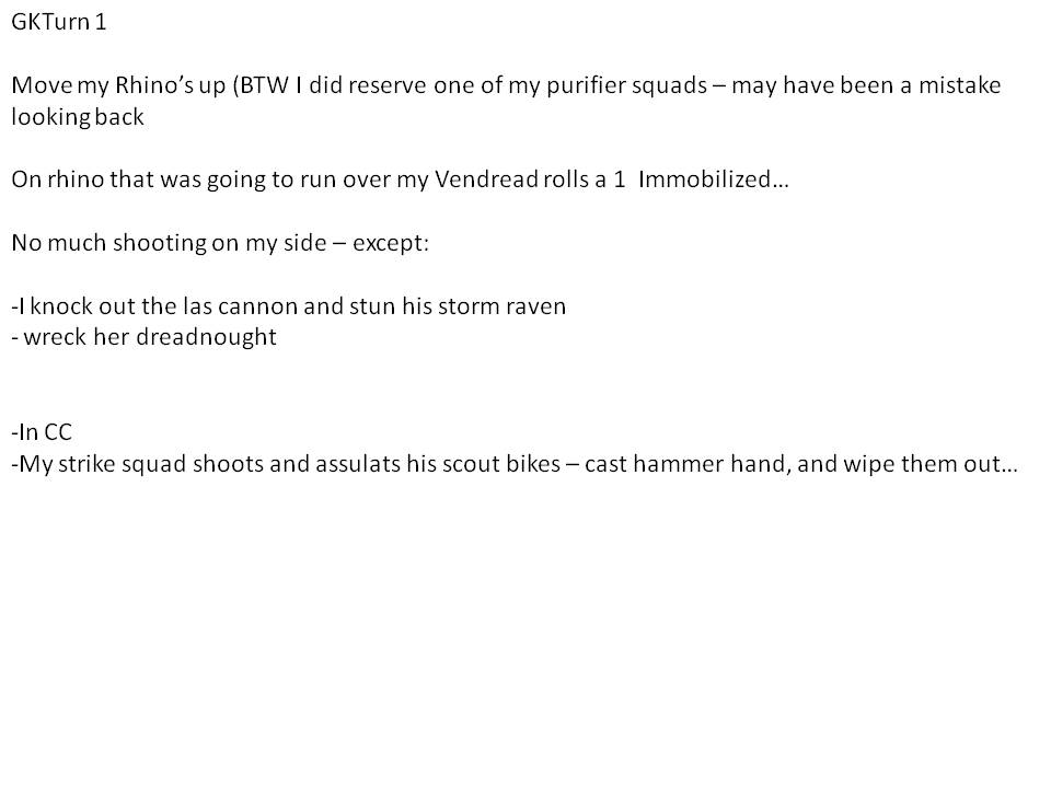 If he was planning on a firefight with you, I would have dumped off his guys much earlier, as in Turn 1. Advance the LR 12" and then drop off his purifiers. As a matter of fact, I would've also advanced the razors 6" and then dropped off their guys as well. Then he would've had a chance to do some damage in the shootout with full use of all his psycannons and vehicles, meanwhile making target priority a bigger problem for you. With his guys in the transports, target prioritization was very easy. Shoot the razors and dreads. Then shoot the infantry and the LR.
