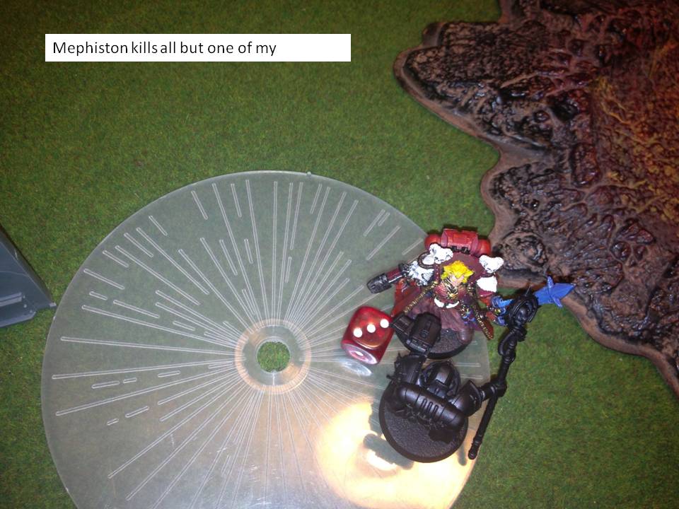 Advantage was to me the first 3 real game turns. I was winning 3 objectives to 1 by end of turn 5. Unfortunately i she was avoiding the hell out of Crowe with Mephiston, i did get one chance to tie mephiston up but failed my difficult terrain test :( . Any case, he was a beast and pretty was going from squad to squad...i just can't survive that many attacks with my squads of five guys. His land raiders did a good enough job popping enough transports for mephiston to just reach havoc (turn 4, 5, 6) .