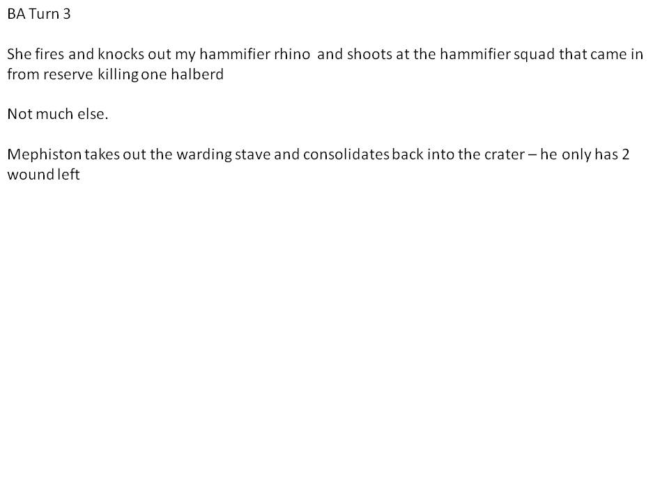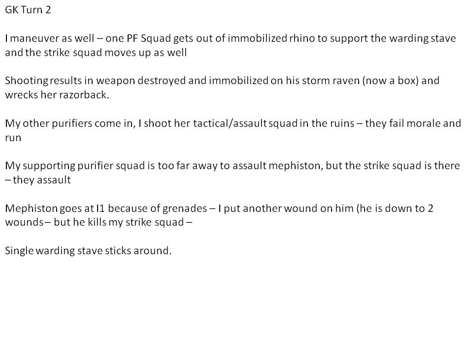 Overall - i noticed that I have strong units, but against mephiston and Land Raiders it is very tough. These three units (and most of her points) are just too durable and Mephiston can just wreck me. Even the warding stave squads - 4 guys dead her turn, my turn, the other dies...