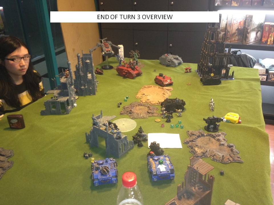 DiuDiu is a very good player. My guess is she planned ahead to turn 5/6/7 straight from the start. She didn't want you to rush headlong at her with everything so she gave you the side with 2 objectives. That's now 2 units of psycannons that wouldn't be advancing. She then takes her sweet time eliminating stuff, goes to contest turn 5 with very little left in your army that can actually damage landraiders. If the game goes to VPs she probably gets the win due to having 2 completely functional landraiders.