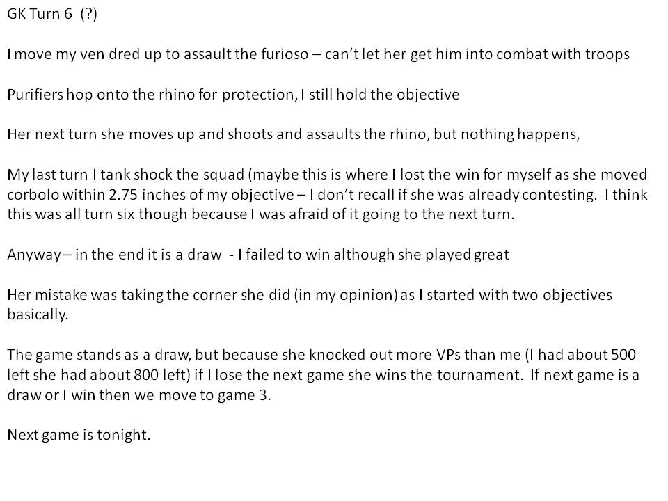 Wow, you let a girl beat you?  No, just kidding. Tournament looks like a lot of fun and you did great. Don't think you need to really change anything with your list if you use it again next year....even against an army with dual-land raiders. I think your Crowe-purifiers should be able to take them on.