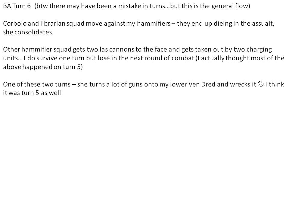 Sorry, i have pictures but only through the first couple of turns. The only bad experience is the game went from 7:45 - 11:00 PM She is just such a slow player it gets really irritating. She checks LOS from every one of my units to every one of her units each turn. A good player, but can use a bit of speeding up.