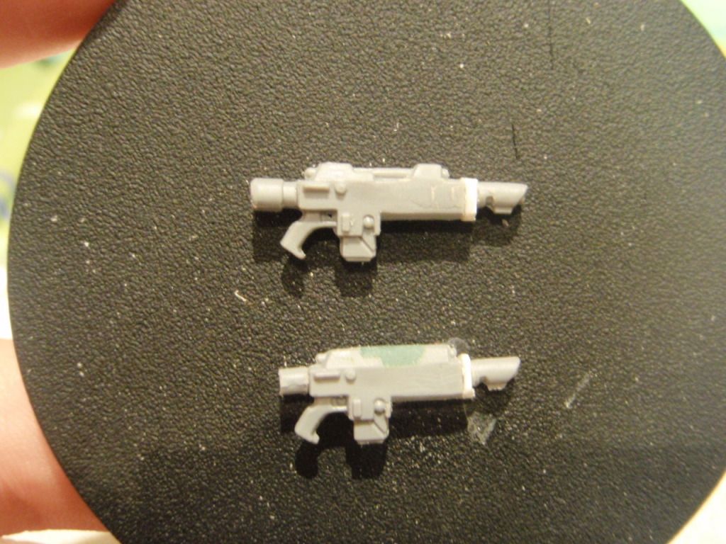The handguns fit rather well actually, it's actually something I did a few years ago when the Handgunners were released- just a quick chop and a bit of green stuff is all it takes. They also look as if they're aiming down the length of the rifle too as opposed to, well, not aiming at all.