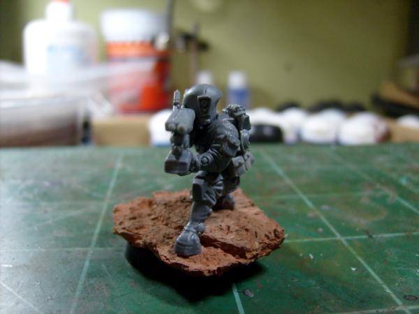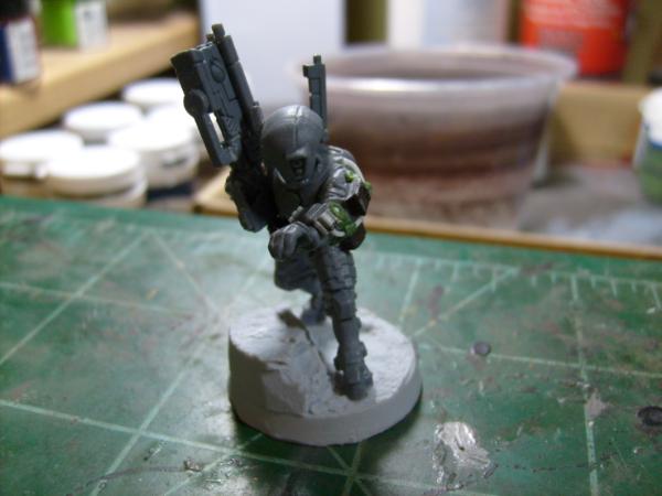 From the start I want my Pathfinders too look like they are equipped to be scouts. An with the same 4+ armor of a Fire Warrior the metal minis don't make any sense that 50% of the armor is missing. So I left all the armor except for the large shoulder armor. Also, added of course is pouches for equipment. All the markerlight is the end of a Gun Drone Antenna and the Antenna from a hand sensor from the Fire Warrior kit. He is not attached to that base as I plan on using Secret Weapon Desert Mesa bases.