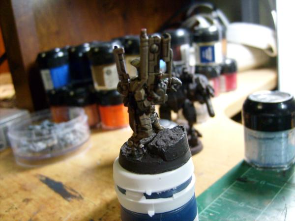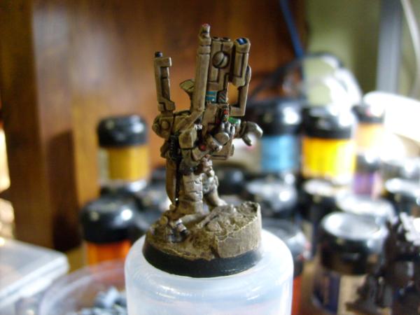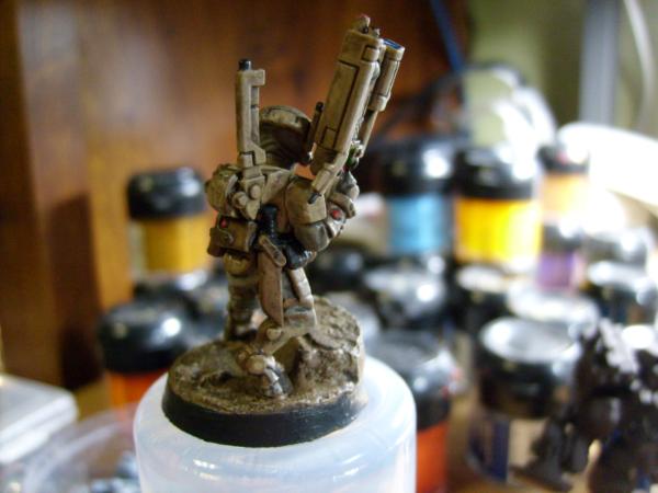 This is what I learned by using this pricy mini as a test vehicle for my paint scheme. The darkened camo tan only works on minis up to crisis suit size. Any vehicles will have to be a lighter tan and must use weatheting powders on the large surfaces. How the darker tan is created is by exploiting the pooling effect of GW devlin mud wash and the new GW color equivalent. When you get to this much flat surface area the wash streaks badly even when thinned down. That streaking is not noticable on infantry or crisis suits so the wash darkens the tan well.