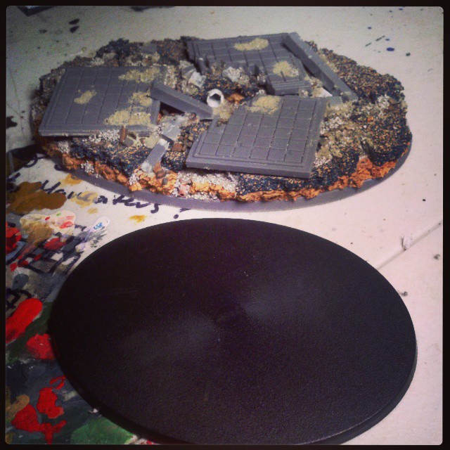 Today's progress pics, including "Operation: Rescue Base", which is me trying to salvage a rather horrible base a client got second-hand. It was just few bits glued down, primed/painted, and dipped. It was awful. I filled in areas with cork, ballast, sand, bits, and stuff. Masked the bits still attached (apparently, some stuff broke when it was shipped to my client), and then re-primed and painted it. Next after that is touching up the Cerastus that goes with said base, though I am still befuddled as to what to do. My client does not want me to re-paint it entirely, but it is damn tempting.