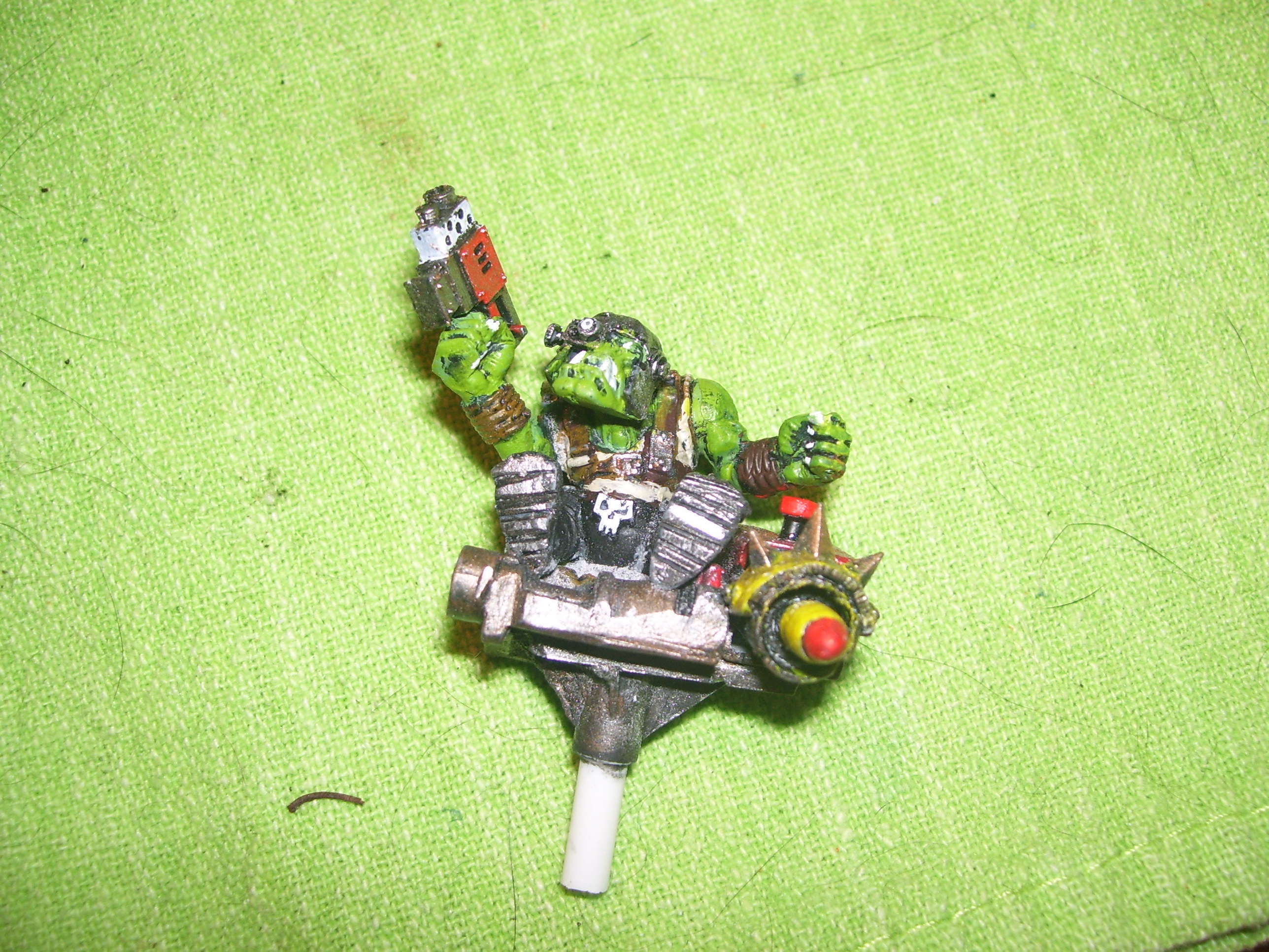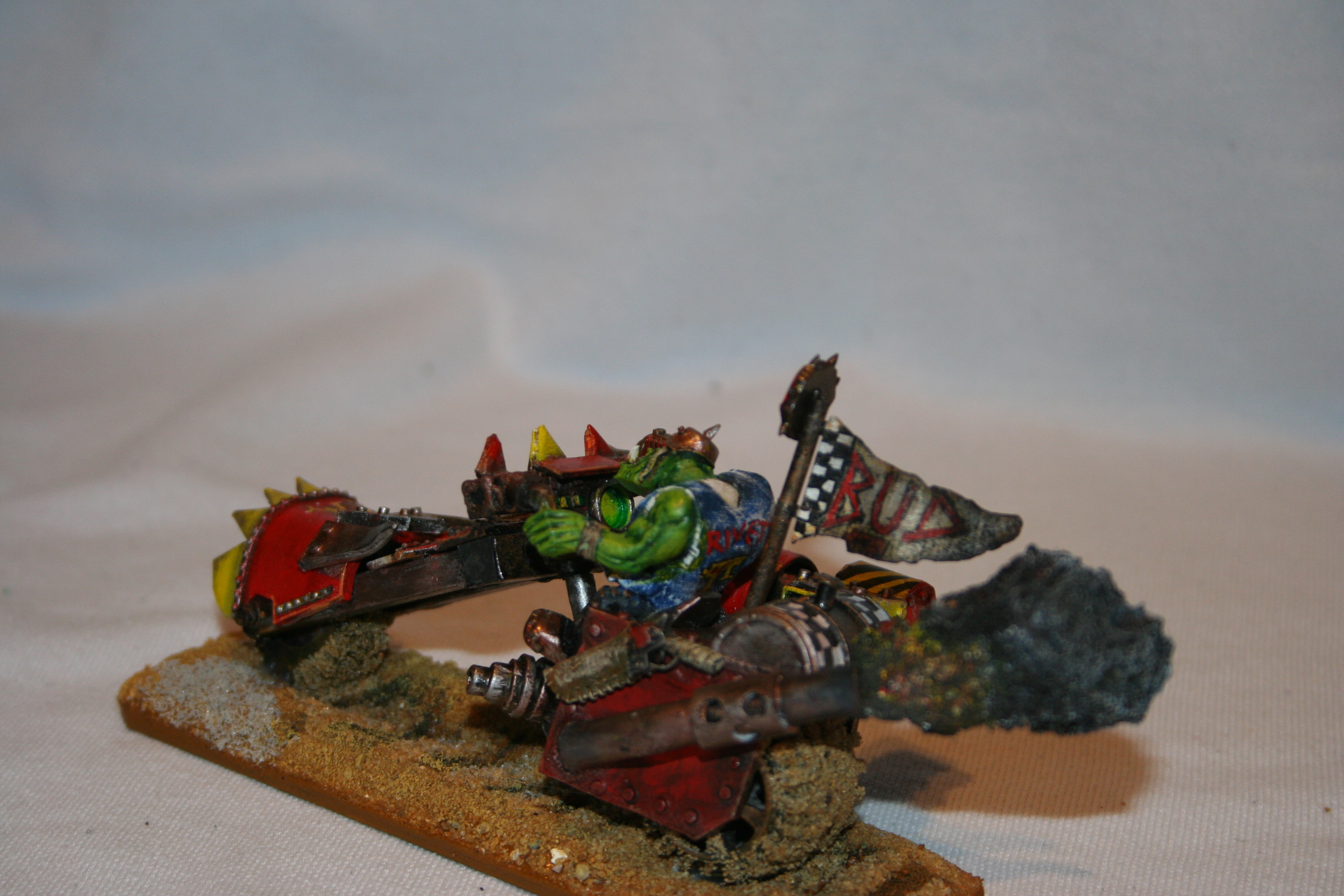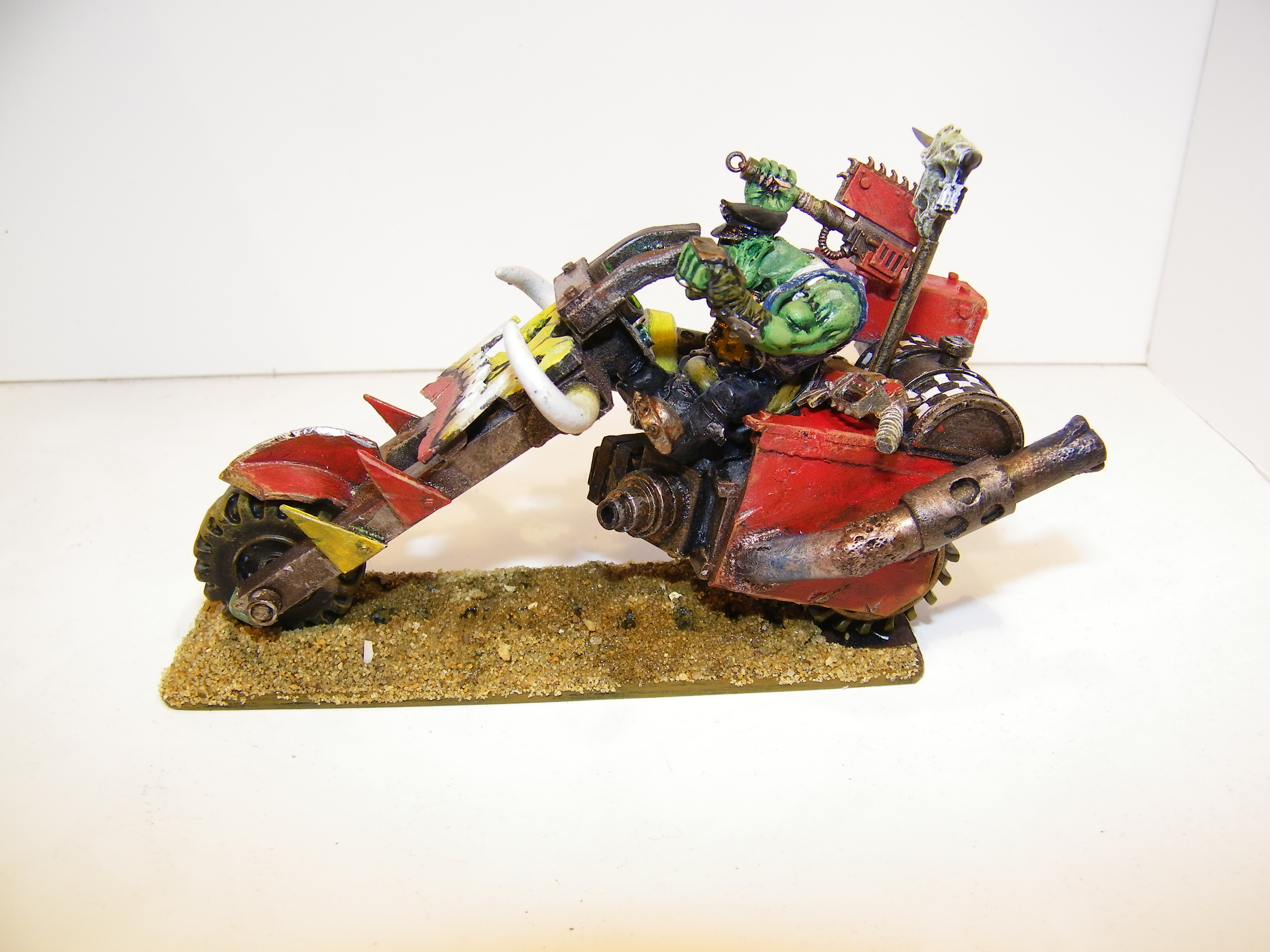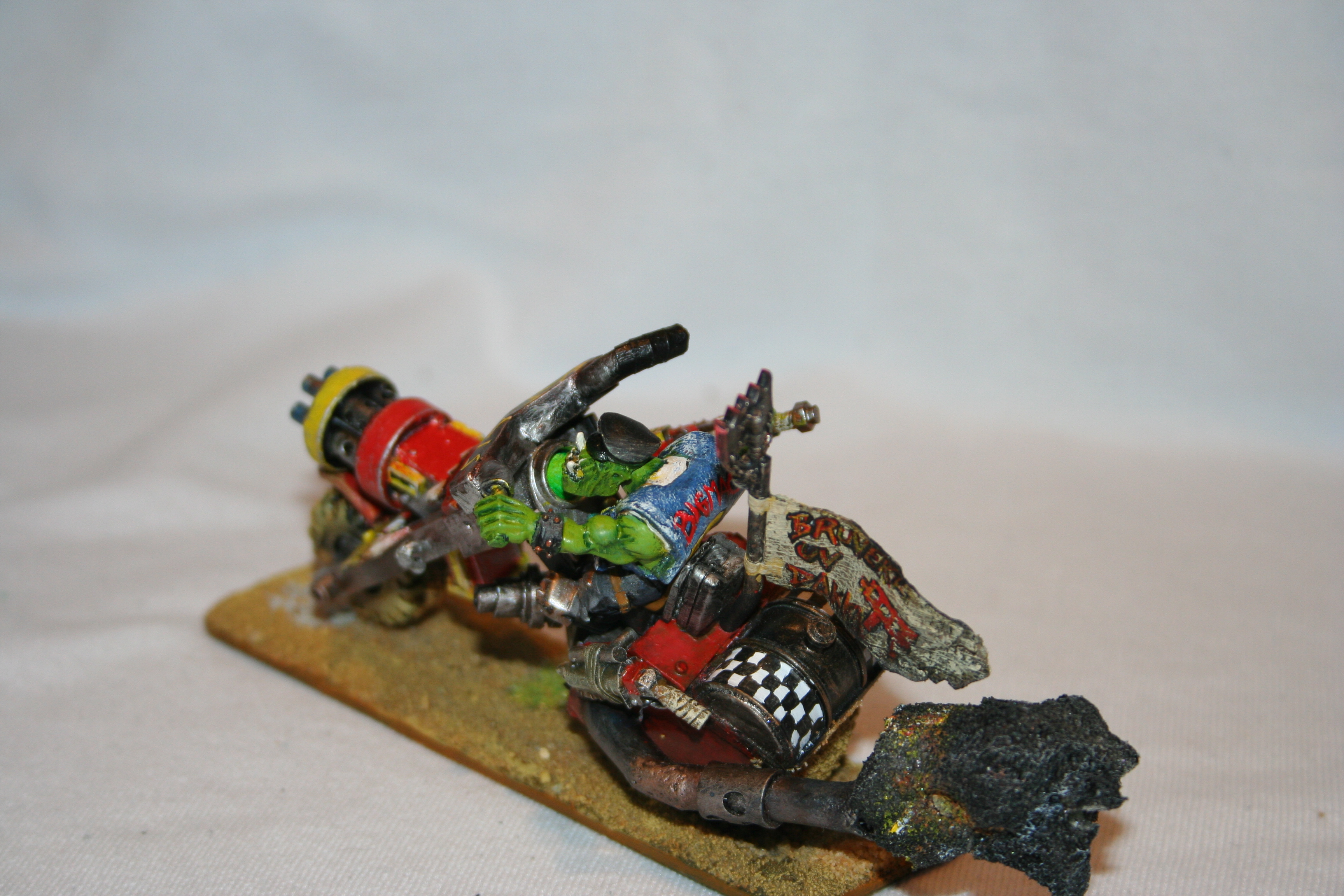 He is unlucky in that he is always getting something stuck in the machinery. Couple fingers here, whole hand there, who's counting right....But he's a survivor. Thus he is huge and strong, and although he is not too bright, he is brilliant at keeping things going. That's why he has a mobile workshop. Da Warboss is very happy because Rab see's no problem with refuelling the bikes and kopta's on the front line with bullets whizzing past. Soon he will have some big guns to shut them up anyways....