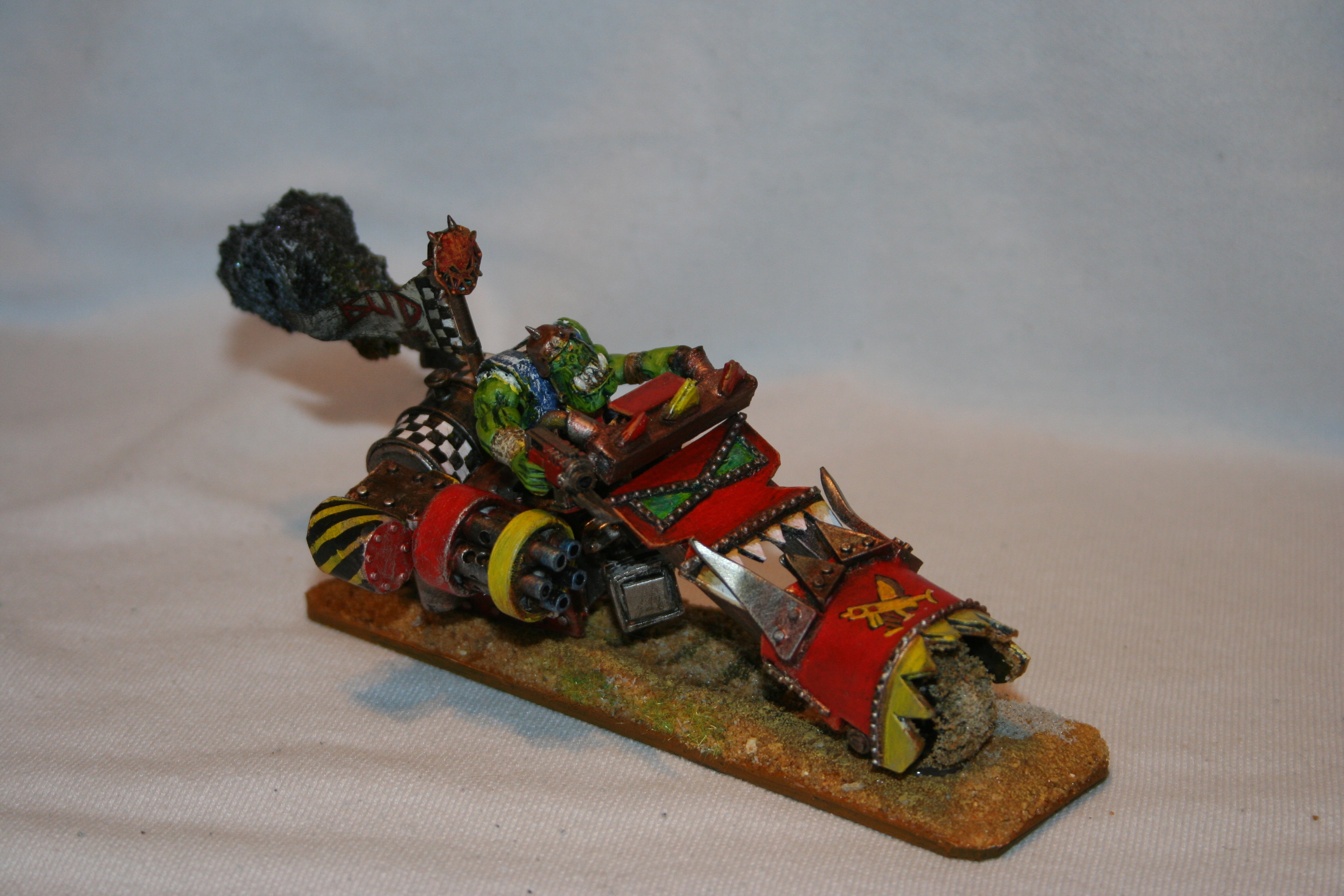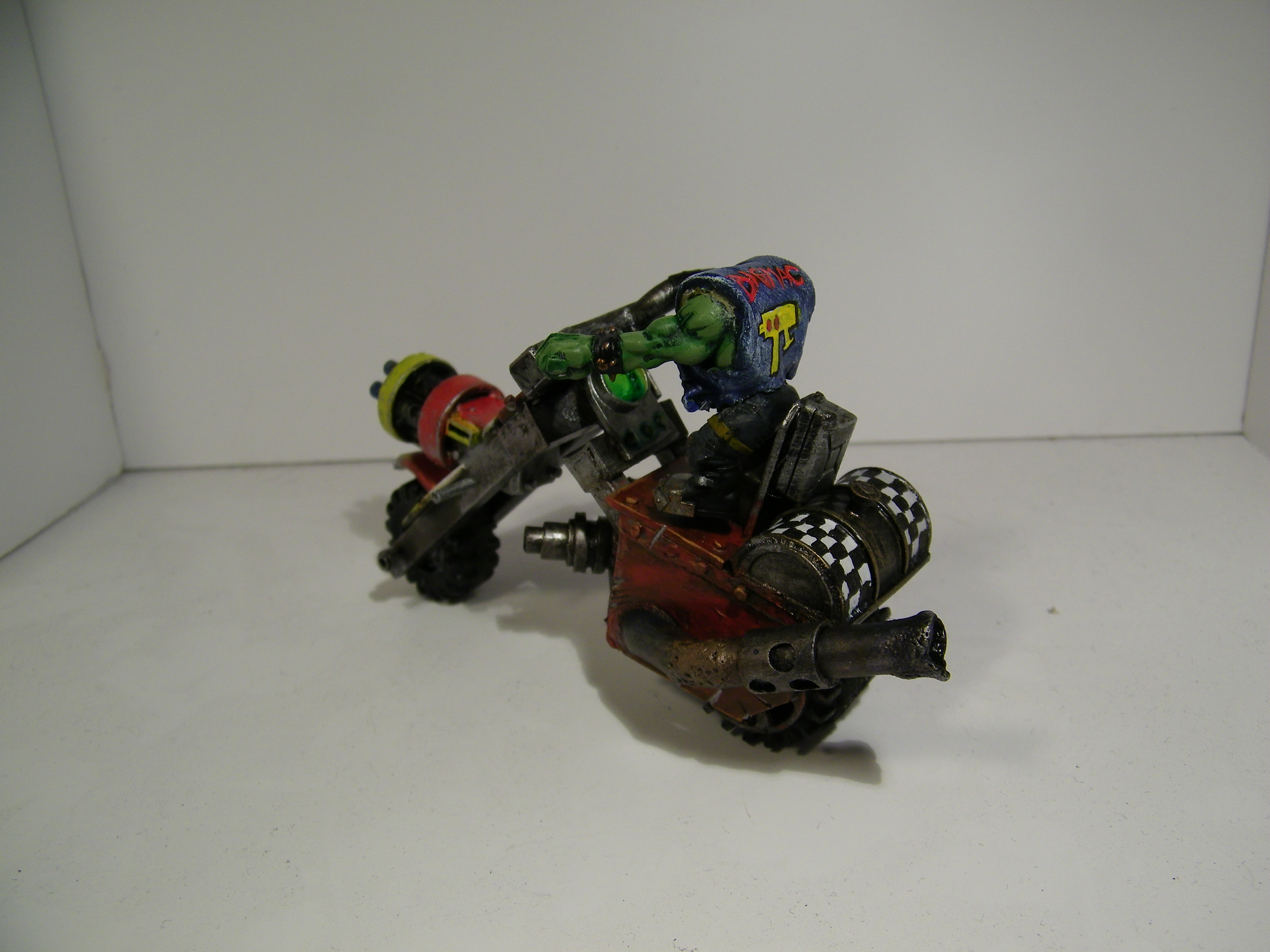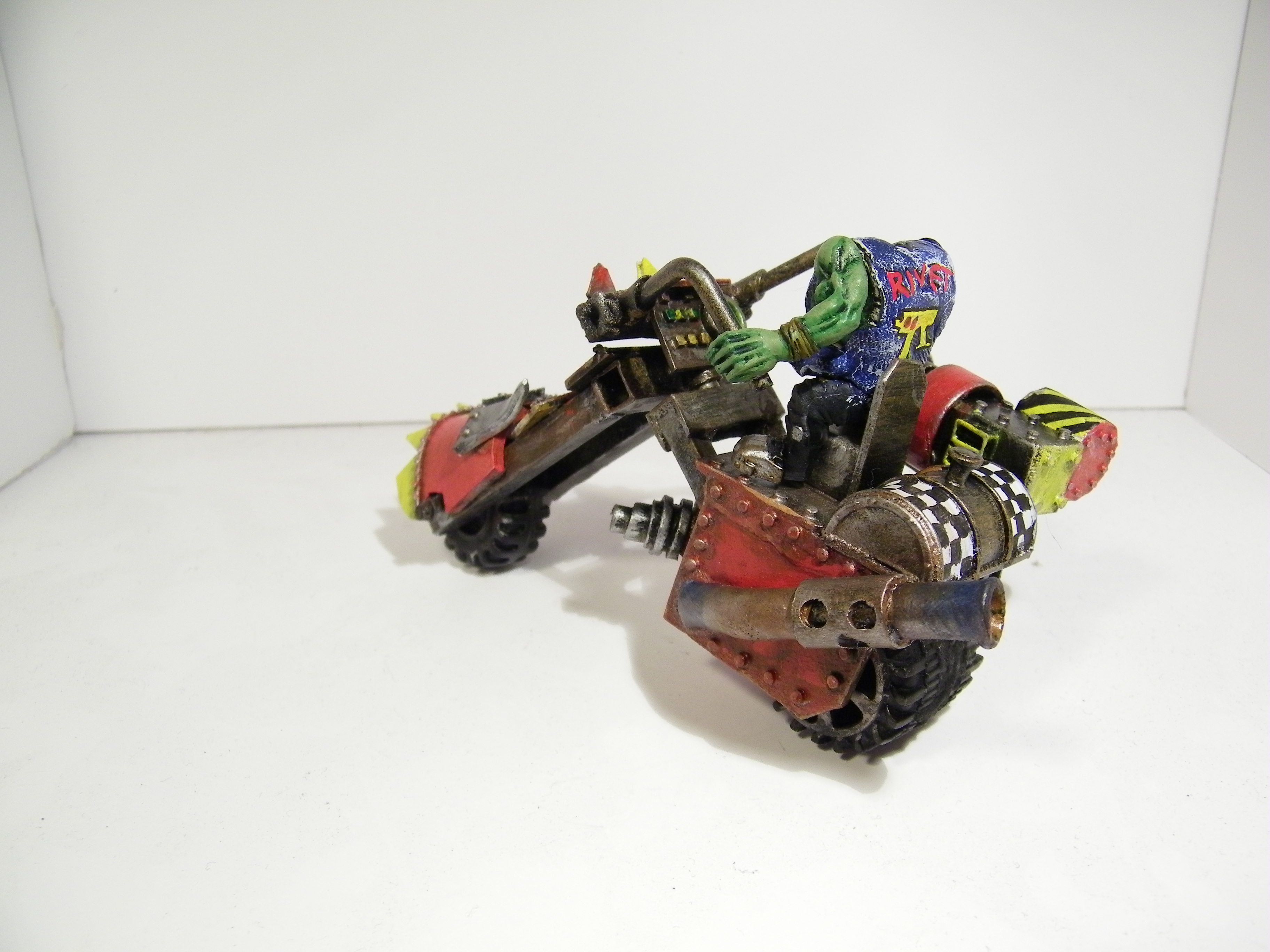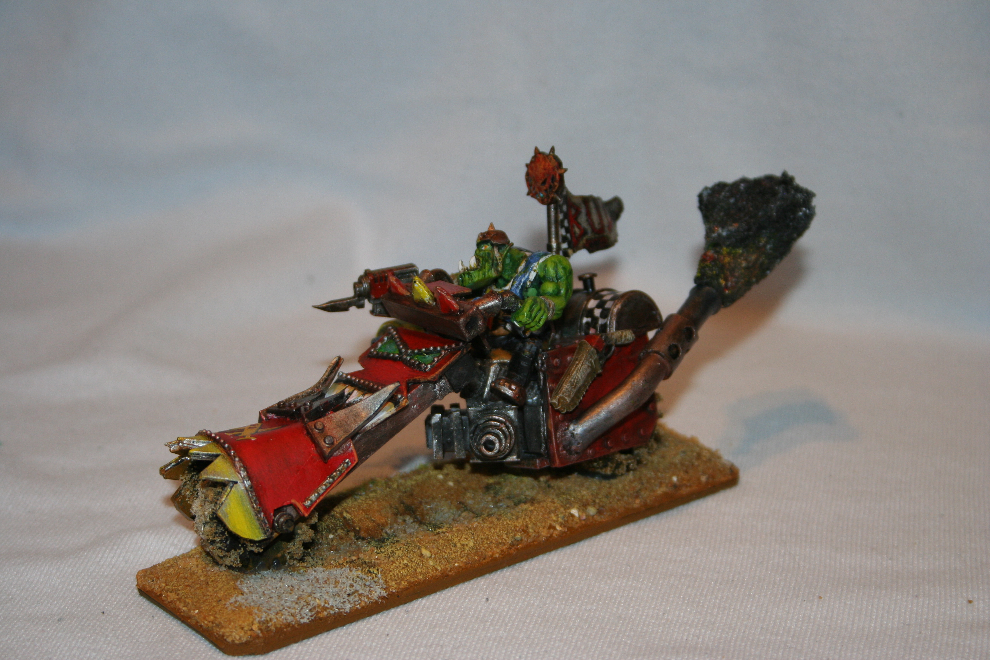 He is unlucky in that he is always getting something stuck in the machinery. Couple fingers here, whole hand there, who's counting right....But he's a survivor. Thus he is huge and strong, and although he is not too bright, he is brilliant at keeping things going. That's why he has a mobile workshop. Da Warboss is very happy because Rab see's no problem with refuelling the bikes and kopta's on the front line with bullets whizzing past. Soon he will have some big guns to shut them up anyways....