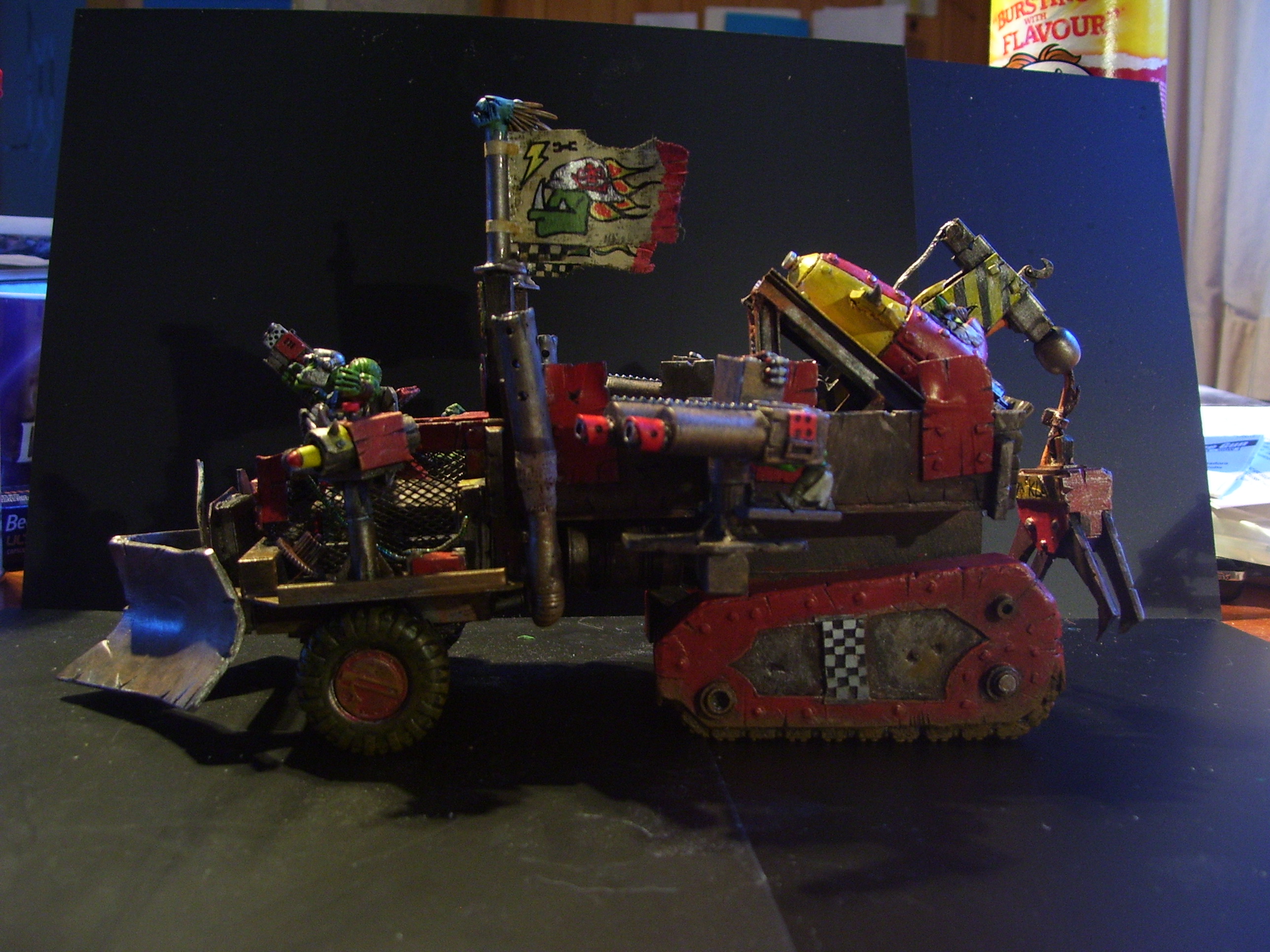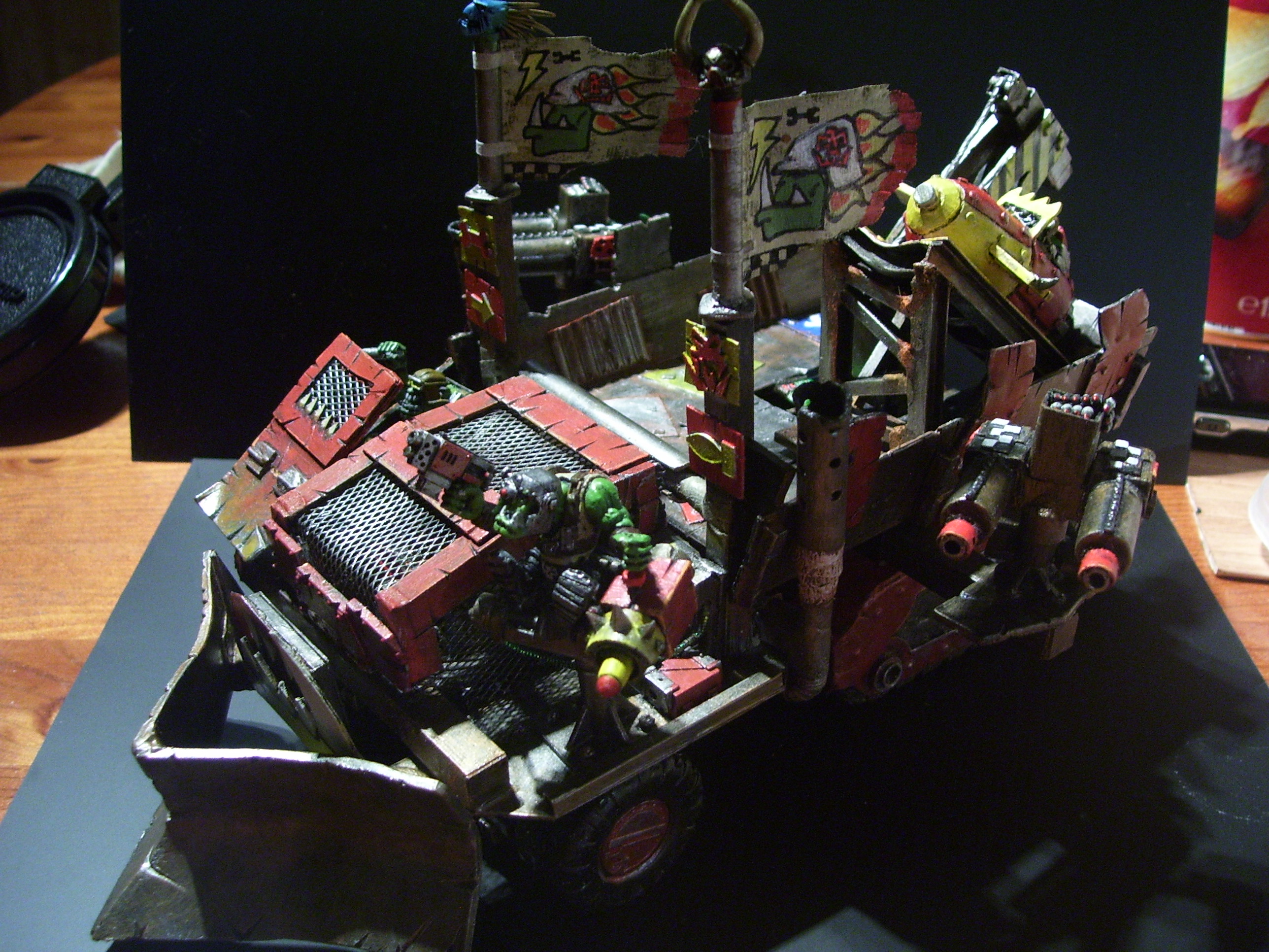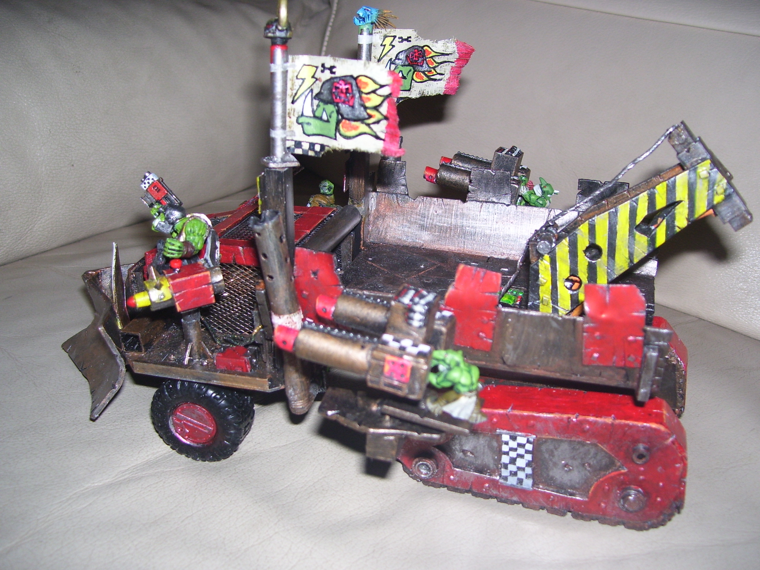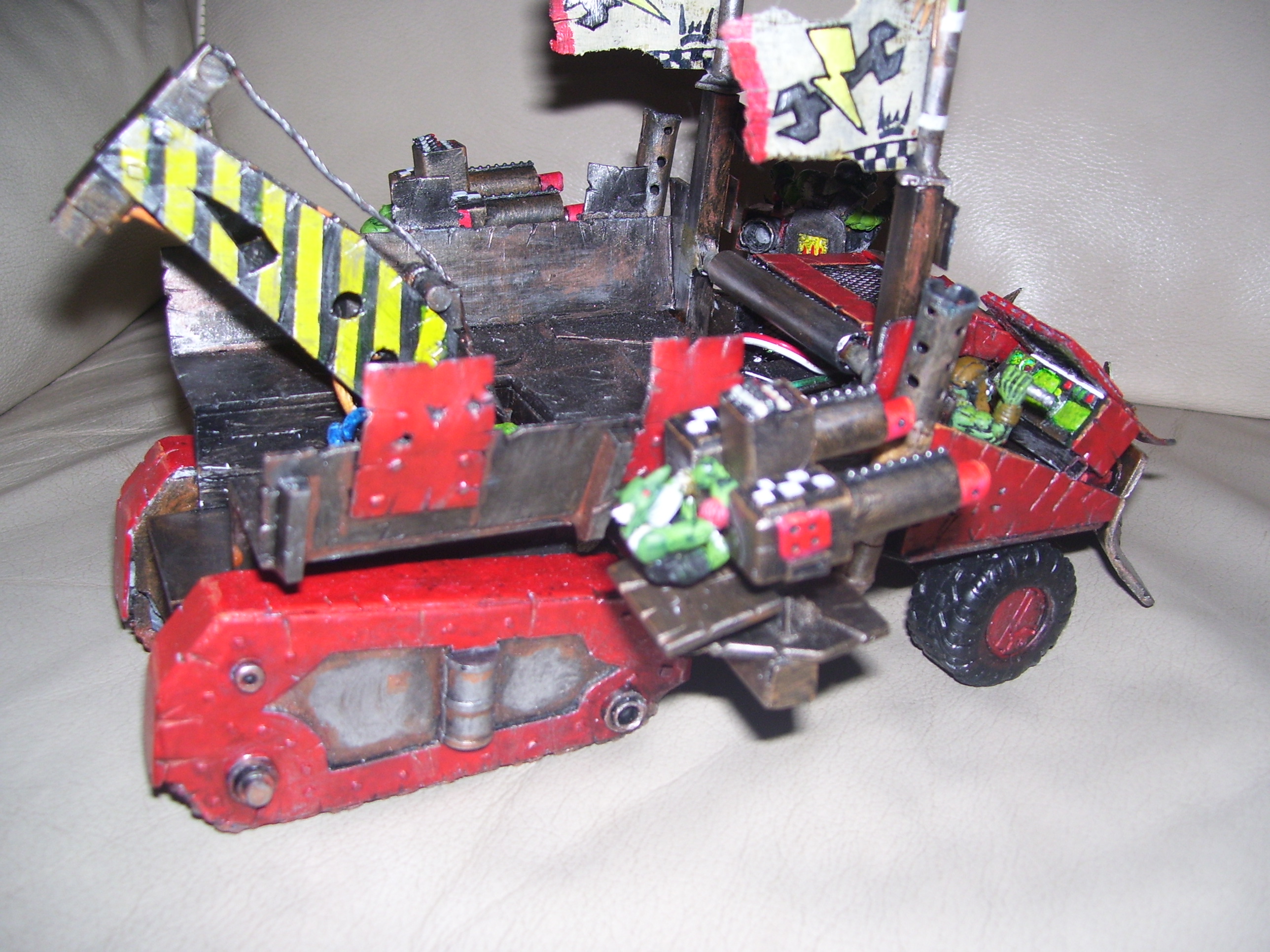 wow, this is becoming more awesome by the day, lik the grots operating the big shooters and the whole removable bit thing. the flags look ace and the front bumper looks pretty sweet too. keep up the good work.