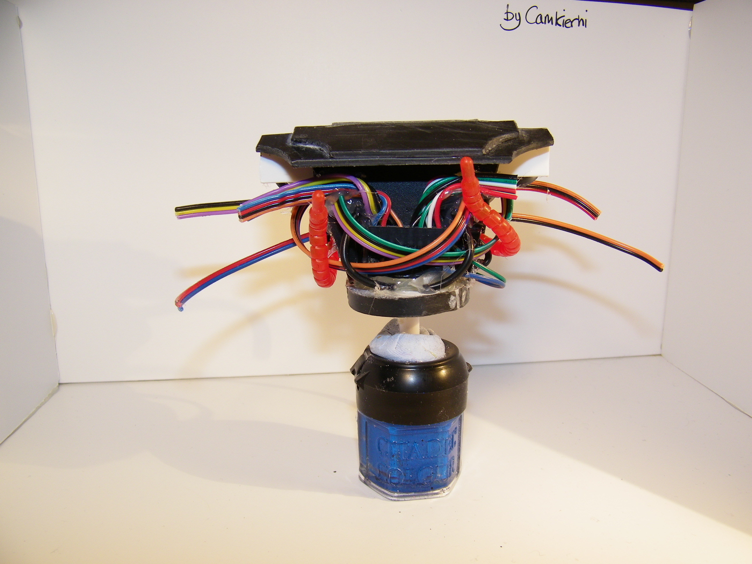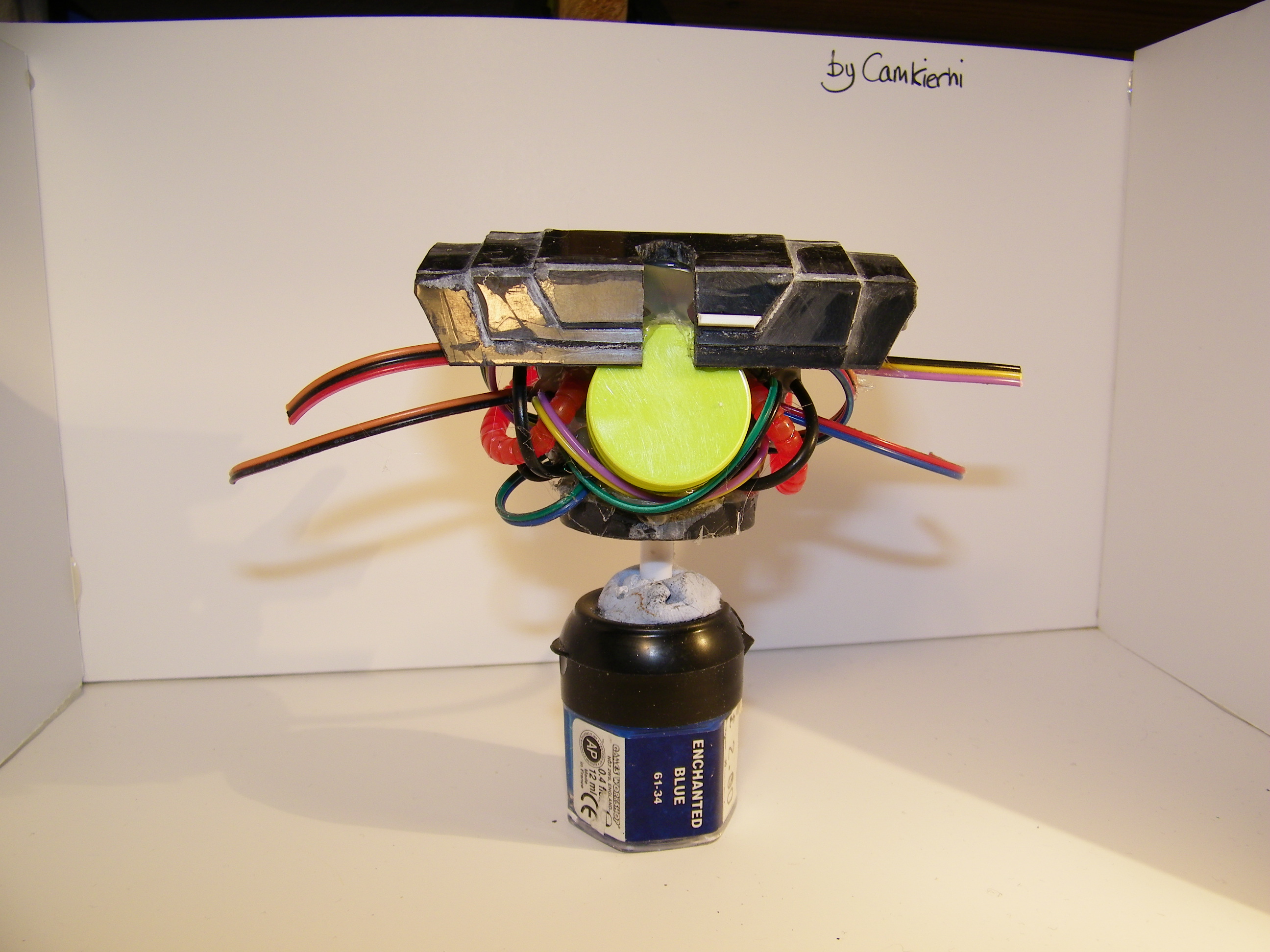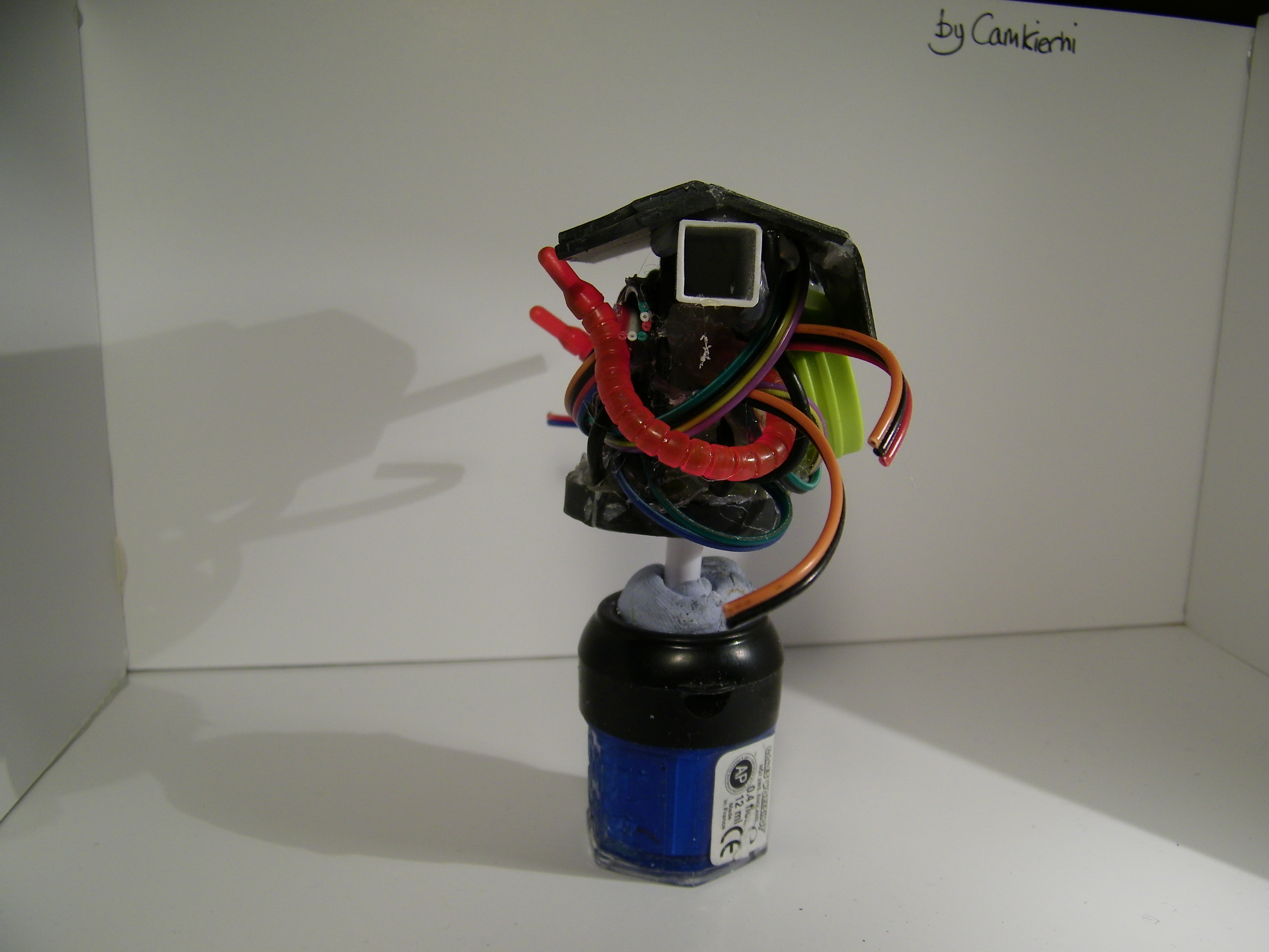 Next drill a hole in the BB to accommodate the copper wire which should be quite long. Put a blob of hot melt glue inside the 6mm tube and inset the wire through until the BB is set into position, fiddle with the glue best you can, it is going to be a pain, but it cleans up nice enough in the end. That's about it really. The wire coming out the back can be trailed off to be put into a box or somewhere else, The wire helps keep it all stuck together.