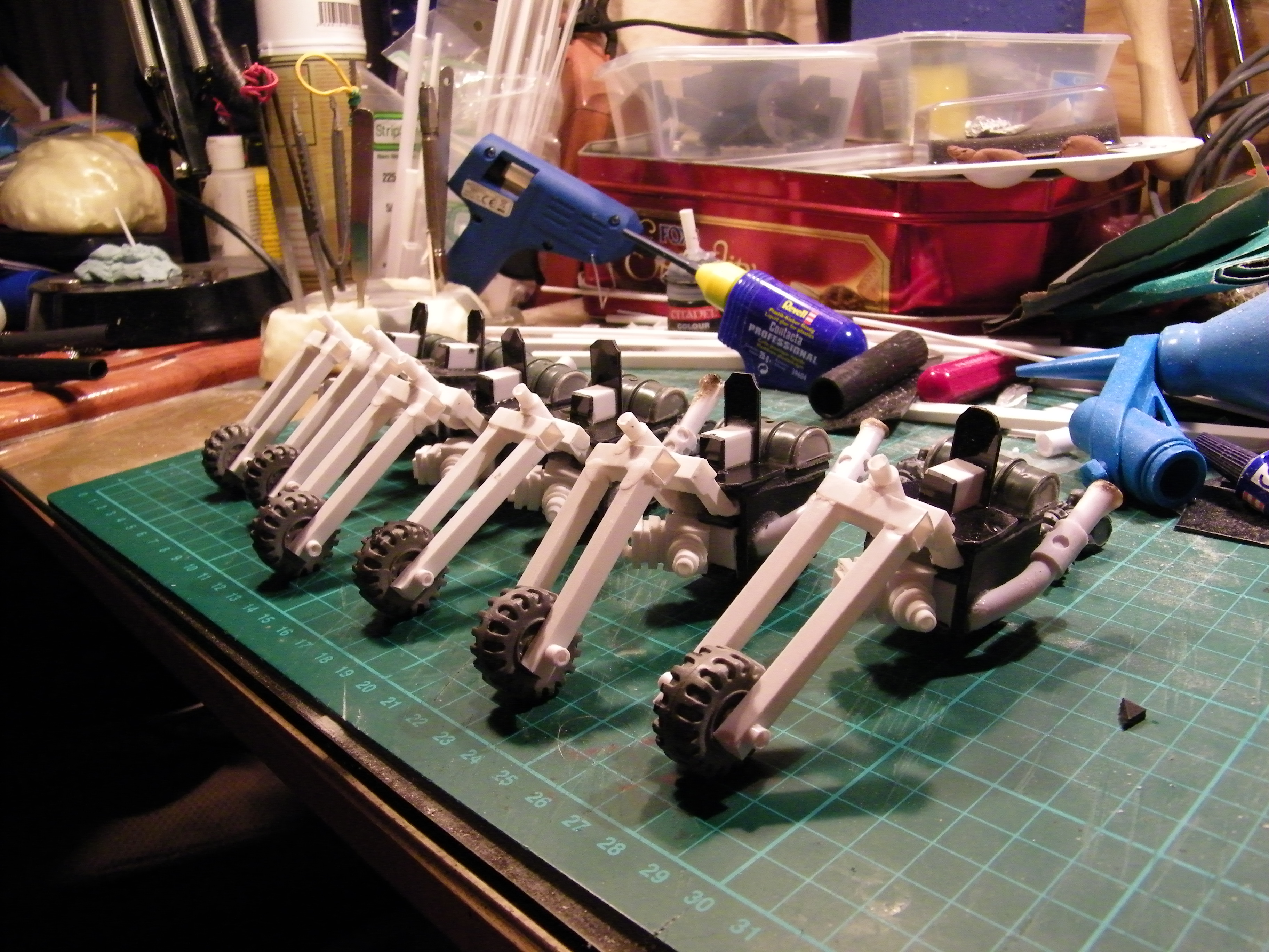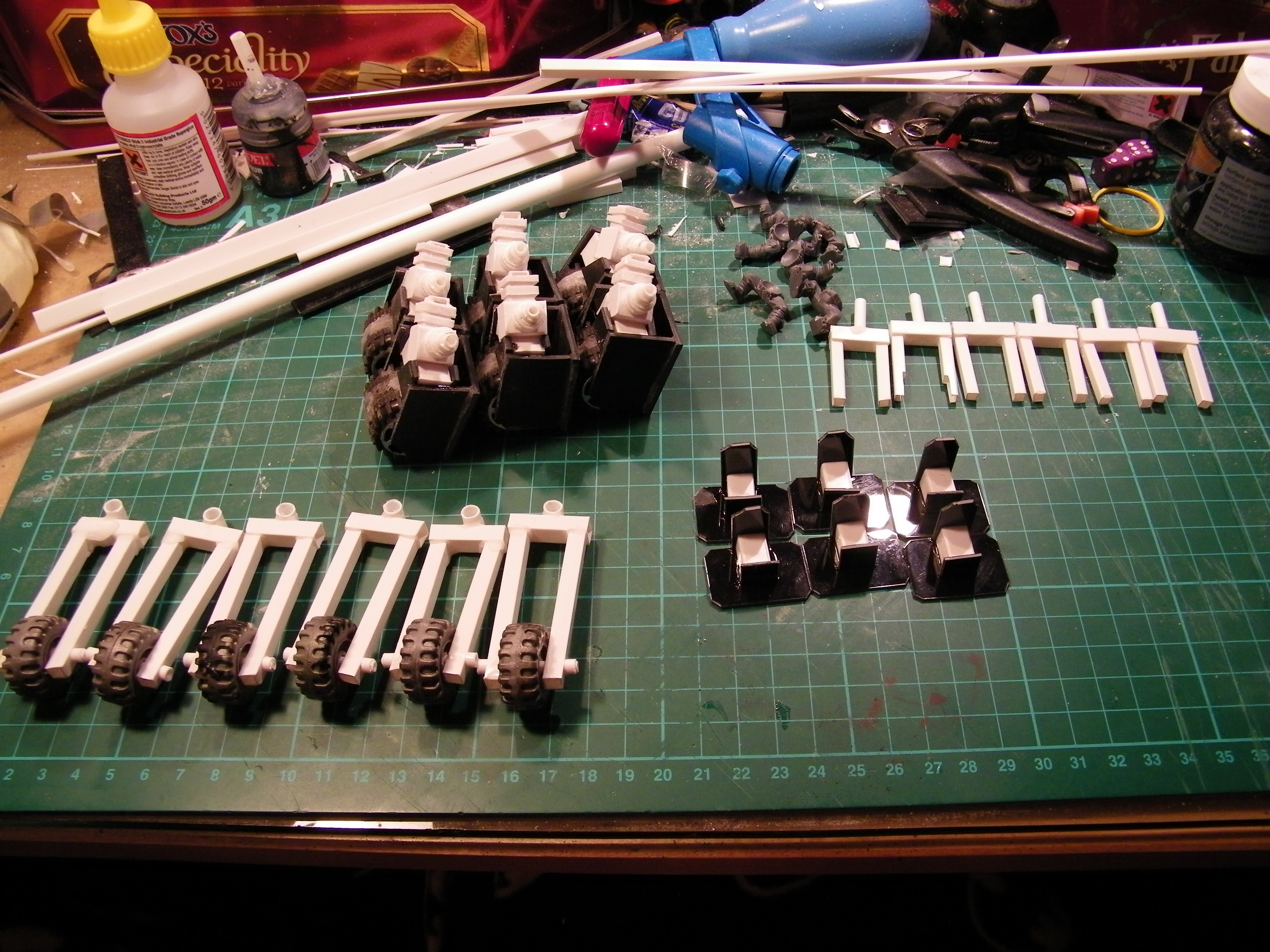 Sorry no pics at the mo, just back home. I will be working away very soon, and will be posting pics. I think the workshop needs more guns. And crew. Not sure but had an idea of netting going around the koptapad!