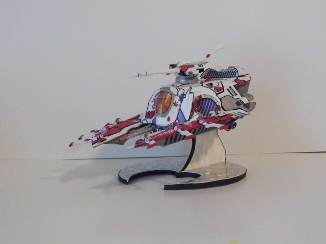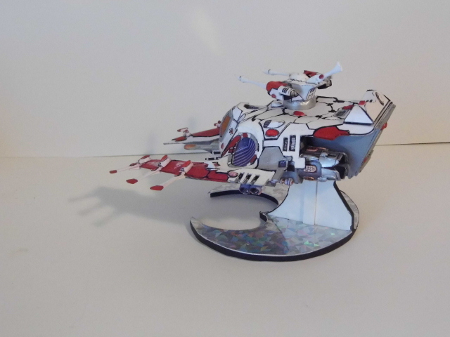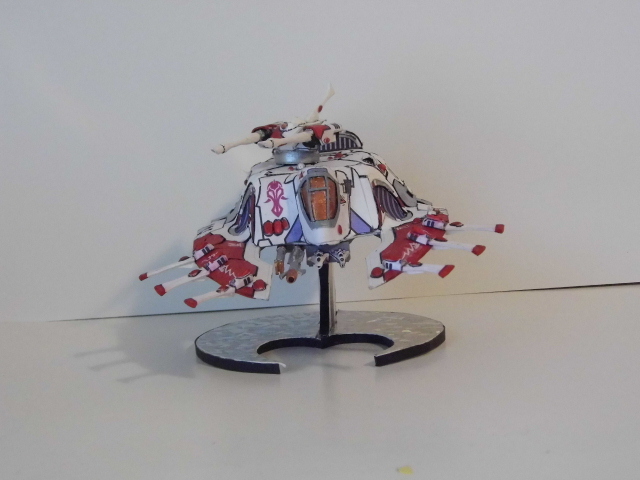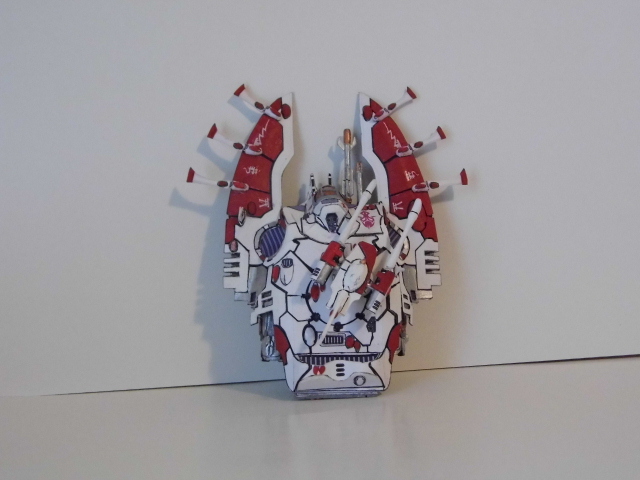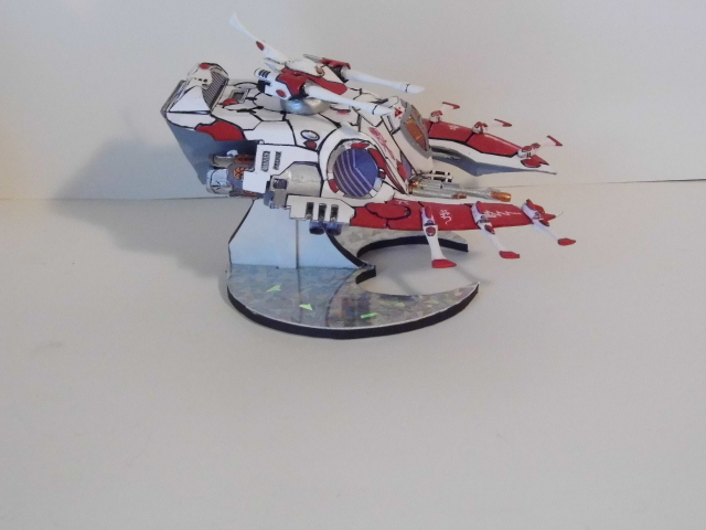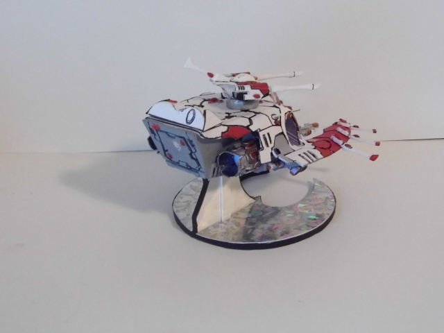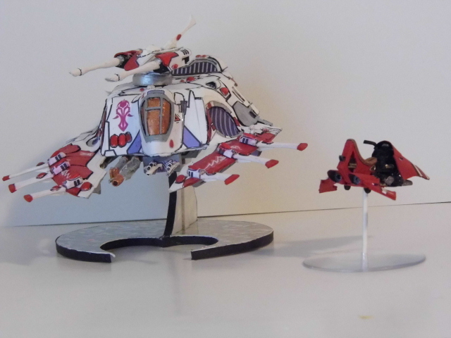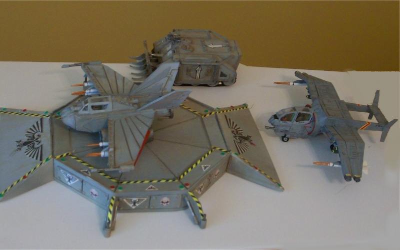 Here is the next batch of photos. These were made from templates found over at Zealot.com, with the exception of the Eldar Jet bike. The bike was a small challenge, in making the curvature of the frontal beaked hood. On the Tau flyer, it is made from paper but the compound curves were enhance by using wall spackling and smoothed to make the curves. In the Tau vehicle, I repainted it and did the markings free hand. On the Eldar jet bike, I used decals from the GW kit and some free hand. There is one more vehicle, skimmer to go, which I will post later after editing the photo. Again, all of these have a build thread here on how I made them. The Vulture is heavily modified paper model and is one of my early attempts at making Warhammer40K vehicles. Enjoy and see you all next posting.