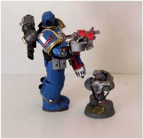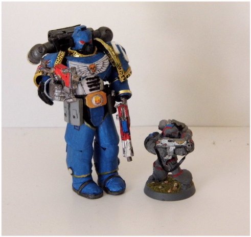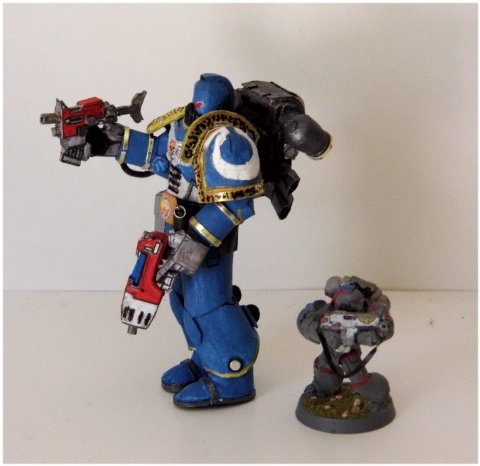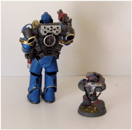 The beta build is done. I have to work on some details. the leg armor is still off and the helmet is too cylindrical. These are two items I have to work with. Over all, it came out better than expected and when the build begins, it will be on a separate thread. The model is about the same size that GW came out with and still has on special orders a while back. I believe that that series were called EPIC. I kind of like this size, not too small and not too large but leaves room for detailing. Here is a size comparison with the GW figure. See you all soon with more an my build thread.