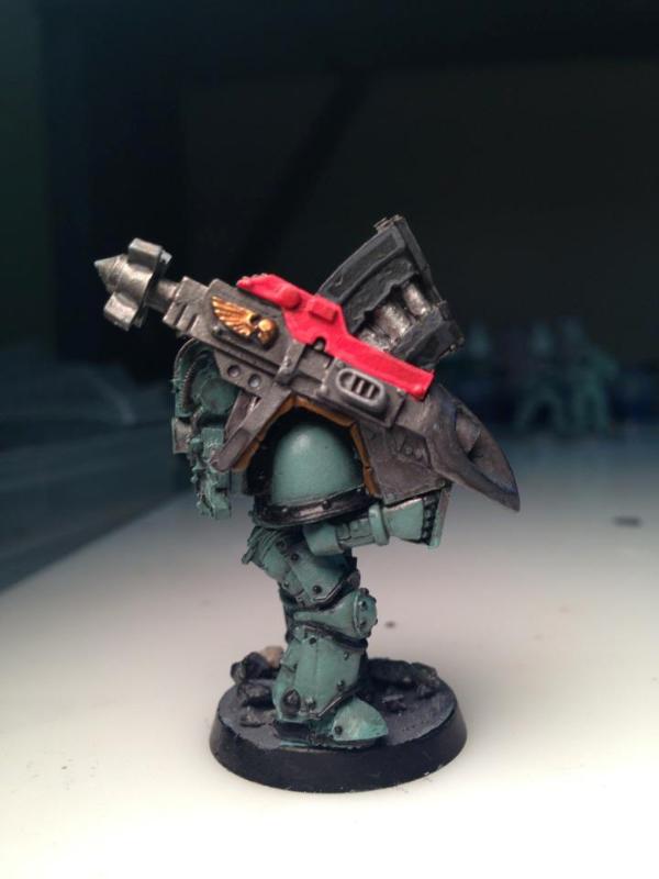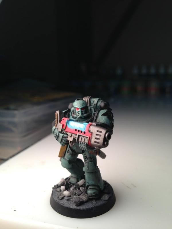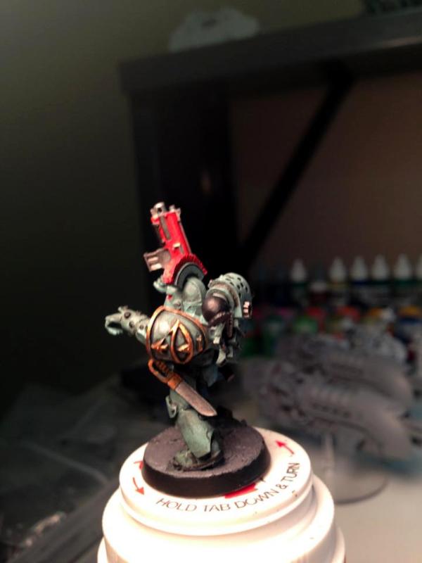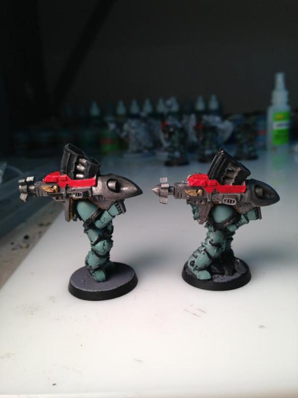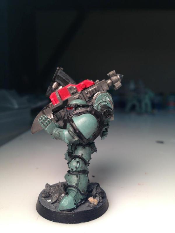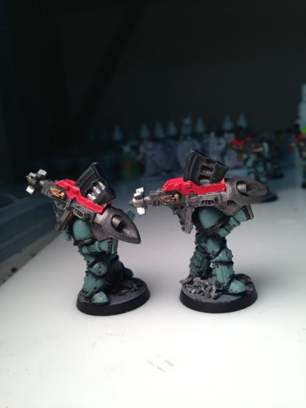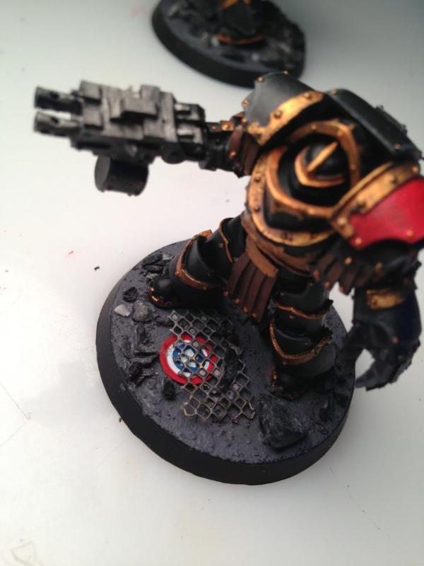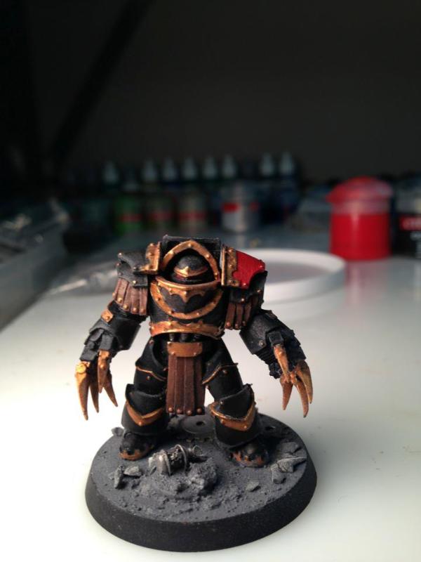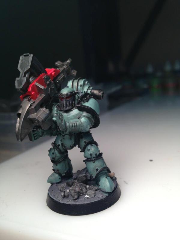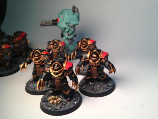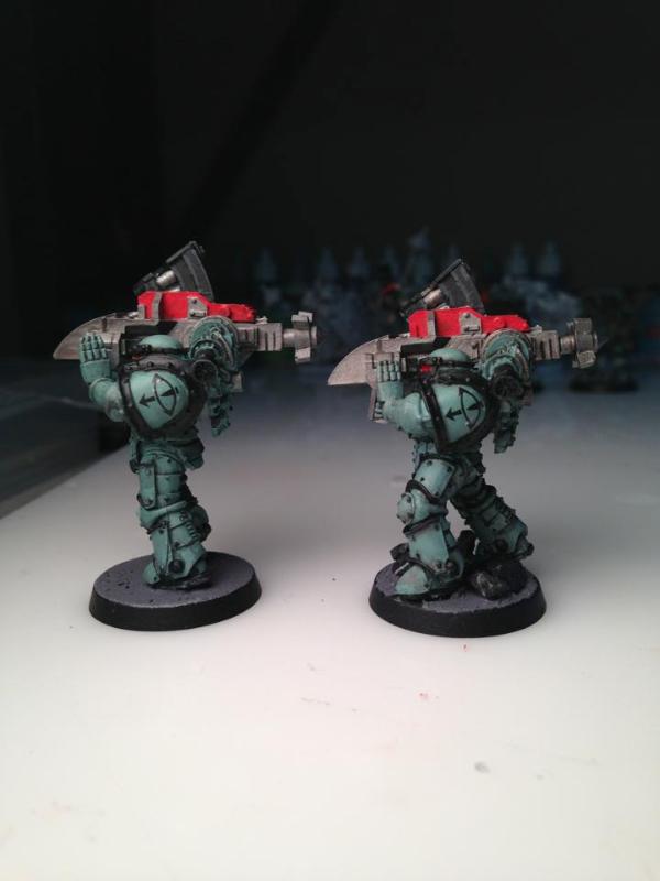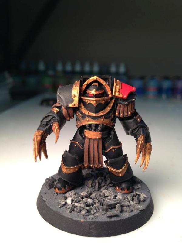 Hey mate, just a heads-up, the Justaerin also had mixes of red on their shoulder pad insets. Maybe splash them up with a bit of red too? Just as a little hint as well, the Justaerin was just the name given over to the Terminators of the 1st, the 1st being led by First-Captain Abaddon. I would think of Kibre being a lieutenant of Abaddon in charge of the Justaerin. Any chance on you doing some Catulan Reavers? Also, you see those new Justaerin termies on FW? They may be of use to you.