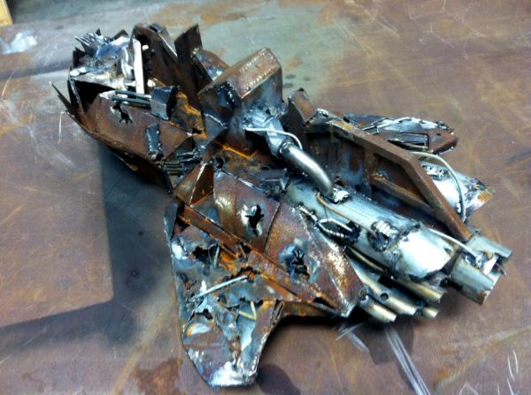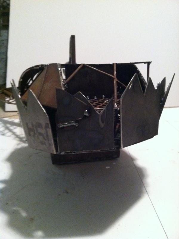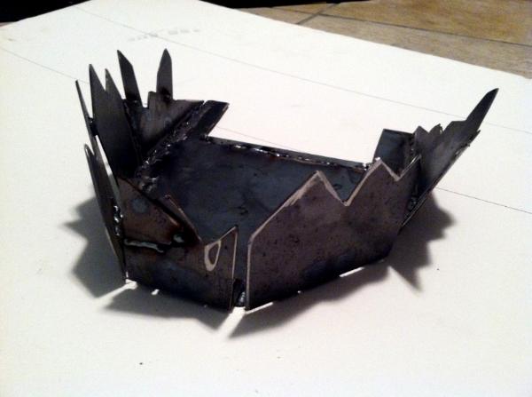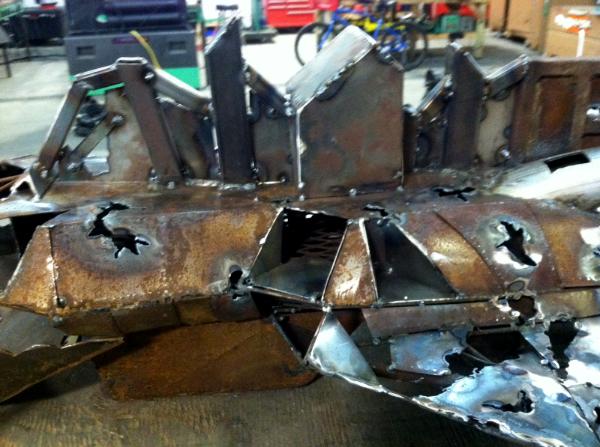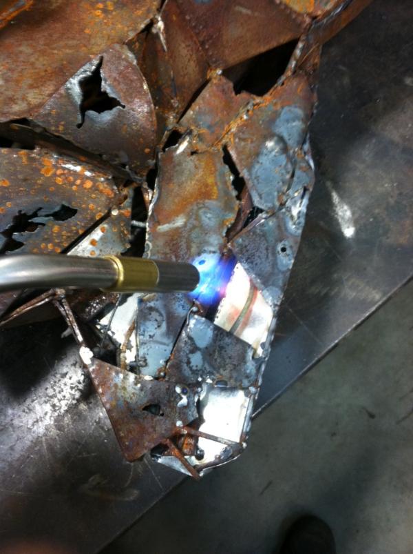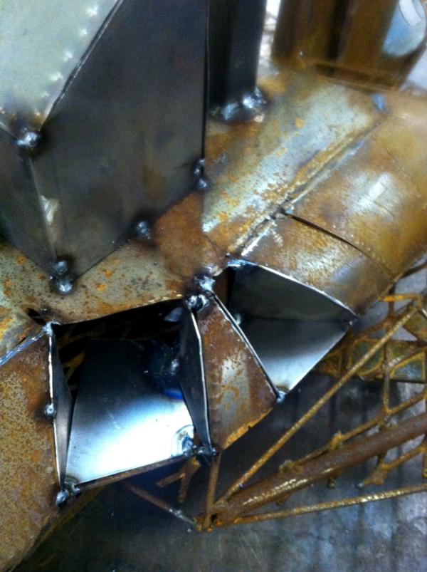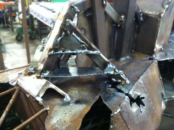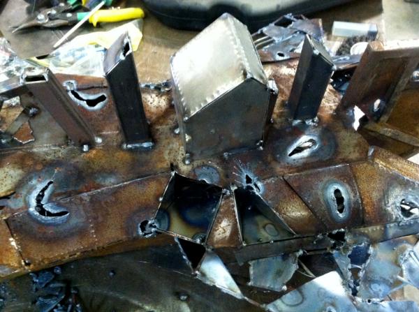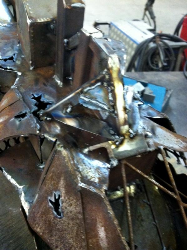 Next, I tack braces onto the bottom section. I also wound up using the plasma cutter for a new top section, the one I gas-axed and beat into shape wont work without a level support. I like the shape of the original, I just need a base for it.