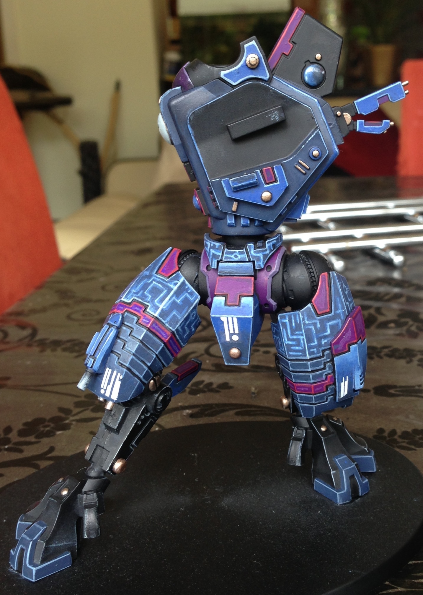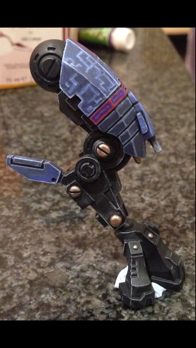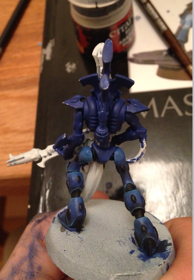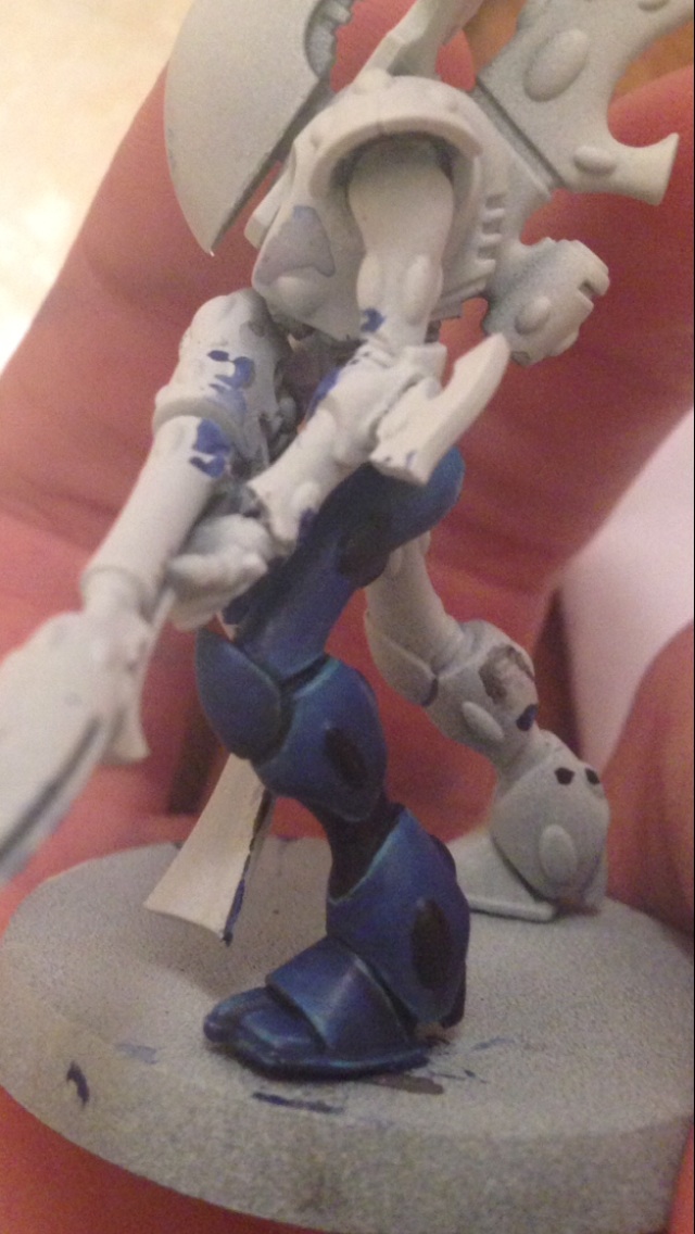 Second leg mostly done, blue added to the foot of the other leg too since I though the black needed breaking up a bit. I also neatened up the grey Drybrush by going back over with a layer in black apart from not he edges.