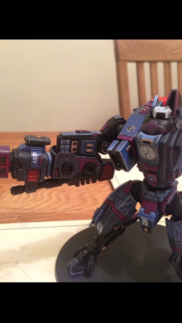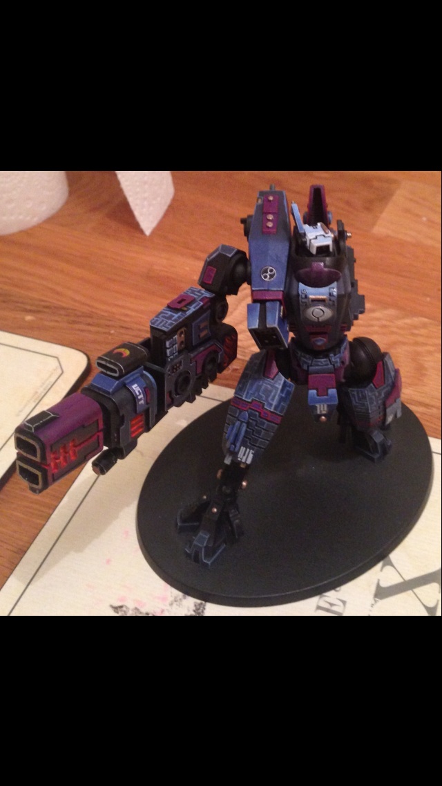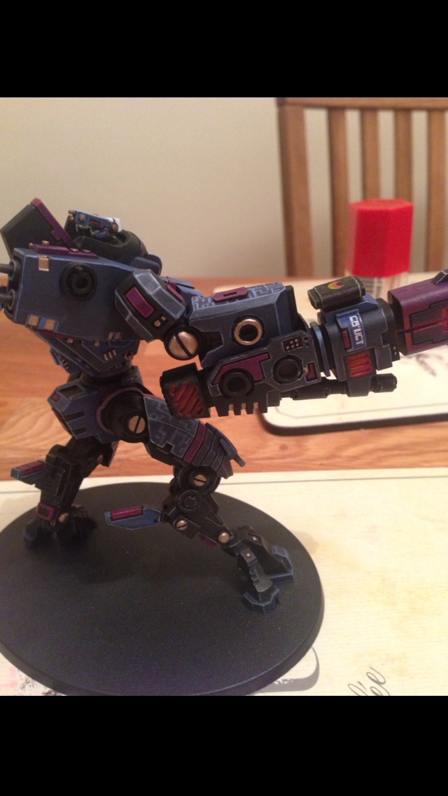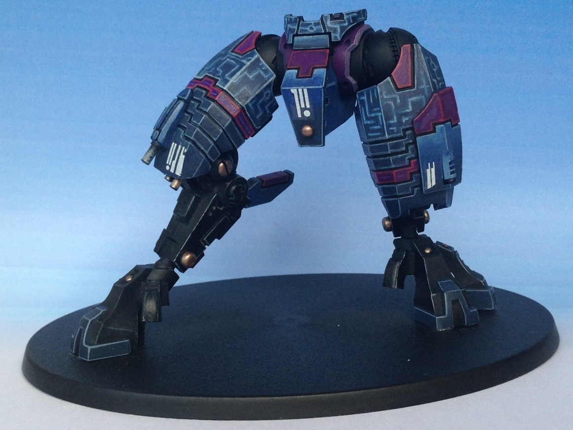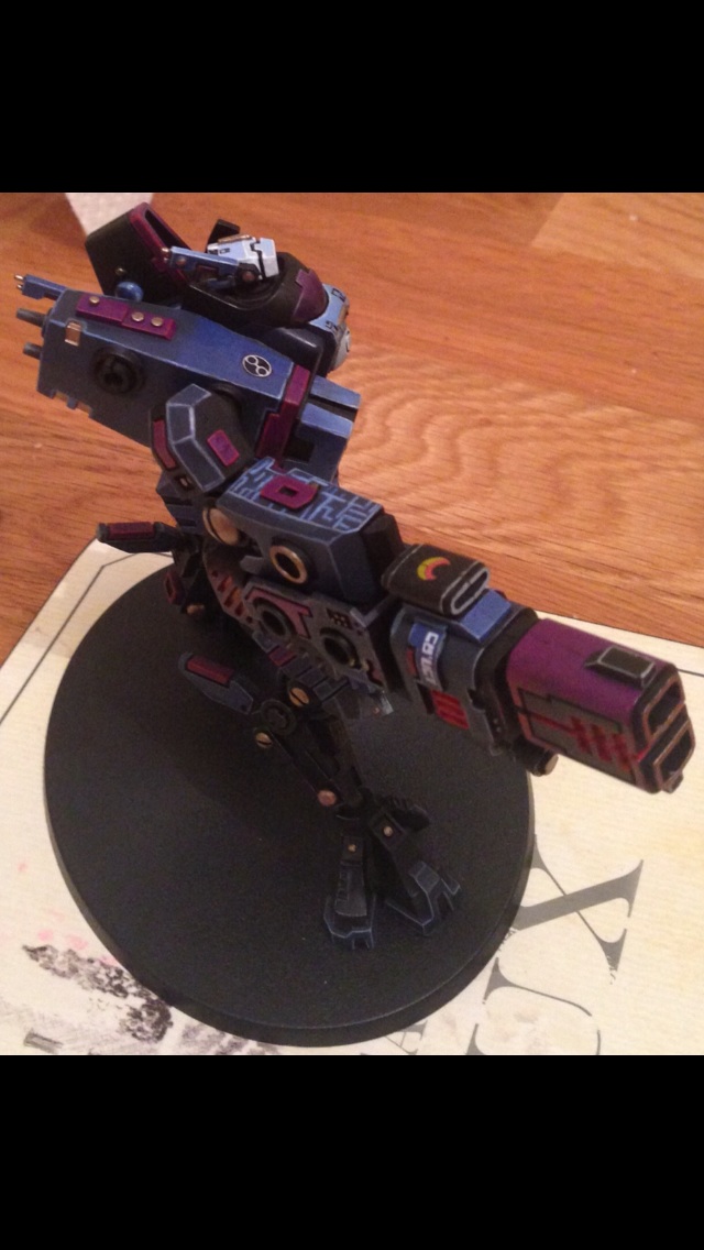 First off, I must say I love the choice of colours. Fantastic painting for your first commission. I have always had a soft spot for the 'little blue buggers (aka Tau)' but I honestly can't stand GW anymore and don't want to give them any of my money. But I still do like looking at their models and stuff, and the riptide is a rather nice model.