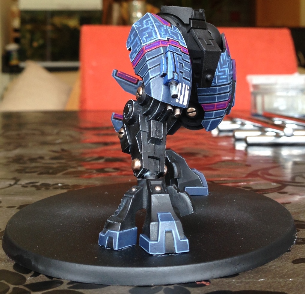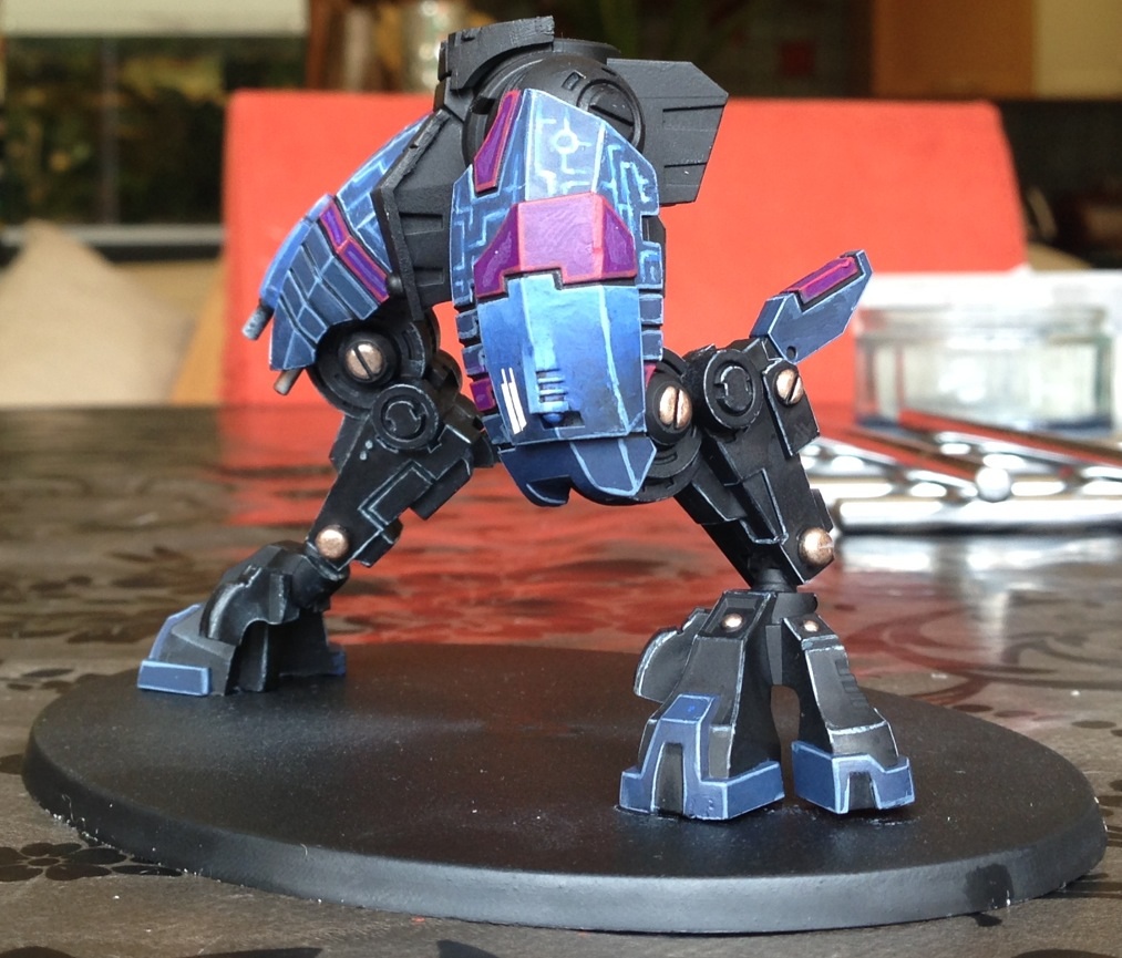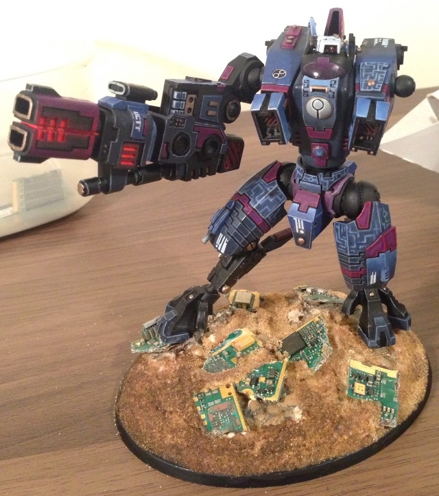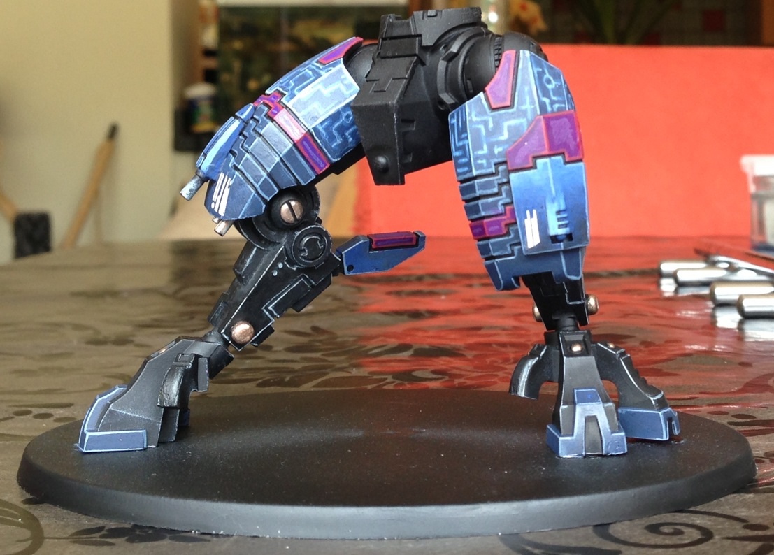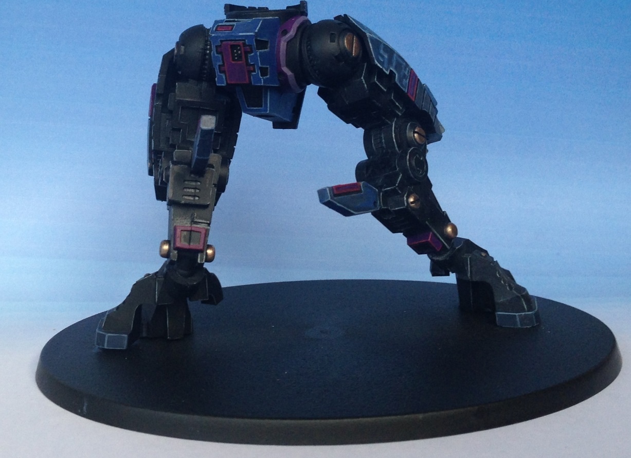 First off, I must say I love the choice of colours. Fantastic painting for your first commission. I have always had a soft spot for the 'little blue buggers (aka Tau)' but I honestly can't stand GW anymore and don't want to give them any of my money. But I still do like looking at their models and stuff, and the riptide is a rather nice model.