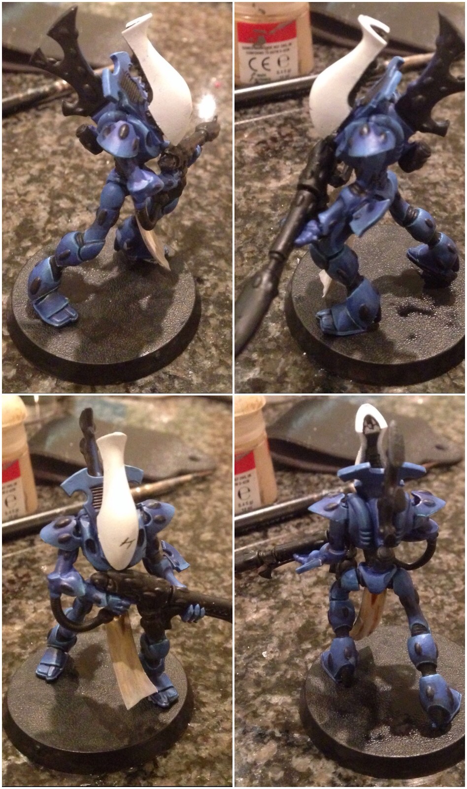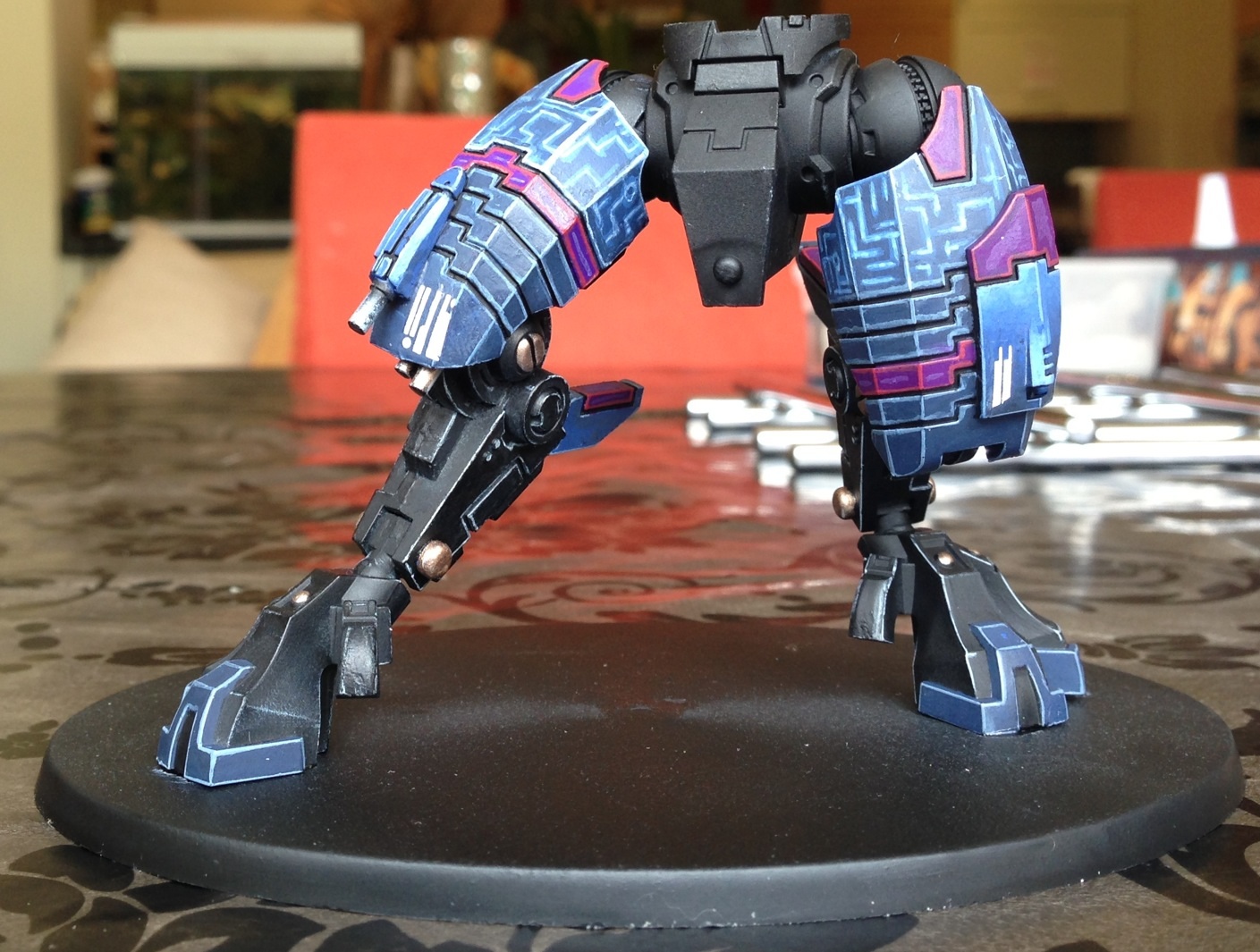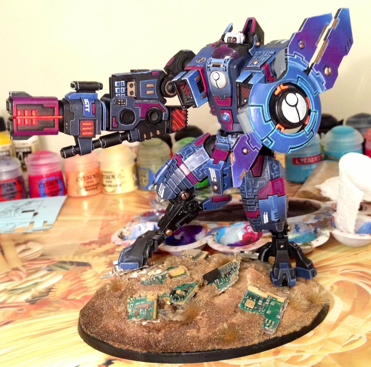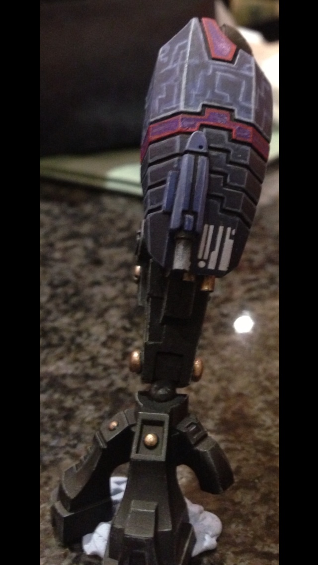 First off, I must say I love the choice of colours. Fantastic painting for your first commission. I have always had a soft spot for the 'little blue buggers (aka Tau)' but I honestly can't stand GW anymore and don't want to give them any of my money. But I still do like looking at their models and stuff, and the riptide is a rather nice model.