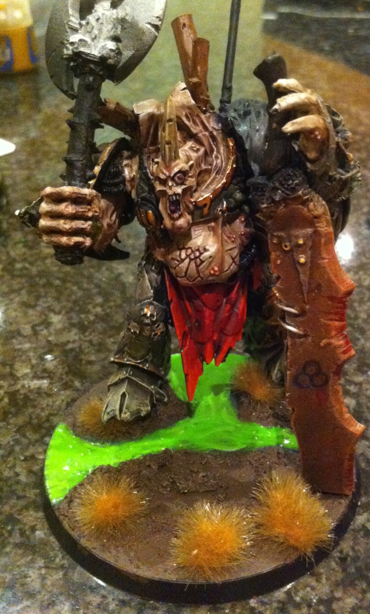 Well the models done except for small corrections, just the base now, I wanted to do a sort of swamp effect but since GW discontinued water effects and Golden Daemon is GW products only I'm a bit stuck.
