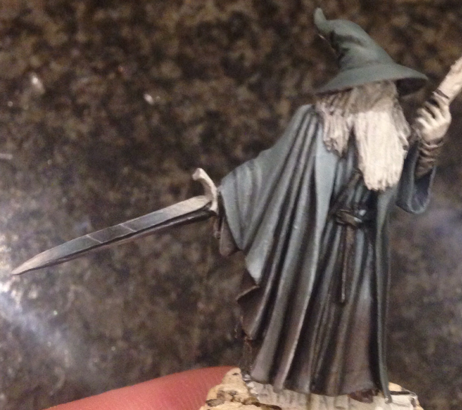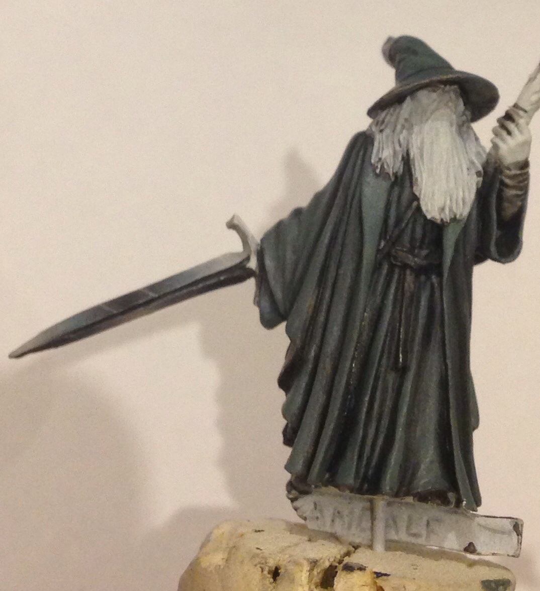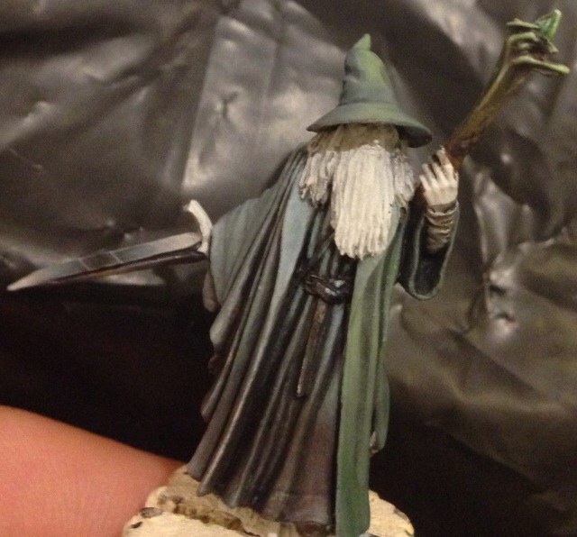 After reading a list about brittle finecast snapping and thinking I'm glad that never happened to me, moments later Gandalf's staff painted to look like wood broke off and became unfindable on the wooden floor. So it's a shame but bellow is as far as the model got until I find a replacement staff.