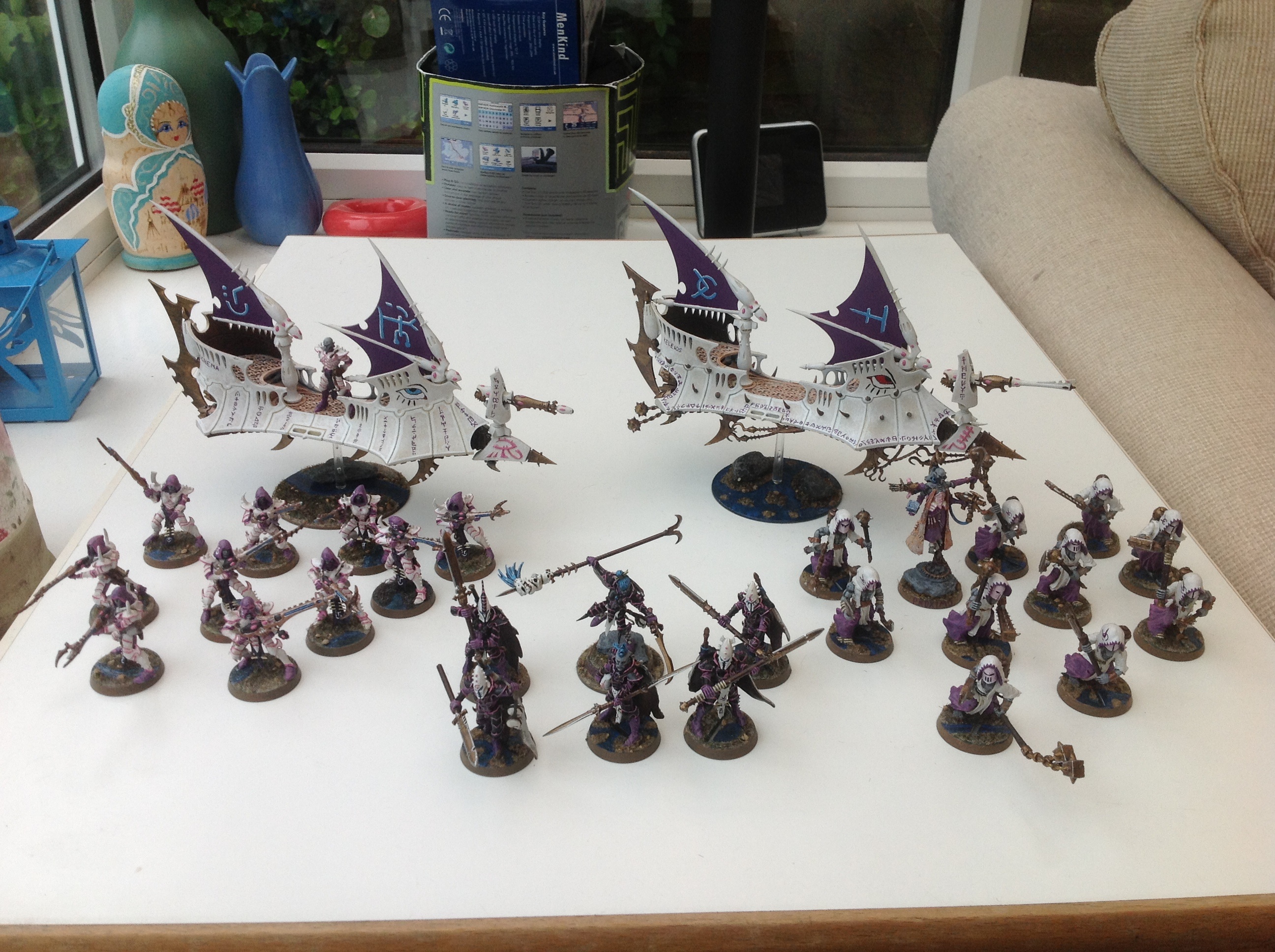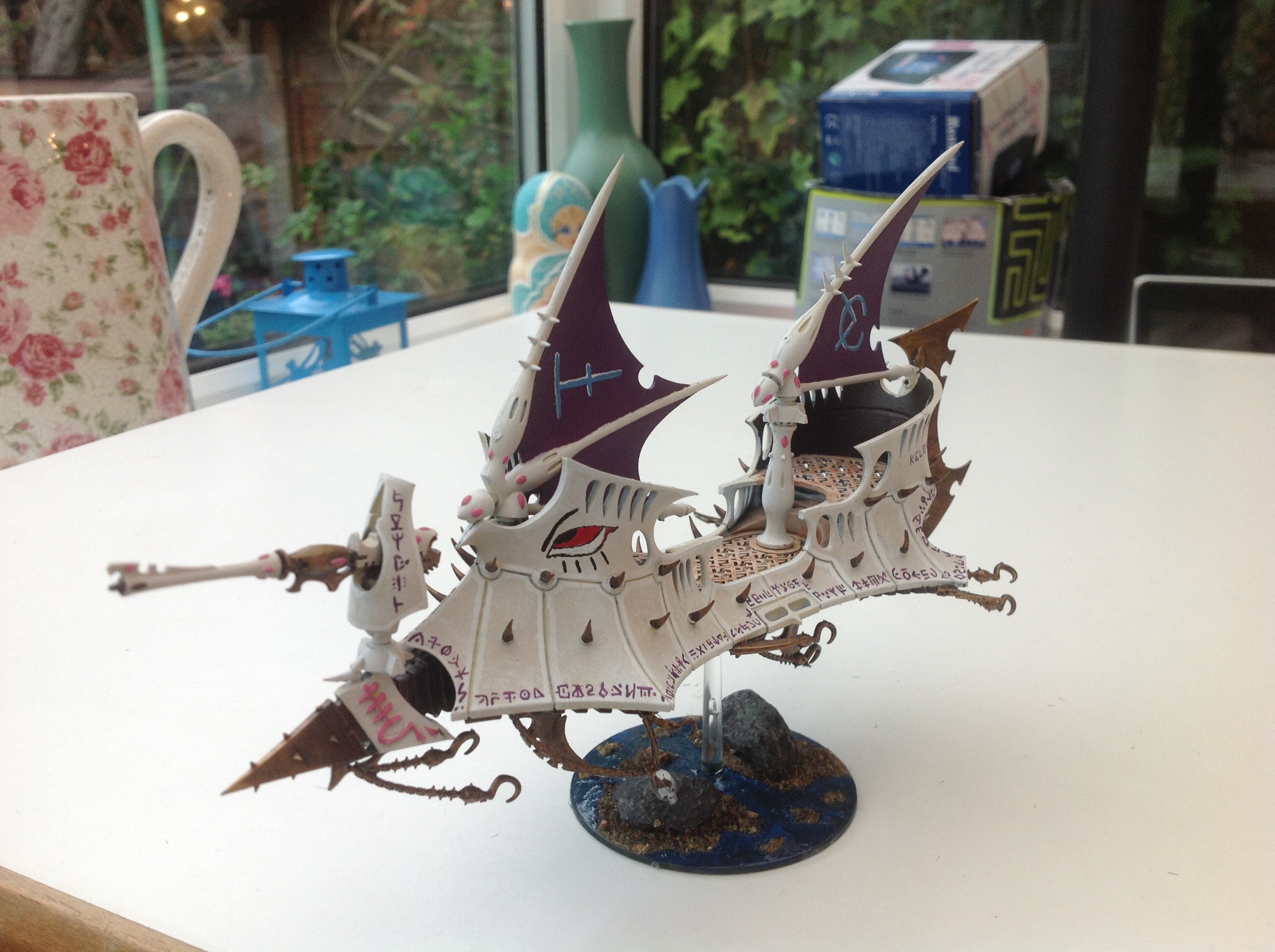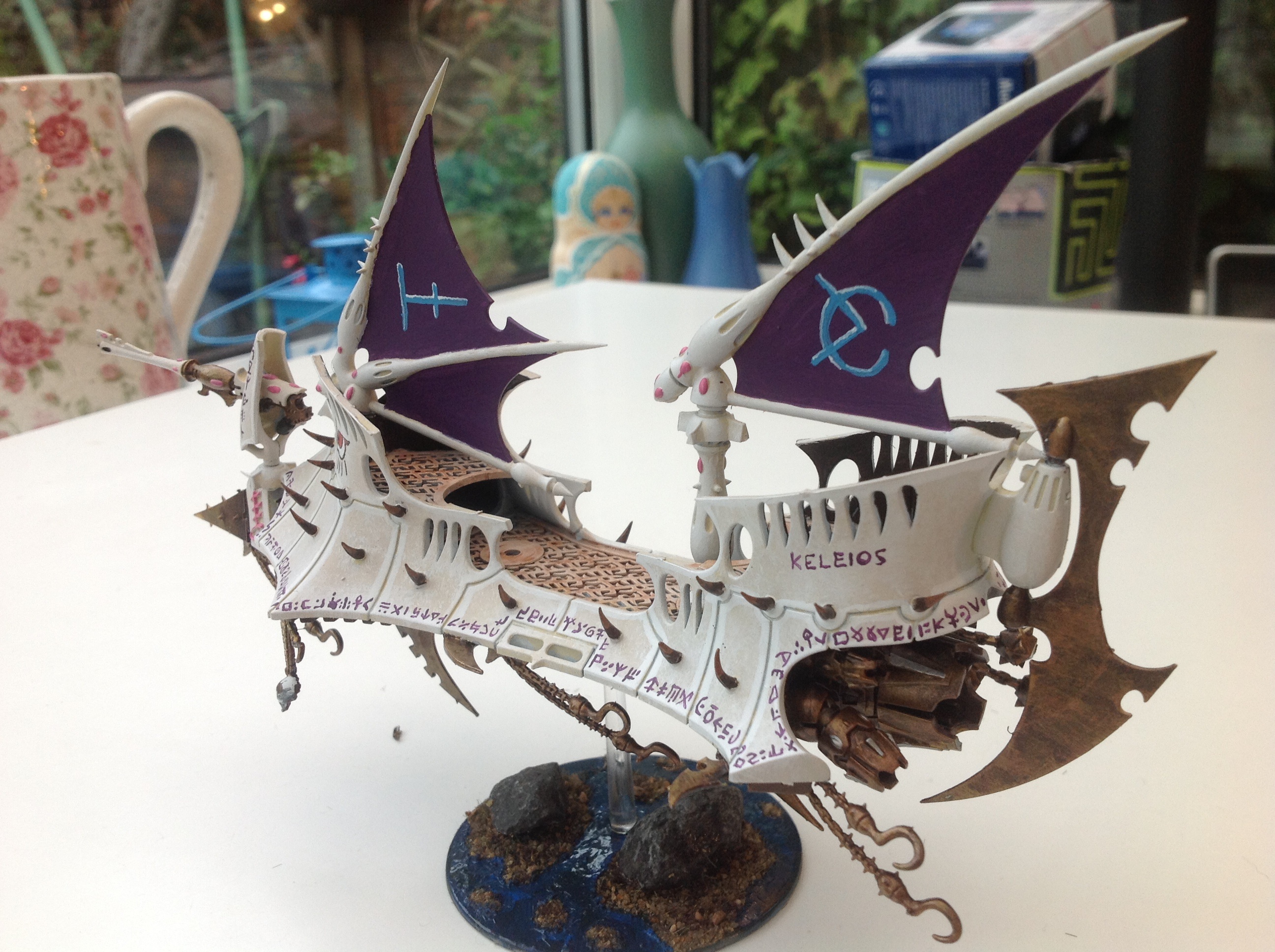 Ravager- by the beard of Zeus, the Ravager was an incredible pain to assemble and paint. The sponson gunners had to be assembled and painted separately to the main craft, then glued back in place. I also had previously added some under-sails to the rear sections, but after painting I changed my mind, tore them off and had to repair the damage :/ happier with the overall look now though. To maintain my dual sail theme, as well has having a front mounted dark lance, the sails had to be squashed up a bit closer. The triple DL Ravager is a must for my list- manoeuvrable anti-tank platform, with a 5++ save and reducing enemy range by 6"? Yes please.