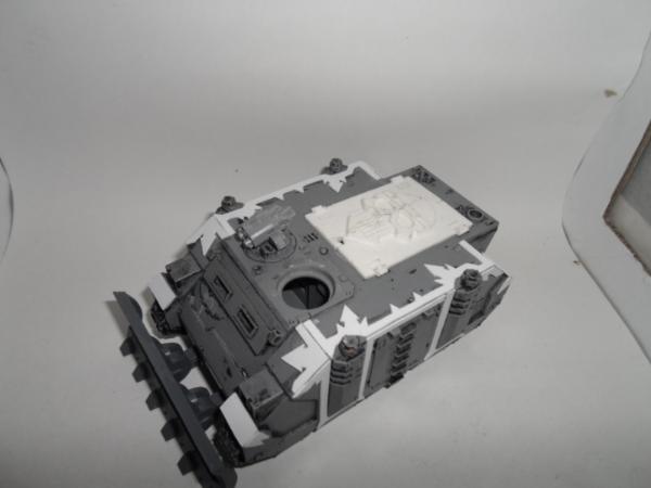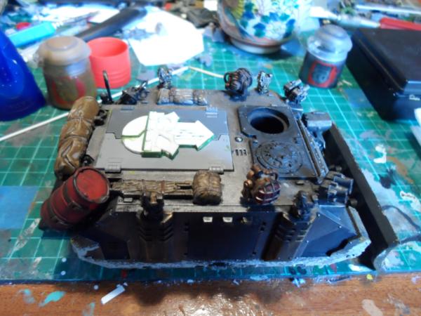 Made an Iron Warriors top hatch for my rhinos out of plasticard, which I'll cast a bunch of to retro fit all my Rhinos.