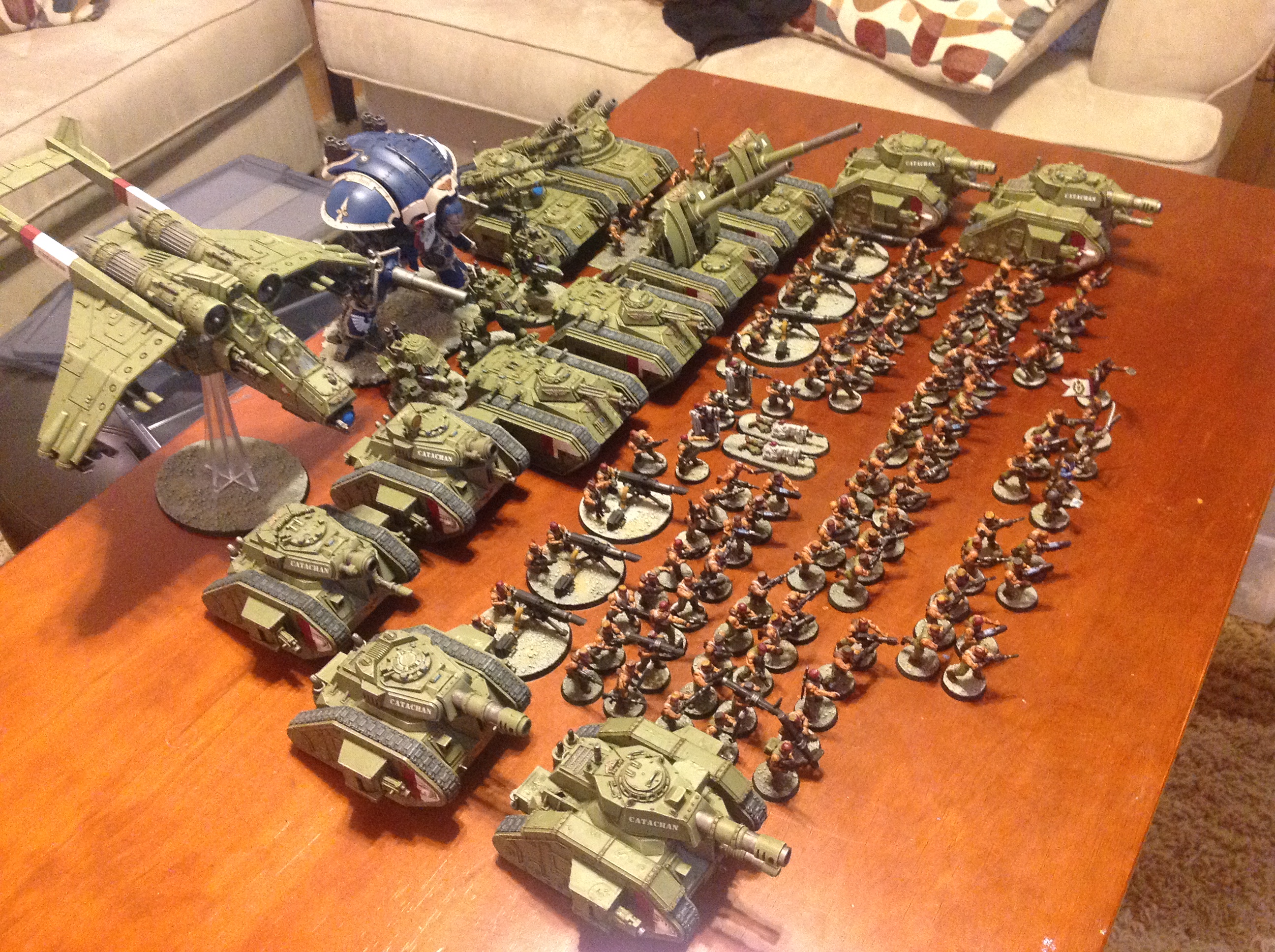 I got a pretty healthy supply drop. A new hydra, 2 Leman Russ, and a Catachan Battleforce. Also have some sniper bits. Going to make 3 snipers and 3 spotters. They can "count as" ratlings. The actual models creep me out. Also decided to do all vet squads. I always build the same boring army so this one will be different. Also way low on infantry, I figure this one will be 75-80. I usually do well over 100.